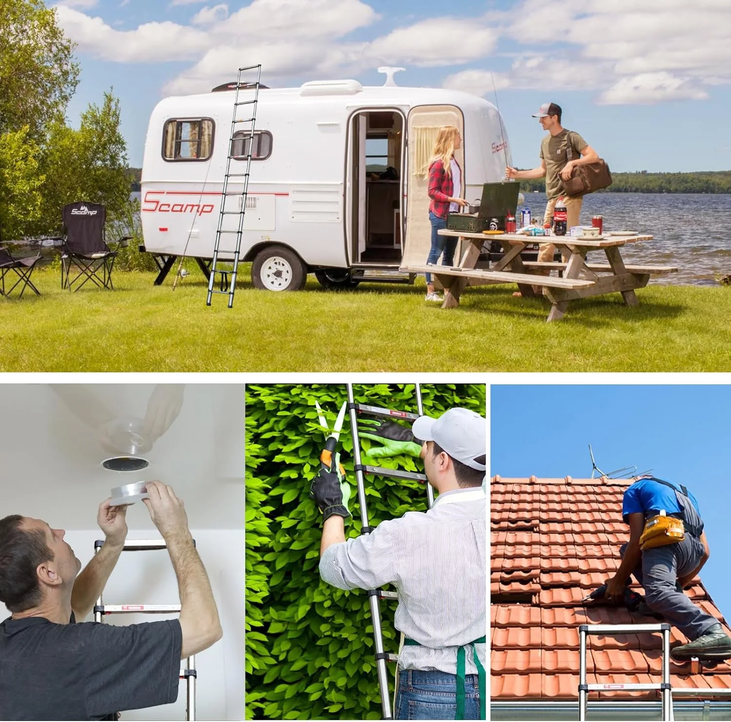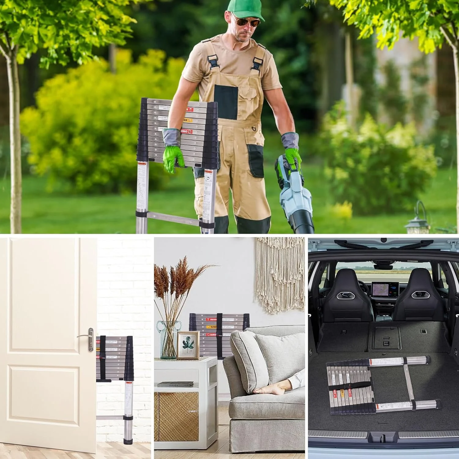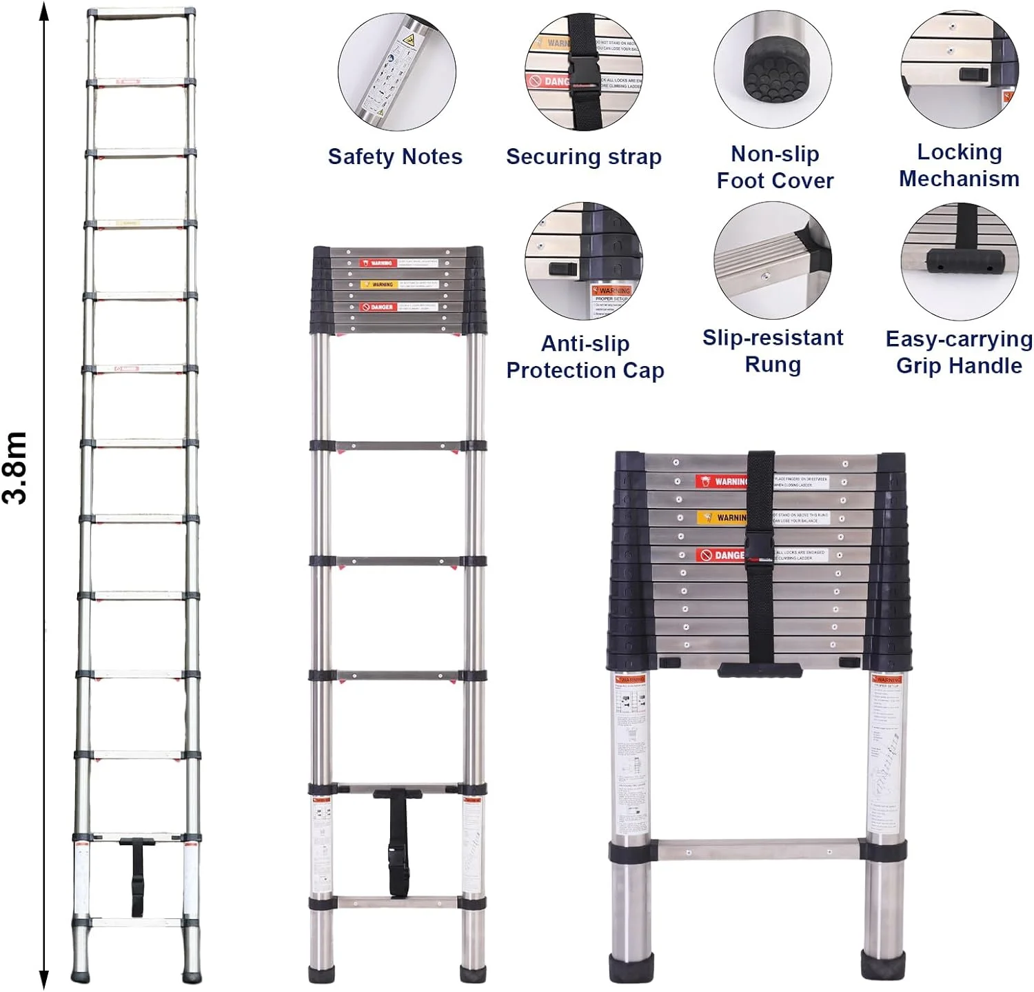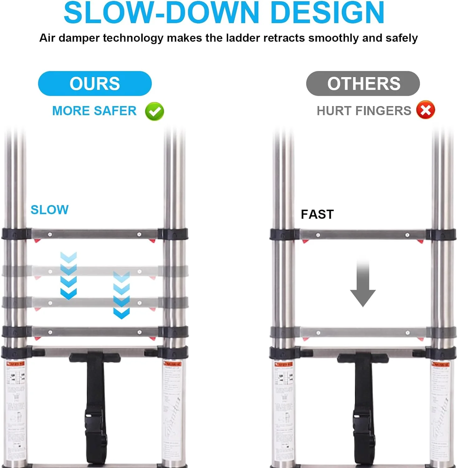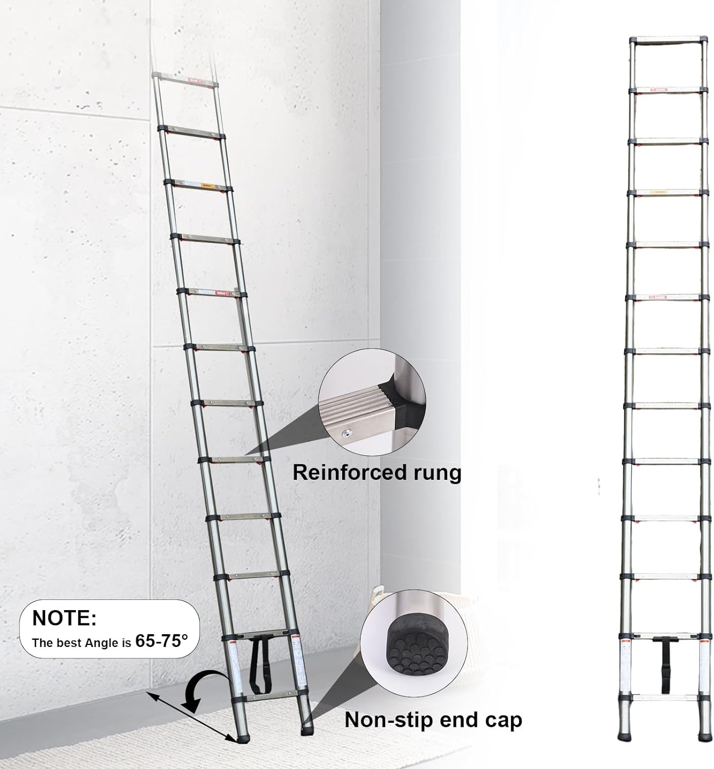 ☆ One Button Shrinkage:When you need to recover the ladder, just gently press the bottom lock key and the ladder will slowly descend one step at a time. Compared with the traditional ladder, it not only saves your time but also reduces the possibility of clamping hands, which greatly improves the safety ☆ One Button Shrinkage:When you need to recover the ladder, just gently press the bottom lock key and the ladder will slowly descend one step at a time. Compared with the traditional ladder, it not only saves your time but also reduces the possibility of clamping hands, which greatly improves the safety ☆Stainless Steel Ladders:This telescopic ladder is made of heavy-duty stainless steel,extend the service life of the folding ladder which has better bearing capacity, is stronger and wear-resistant, and there is no need to worry about the ladder bending and shaking, which is safer to climb up.The maximum load capacity of the telescopic ladder is 330 pounds. ☆Stainless Steel Ladders:This telescopic ladder is made of heavy-duty stainless steel,extend the service life of the folding ladder which has better bearing capacity, is stronger and wear-resistant, and there is no need to worry about the ladder bending and shaking, which is safer to climb up.The maximum load capacity of the telescopic ladder is 330 pounds. ☆ Lock design: Each section of the extension ladder is equipped with a locking and opening mechanism so that it can be better opened and closed, no matter how far you want to expand it, you can easily do so. When you need to recover the ladder, remember that you must not slide the two locks directly with two hands. You need to hold the upper pipe with one hand and slide the two locks with the other hand This way the ladder can be safely retrieved. ☆ Lock design: Each section of the extension ladder is equipped with a locking and opening mechanism so that it can be better opened and closed, no matter how far you want to expand it, you can easily do so. When you need to recover the ladder, remember that you must not slide the two locks directly with two hands. You need to hold the upper pipe with one hand and slide the two locks with the other hand This way the ladder can be safely retrieved. ☆ Easy storage :This 12.5FT one button telescoping ladder is very easy to carry. And you can put it anywhere, including behind doors, under the bed, and in the trunk of your car. It’s more portable and takes up less space than traditional ladders. ☆ Easy storage :This 12.5FT one button telescoping ladder is very easy to carry. And you can put it anywhere, including behind doors, under the bed, and in the trunk of your car. It’s more portable and takes up less space than traditional ladders. ☆ Wide range of applications : whether you are decorating or outdoor activities, this ladder can meet you, such as changing light bulbs, garden work, fetching items from the roof, painting walls and so on.Place the ladder at a 75-degree Angle to the floor. ☆ Wide range of applications : whether you are decorating or outdoor activities, this ladder can meet you, such as changing light bulbs, garden work, fetching items from the roof, painting walls and so on.Place the ladder at a 75-degree Angle to the floor.