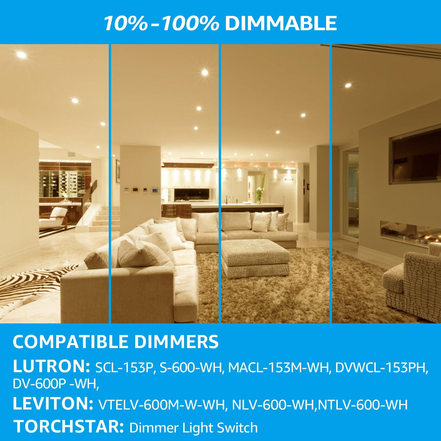 Easy to Install Installation is done in seconds. Simply connect the provided junction box to the light using male/female wires and then mount it to the ceiling using spring clips. Features a more standard, sleeker backplate for easier installation. IC rated and airtight for direct access to older home insulation 5CCT Adjustable Color Temperature This lamp can be adjusted to a minimum color temperature of 2700K to emit a soft and warm glow, neither harsh nor flickering; reduce your stress and promote sleep, is the best choice for bedroom lighting. 10-100% Dimmable This light is 10%-100% dimmable and compatible with most LED dimmers on the market, making it the perfect choice for lighting up a conference room. This led recessed light is suitable for wet location, such as living room, dining room, hallway, closet basement, kitchen, workplace, eaves and other places Dimmer Compatible Compatible with LUTRON: DVCL-153PR-WH, CTCL-153PDH-WH, TGCL-153PH-WH, MACL-153MH-WH, P-PKG1W-WH-R; Compatible with LEVITON: R62-06674-P0W, R12-06672-1LW, R50-IPL06-10M; Compatible with EATON: SAL06P-LA-K Warranty The 4 inch slim recessed light is ETL and ES certified, T24 certified to ensure reliable quality. A 3-year warranty is included and TORCHSTAR’s professional customer service team is at your service Specifications Wattage: 10.5W Equivalent: 50W incandescent lamp Voltage: 120V Lifespan: 50000hrs CCT: 2700K/3000K/3500K/4000K/5000K selectable Material: PS Finish color: White Waterproof rating: Wet location Warranty: 3 years