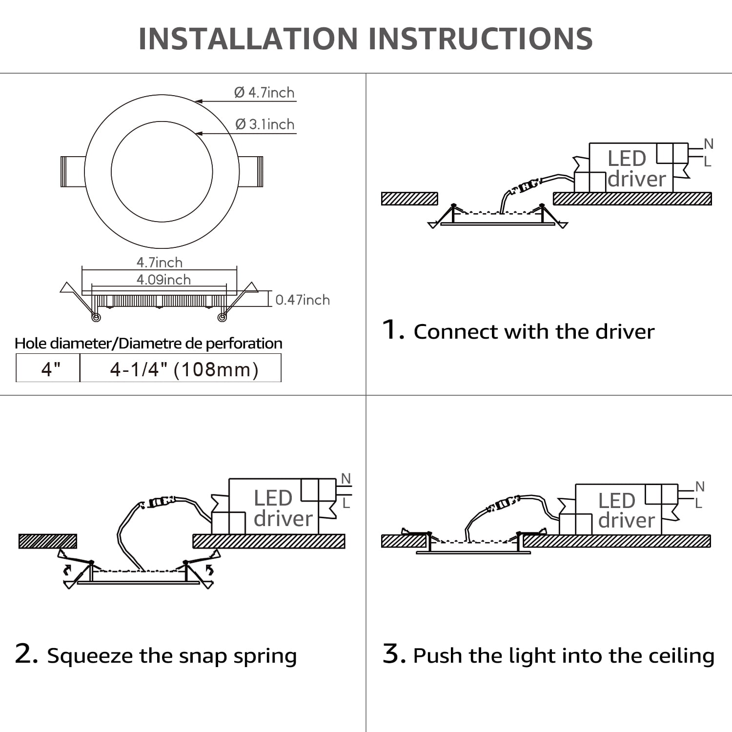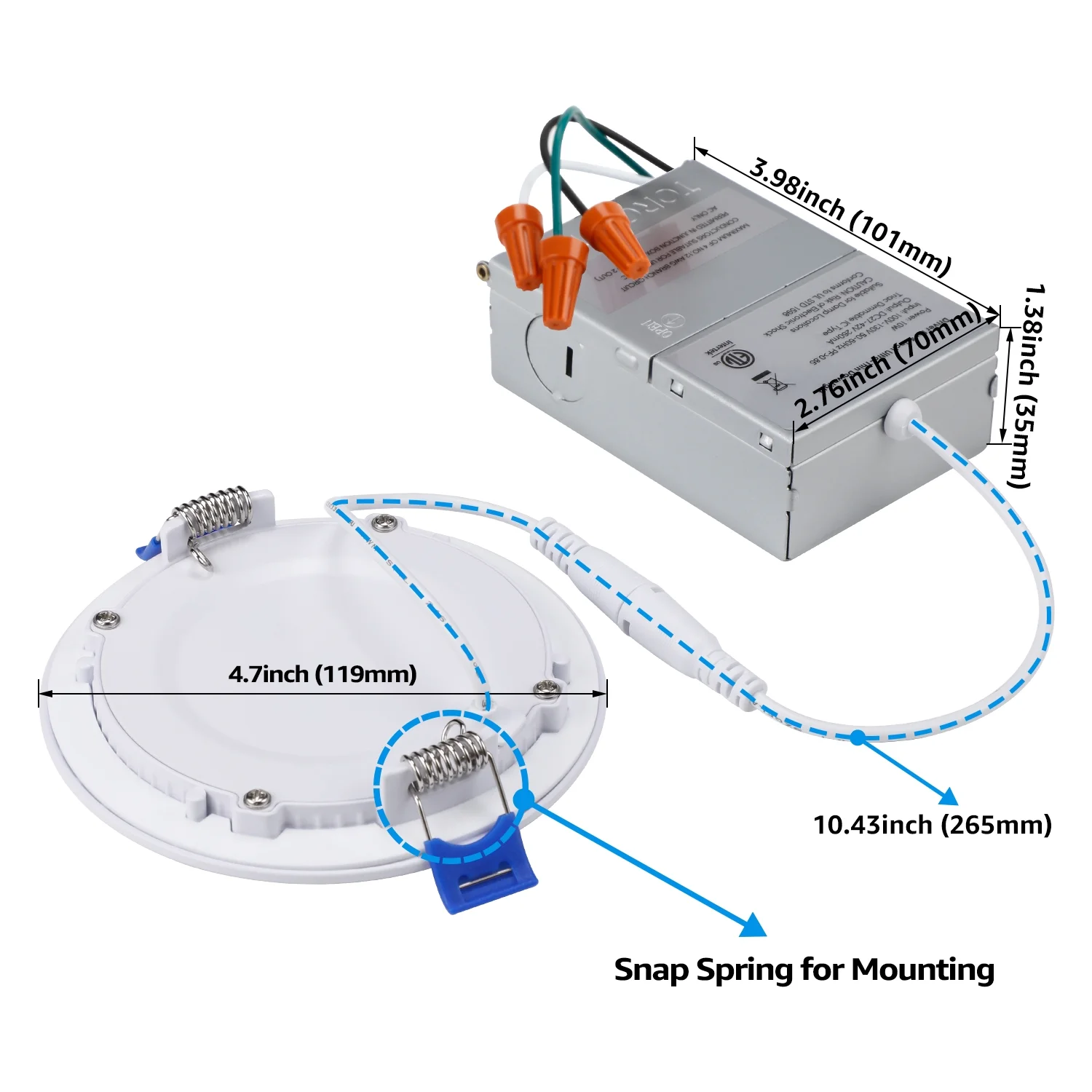 New Design This recessed ultra-thin panel LED downlight is perfect for ceilings that are too narrow to fit standard LED flat-top lights or narrow ceilings that are not suitable for housing cans. With only a 2″ clearance required, this bright light supports remodeling or new building fixtures. Dimmable& Easy to Use Easy installation is done by simply connecting the j-box to the light using male/female cables and mounting it to the ceiling using spring clips. IC rating ensures insulation and avoids accidental fire. Compatible with most dimmers on the market, this slim LED downlight dims 100%-5% smooth dimming, you can adjust the brightness yourself according to your needs and preferences, perfect for doorways, hallways, closets, basements, kitchens and more. Note The spring clips can fix the light onto a max 0.59inch thick ceiling. Specification: Wattage: 10W Voltage: 100-130V CRI: >80 Luminous flux: 700lm CCT: 3000K warm white Dimming range: 5%-100% Waterproof rating: damp location Lifespan: 54,000hrs Material: Aluminum & PC