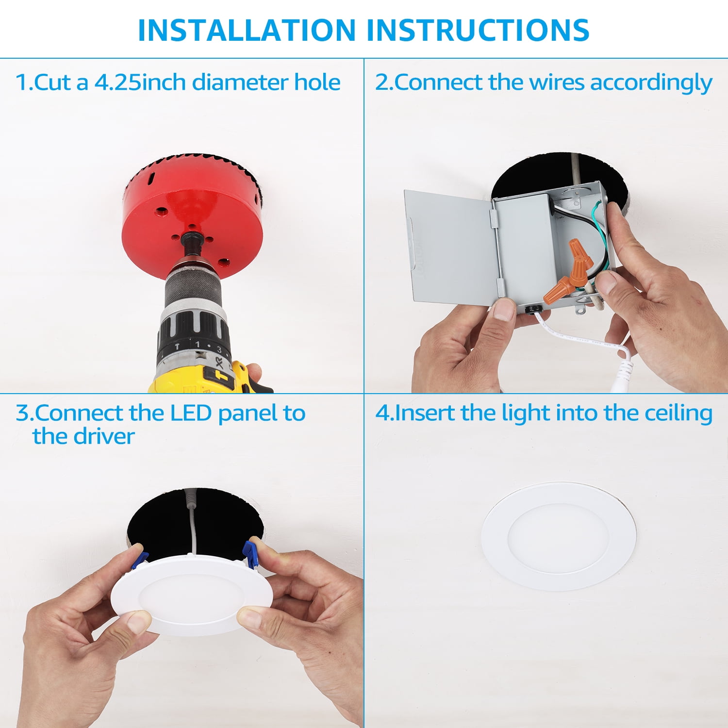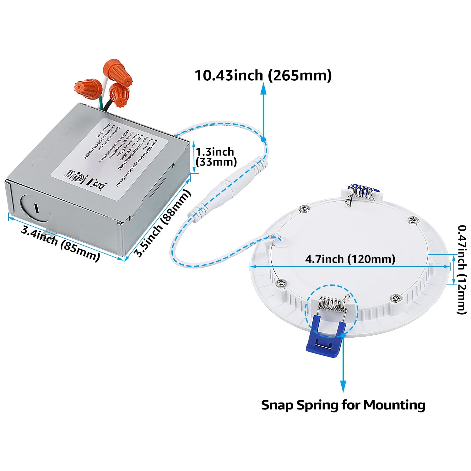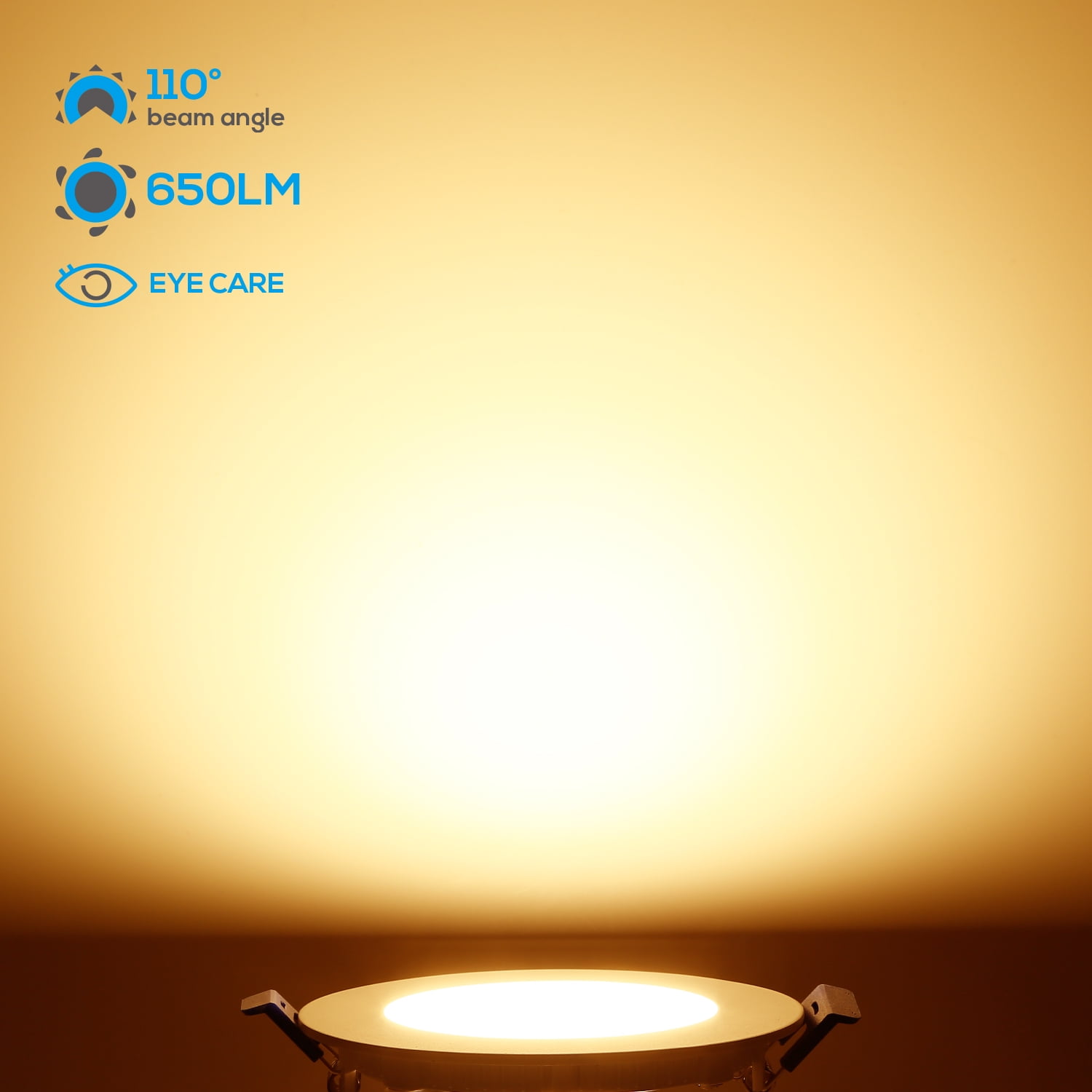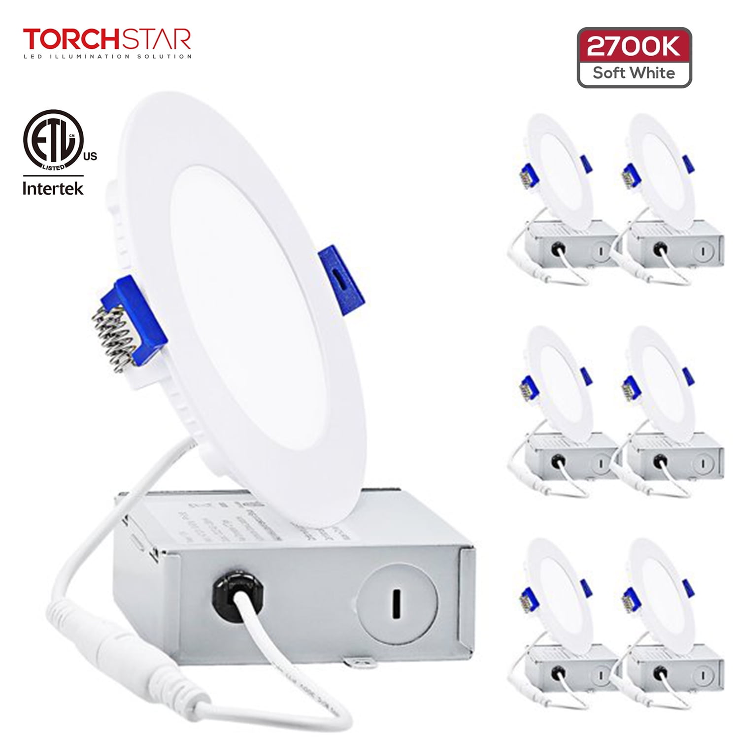TORCHSTAR 4 Inch LED Recessed Ceiling Light, Dimmable Ceiling Lights with Junction Box, Energy Star, Soft White, Pack of 6 If you’re troubled by small space in your ceiling or high energy costs, then this soft white recessed ultra-thin light is your must-have solution. Slim Design: For those whose ceilings are too small for standard LED flush light panels, we launched this recessed slim panel LED downlight. Only needing 2 inches of clearance, this bight light supports retrofit, remodeling, or new construction installations. Easy Installation: The ultra-thin design allows you to install this light from below the ceiling. Only 2 inches of clearance is needed, making this light perfect for retrofit, remodel or new construction installation. Compatible Dimmers Regular dimmers: Lutron: CTCL-153P, DVCL-153P, S-600P, SLV-600P, CN-600P, MAW-600, DVWCL-153P, TG-603, SCL-153P, DVWCL-153PH-WH, TG-600PNL Smart dimmers: Lutron: P-BDG-PKG1W, P-BDG-PKG2W-A, PD-6WCL-WH Leviton: DW6HD-1BZ, DW1KD-ABZ Note: The spring clips can fix the light onto a max 0.59inch thick ceiling. Warranty This product comes with a 3-year warranty for your rights and benefits as a customer, satisfaction guaranteed. Specifications Wattage: 10W Voltage: 100-130V CRI: >80 Luminous flux: 650lm CCT: 2700K soft white Dimmable: Yes Surface size: 4.72 inches Back hole size: 4.25 inches Lifespan: 36,000hrs Material: Aluminum & PC