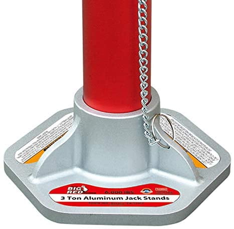 Torin BIG RED Aluminum Jack Stands DMT43004 with Maximum Load Weight: 3 Ton ,6000 pounds Lightweight aluminum jack stand used to support your vehicle after lifting with a jack Adjustable height ranges from 10-3/4″ to 15-5/8″ with a 3 ton ,6000 pounds maximum load weight Removable locking support pins provide added security and stability and is equipped with 6 locking positions Large saddle surface area for better contact with the load being supported Wide foot base provides additional stability; Base is removable, allowing for compact storage when not in use Tested for reliability and safety to meet ASME safety standards Manufactured with precision for quality and performance