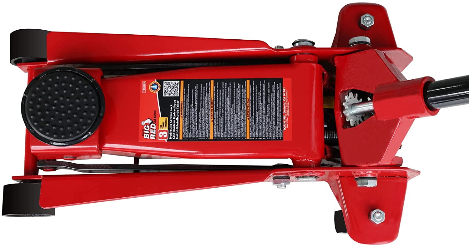 Torin Jacks Big Red T830025 Hydraulic Floor Jack with Single Quick Lift Piston Pump, 3 Ton (6,000 lb) Capacity Hydraulic garage jack is constructed with heavy duty steel, providing long term quality and durability for every day and industrial use Features a 3 ton (6,000 lb) capacity with a minimum lifting height of 5.1″ and a maximum height of 18.3″ Safety bypass system prevents over-loading and ensures safe operation; Ideal for most cars, trucks, and SUVs Equipped with (2) large steel casters and (2) 360-degree swivel casters for smooth maneuverability Wide stance provides added stability under load and has a powder-coated finish for rust resistance