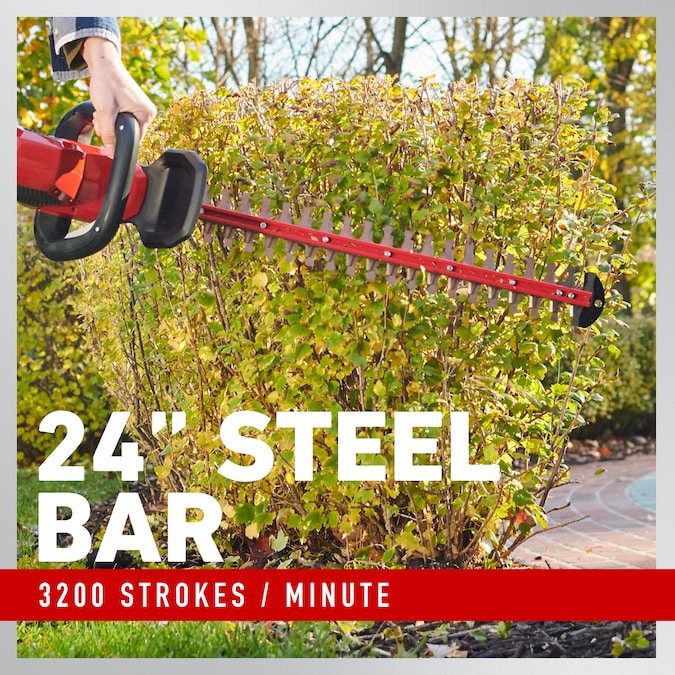 The Toro 60V Max 24-in Hedge Trimmer (Battery manufacturer rating = 60V maximum & 54V typical usage. Actual voltage varies with load) is two full feet of ferocious. Its powerful 60-volt maax motor cuts through branches like butter. Our exclusive blade design funnels branches in and keeps them there until they’re sliced, diced, and done. And its dual-action cutting bar makes you twice as effective. Need to switch from horizontal to vertical trimming? No problem. Just rotate it and rock it. For extra protection, a dual-sided safety is accessible in any of the cutting positions. As part of the Toro 60V Max Flex-Force Power System, it’s got power like no other that commands a full line of tools. Count on it.