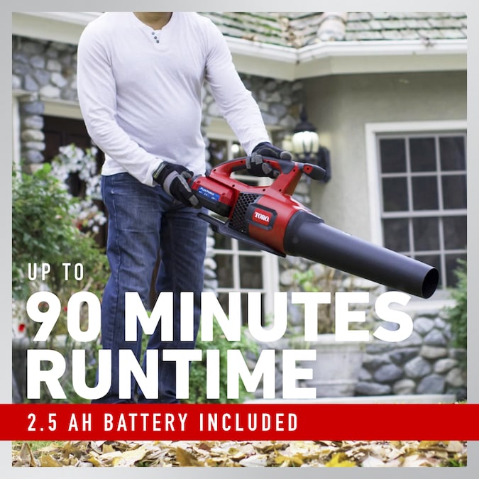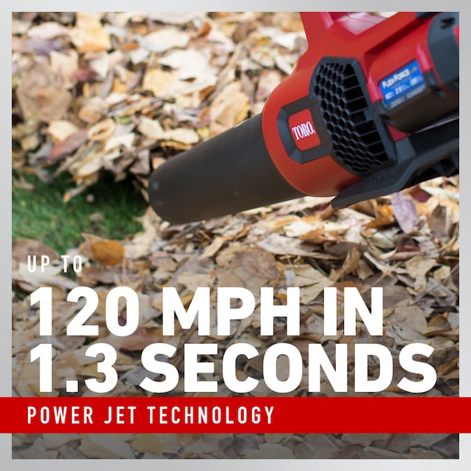 The Toro 60V Max Brushless Leaf Blower (Battery manufacturer rating = 60V maximum & 54V typical usage. Actual voltage varies with load) is an aerodynamic beast, thanks to PowerJet technology. Larger air vents maximize air intake, while the perfectly optimized jet fan design provides peak efficiency, resulting in supercharged airflow and power. Go from zero to 120 MPH in 1.3-seconds flat with over 605 CFM of awesome air volume that makes small work of huge leaf piles. Achieve ultimate comfort and control with variable speed trigger, cruise control, and turbo boost button. 3-phase brushless motor with RunSmart onboard intel that optimizes performance, giving you more power, more runtime, and longer life from your tool. As part of the Toro 60V Max Flex-Force Power System, it’s got power like no other that commands a full line of tools. Count on it.