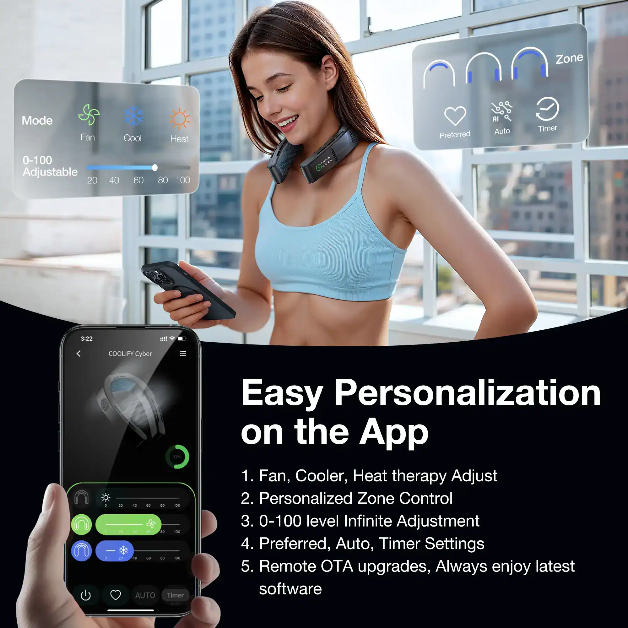 Introducing COOLiFY Cyber, the ultimate personal air conditioner that is different from conventional neck fans and engineered to deliver a customized and comfortable climate experience beyond compare. With powerful cooling performance and pioneering features, COOLiFY Cyber sets the benchmark for the next era of personal neck air conditioners. Powered by the algorithm-driven KU 3.0 chip, state-of-the-art Coology system, and graphene heat dissipation technology, COOLiFY Cyber swiftly envelops you in refreshing coolness, accompanied by customizable airflow and modes (Cool/Fan/Heat) ensuring tailored comfort regardless of the temperature. The compact, lightweight, and adjustable design allows you to move your head without restriction, making it ideal for various outdoor activities like golf.