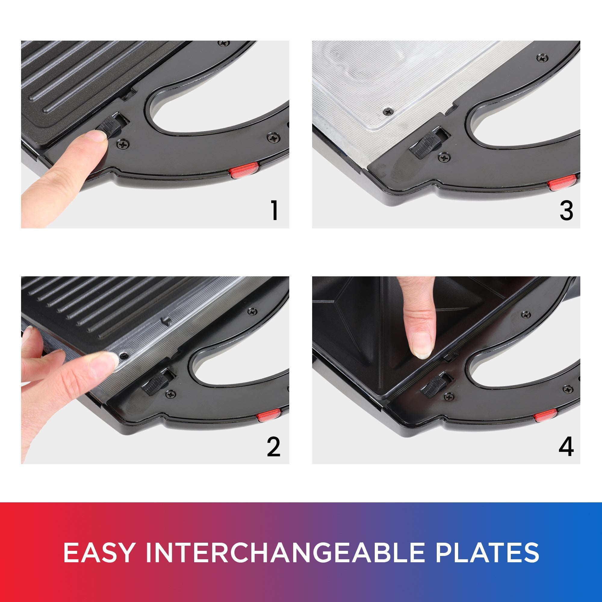 Tips and Tricks To reduce the risk of burns, allow the unit to cool completely before removing cooking plates Wash plates in warm soapy water or place them in your dishwasher Use a damp cloth to wipe any drips from below the cooking plates and dry thoroughly Do not use abrasive pads or cleaners on cooking plates or any other part of the grill PRODUCT FEATURES 4 APPLIANCES IN 1 Use as sandwich press, open griddle, wafflemaker, and grill with 4 interchangeable cooking surfaces HEALTHY FAMILY MEALS Prepare delicious low-calorie dishes in no time with included recipe book EFFORTLESS CLEANUP Dishwasher-safe BPA-free non-stick plates for easy cleanup and peace of mind BUILT-IN SAFETY FEATURES Cool touch housing, non-slip feet, and insulated handles ensure safe operation COMPACT AND PORTABLE Space-saving design with carry handle stands upright for storage