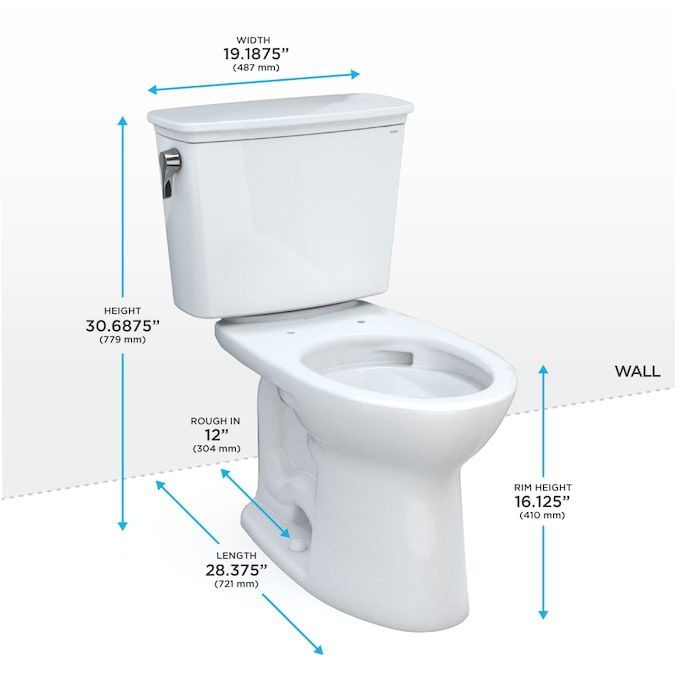 - The toilet fits into 12 inch rough-in installations and has a left-hand trip lever