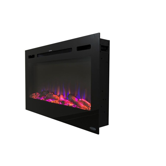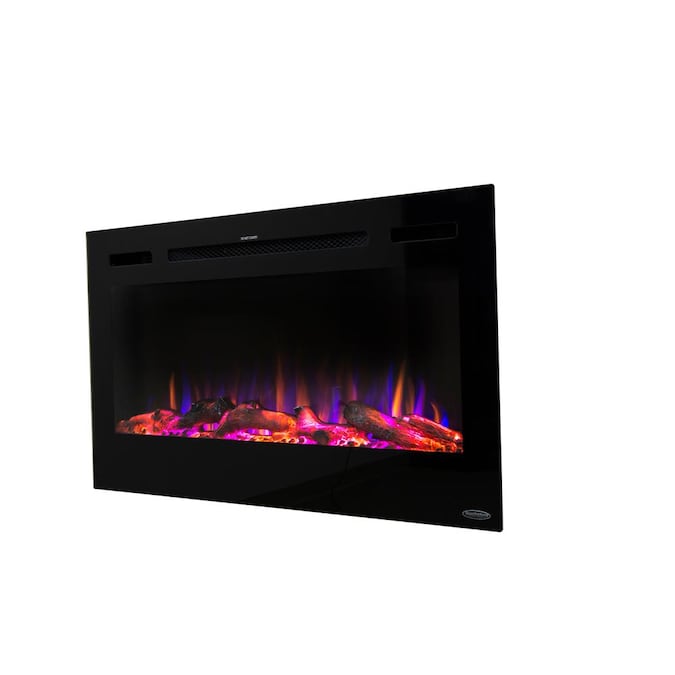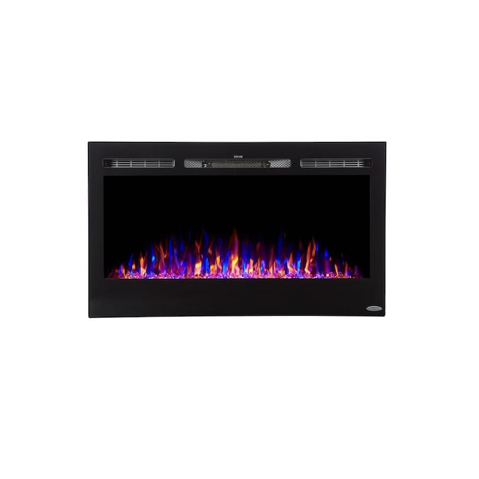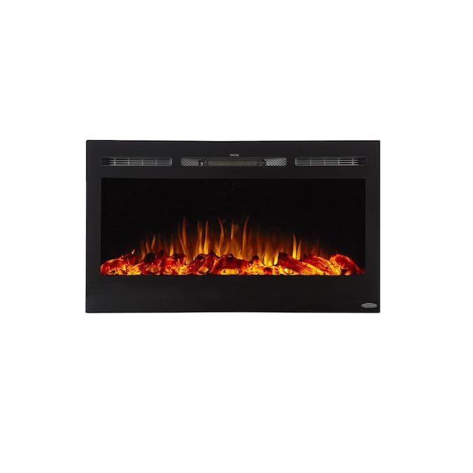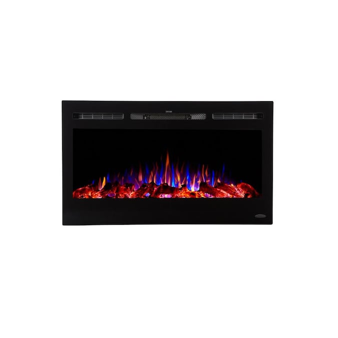 - Slim frame that features a large fireplace viewing area with life-like LED flames