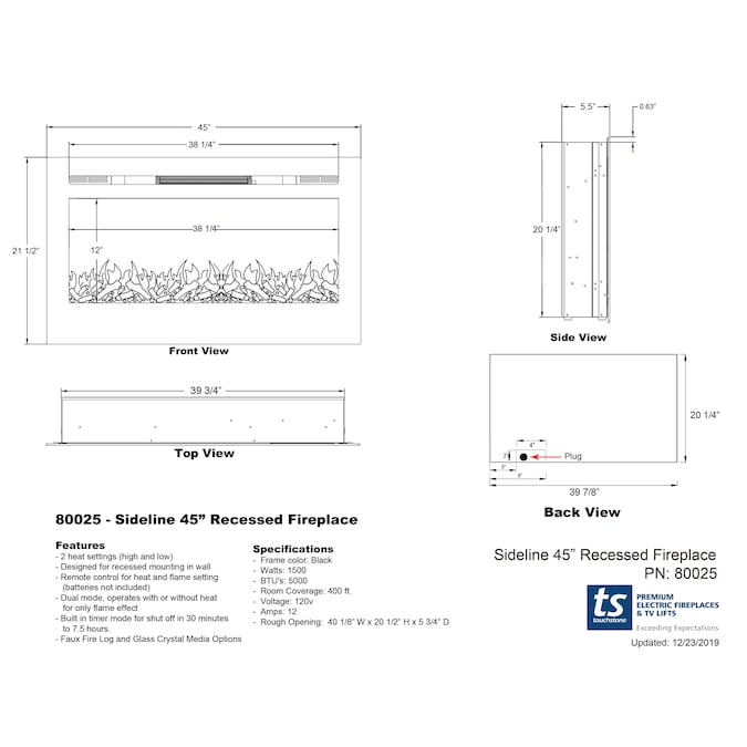 Touchstone designed the Sideline 45 smart electric fireplace to meet the needs of contractors and do-it-yourself installers, who are looking for the beauty of a Touchstone fireplace mounted flush to a wall. The Sideline 45 is a 45 inch wide smart electric fireplace with Wifi connectivity, Touchstone’s realistic flames, contemporary black frame, and a heating element that is placed in front of the frame, which allows in-wall installation. The Sideline 45 delivers the beauty of a fireplace without the fire and mess. The Sideline 45 has a 5,000 BTU heater that will provide supplemental heat a room of up to 400 square feet, with high and low heat settings, as well as a thermostat. Also, the fireplace’s flame can be used without the heating feature. The Sideline 45 is easy to install and comes with simple and understandable instructions. The heart of Touchstone’s electric fireplaces is the flame itself. We tell our customers that the flame will transcend your expectations, and they will not fail to impress. The flames deliver the same relaxing effect of real flames, without the smell or mess, and they look great in any room of the house. With the five speed settings and five flame flame intensity offered by the Sideline 45, ranging from a dim glow to a full fire blaze, you have the power to adjust the flame based on your desired mood or lighting of the room with the control features on the fireplace’s remote. With three realistic flame color options, ten ember bed color choices (with pulsating embers at level 5 intensity), and faux logs and crystal hearth options included, the Sideline creates the cozy atmosphere of a traditional fireplace, emitting authentic-looking flames that emulate a real fire. Control the heat and fire effects using the included remote control or through the smartphone app via Wifi connection. The flames that Touchstone Home Products fireplaces create are natural enough to have friends and family think you own a traditional wood burning fireplace.