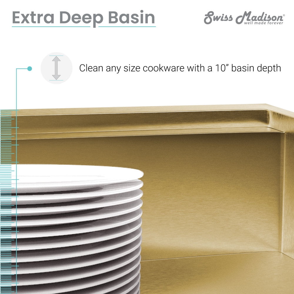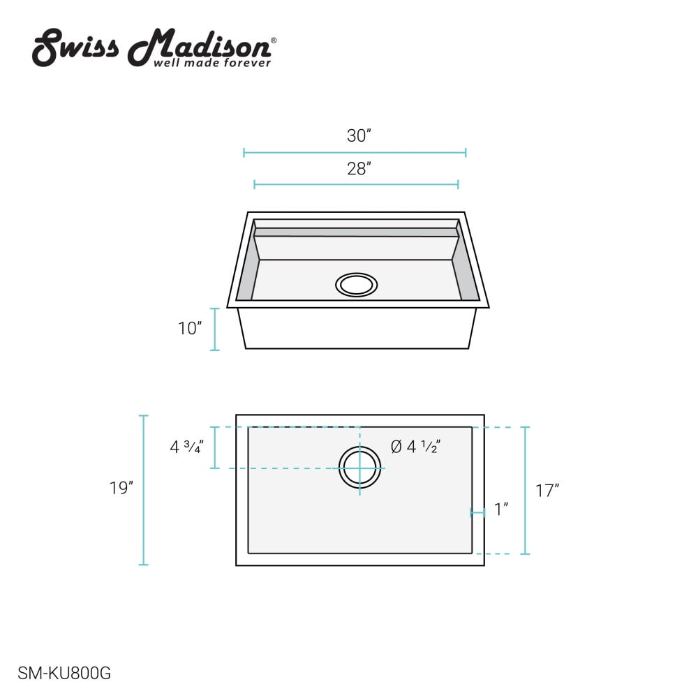 Undermount Installation: Designed to fit beneath the countertop and cabinetry to provide a seamless look. Material: Durable and long-lasting 18 gauge Stainless Steel. Drain Location: Rear Center Basin Depth: 10 Inches R0 Corner Radius: Sharp corners for a sleek modern look. Sound Absorbing Pads: Equipped with sound-dampening pads to minimize sink noise and vibration. Sloped Drainage: The slightly sloped sink basin allows water to drain easier. Cabinet Size: The minimum interior of your cabinet should be 3″ wider than the width of your sink. Included: Mounting clips and cutout template. Sold Seperately: Sink drain is not included. Dimensions: 33″W X 22″D X 13″H One Year Limited Warranty