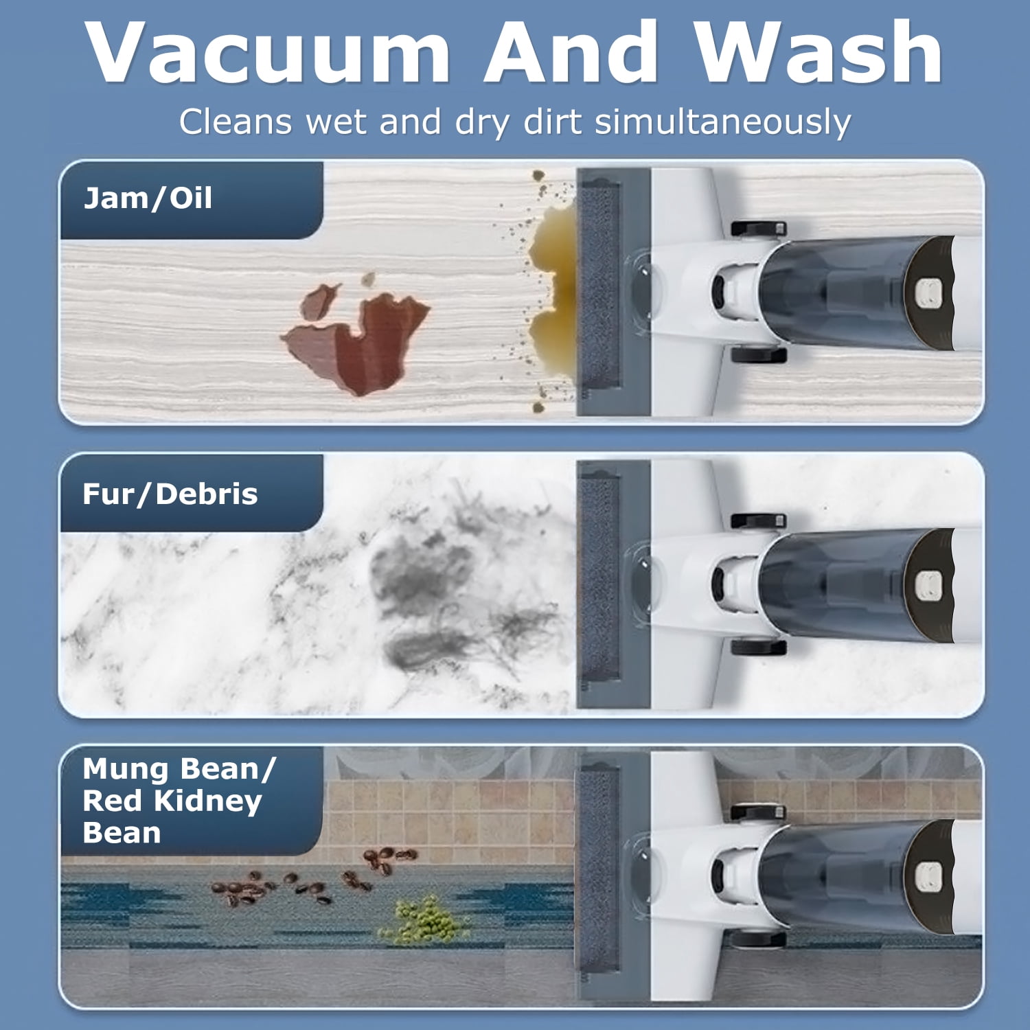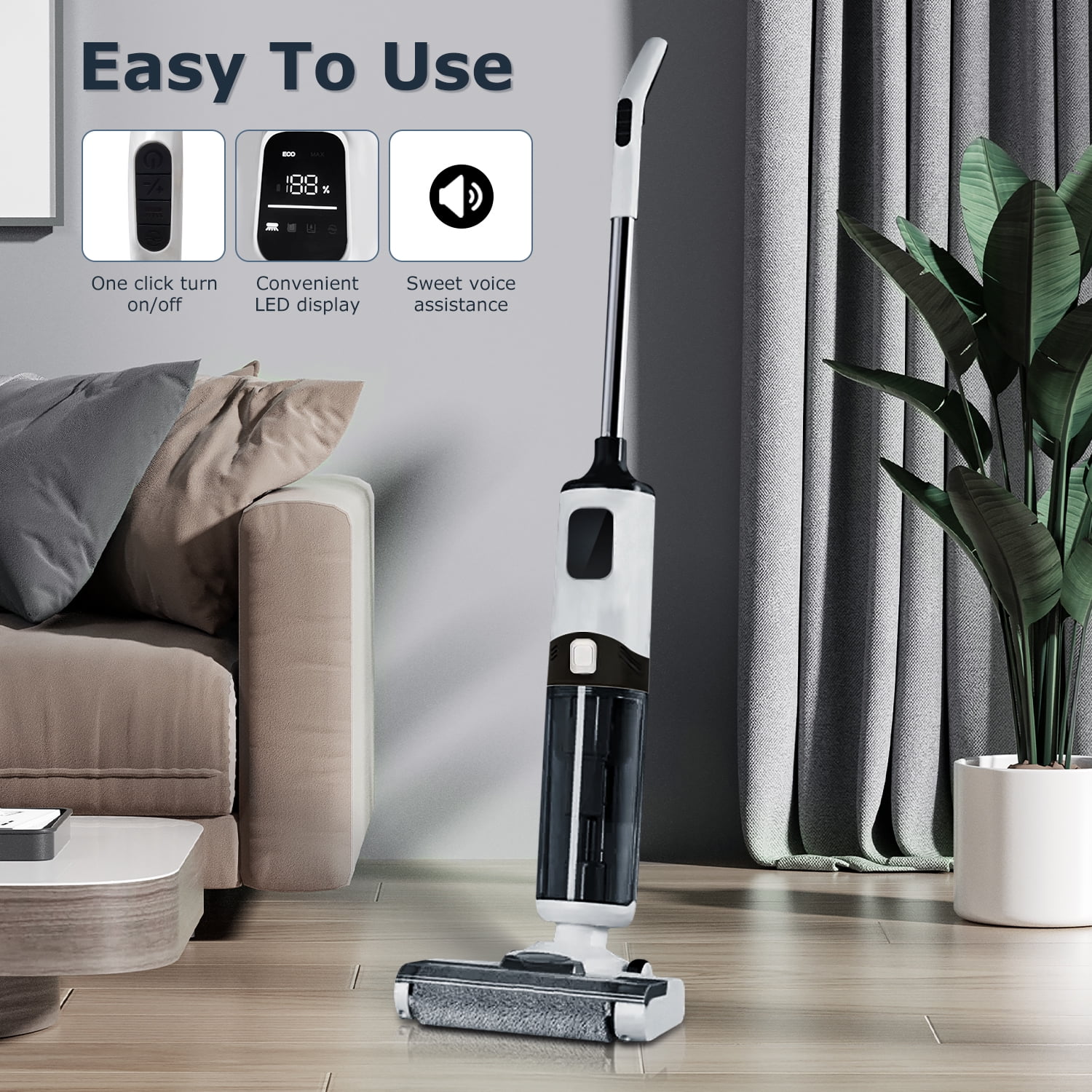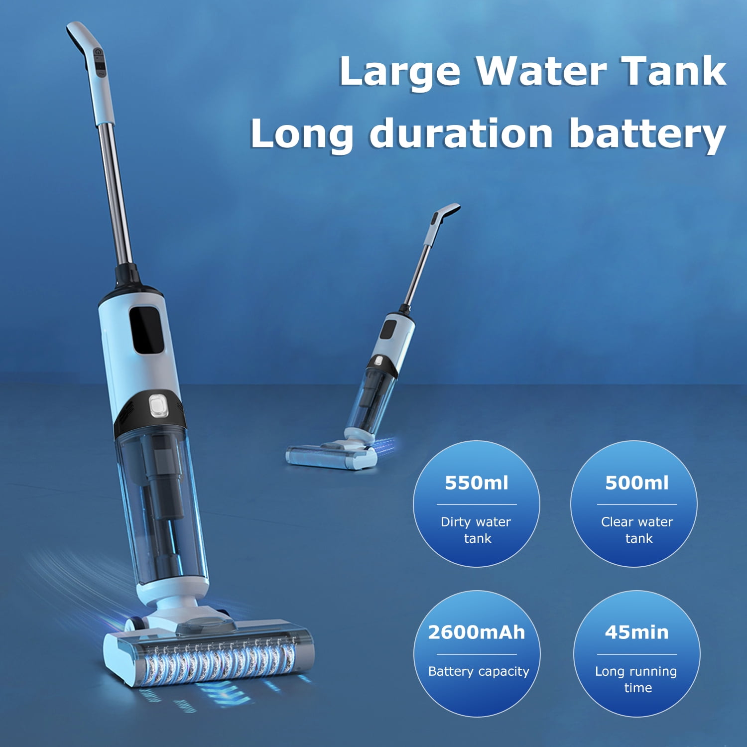 Tovendor Cordless Wet-Dry Vacuum Cleaner – Lightweight 3 In-1 Cleaning Mode: Vacuum, mop, and self-clean simultaneously for efficient cleaning Multiplace Cleaning: Combines vacuuming and mopping to effectively clean debris and stains on hard floors, marble, and ceramics in various areas such as living rooms, bedrooms, and kitchens Low-Noise and Wireless Operation: Features a large-capacity battery with a running time of up to 45 minutes, allowing you to complete cleaning tasks easily and quietly 2 Water Tank Modes: Includes a 500ml clean water tank and a 550ml sewage tank, ensuring fresh water and cleaning solution are always available LED Display: Smart display shows real-time remaining power, water spray mode, water tank level reminders, and high/low intensity cleaning options