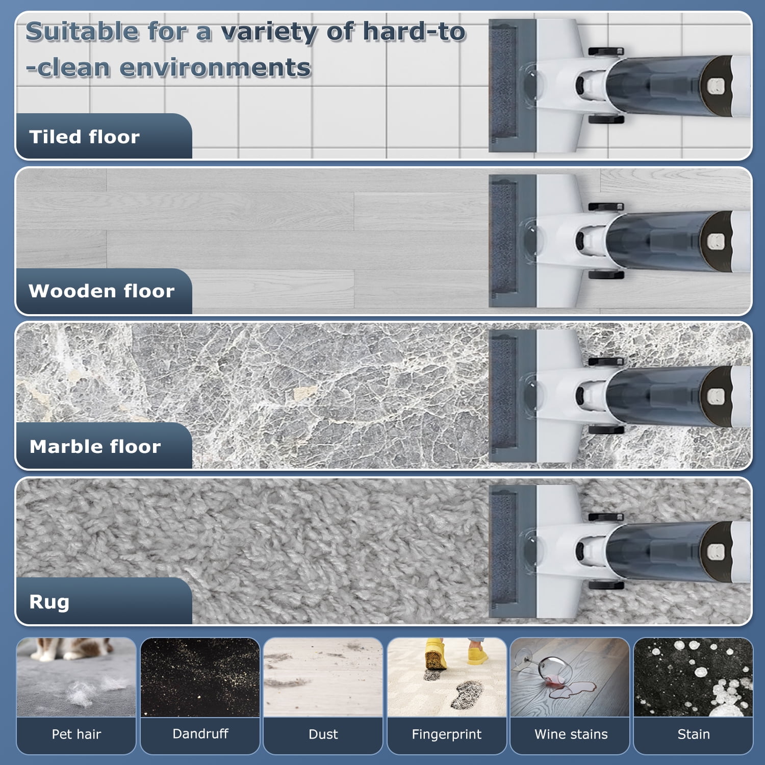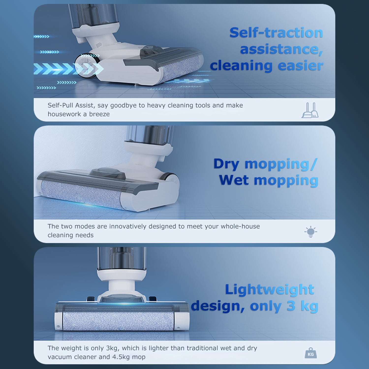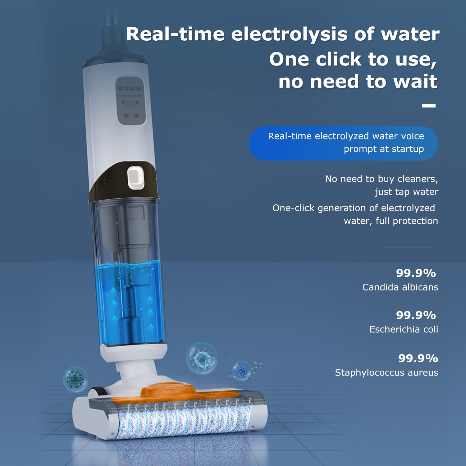 Tovendor Cordless Wet-Dry Vacuum Cleaner – Lightweight 3 In-1 Cleaning Mode: Vacuum, mop, and self-clean simultaneously for efficient cleaning Multiplace Cleaning: Combines vacuuming and mopping to effectively clean debris and stains on hard floors, marble, and ceramics in various areas such as living rooms, bedrooms, and kitchens Low-Noise and Wireless Operation: Features a large-capacity battery with a running time of up to 45 minutes, allowing you to complete cleaning tasks easily and quietly 2 Water Tank Modes: Includes a 500ml clean water tank and a 550ml sewage tank, ensuring fresh water and cleaning solution are always available LED Display: Smart display shows real-time remaining power, water spray mode, water tank level reminders, and high/low intensity cleaning options