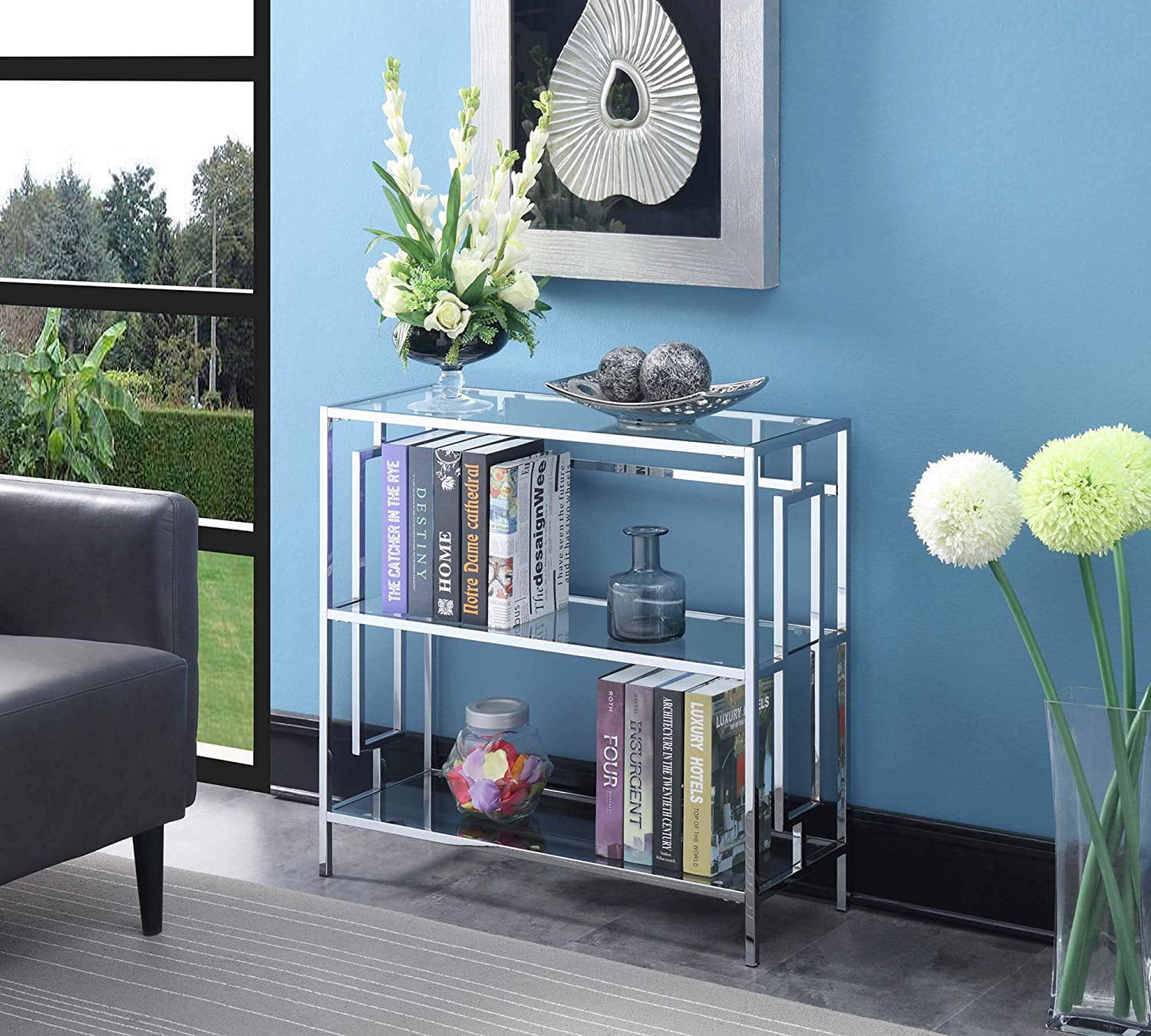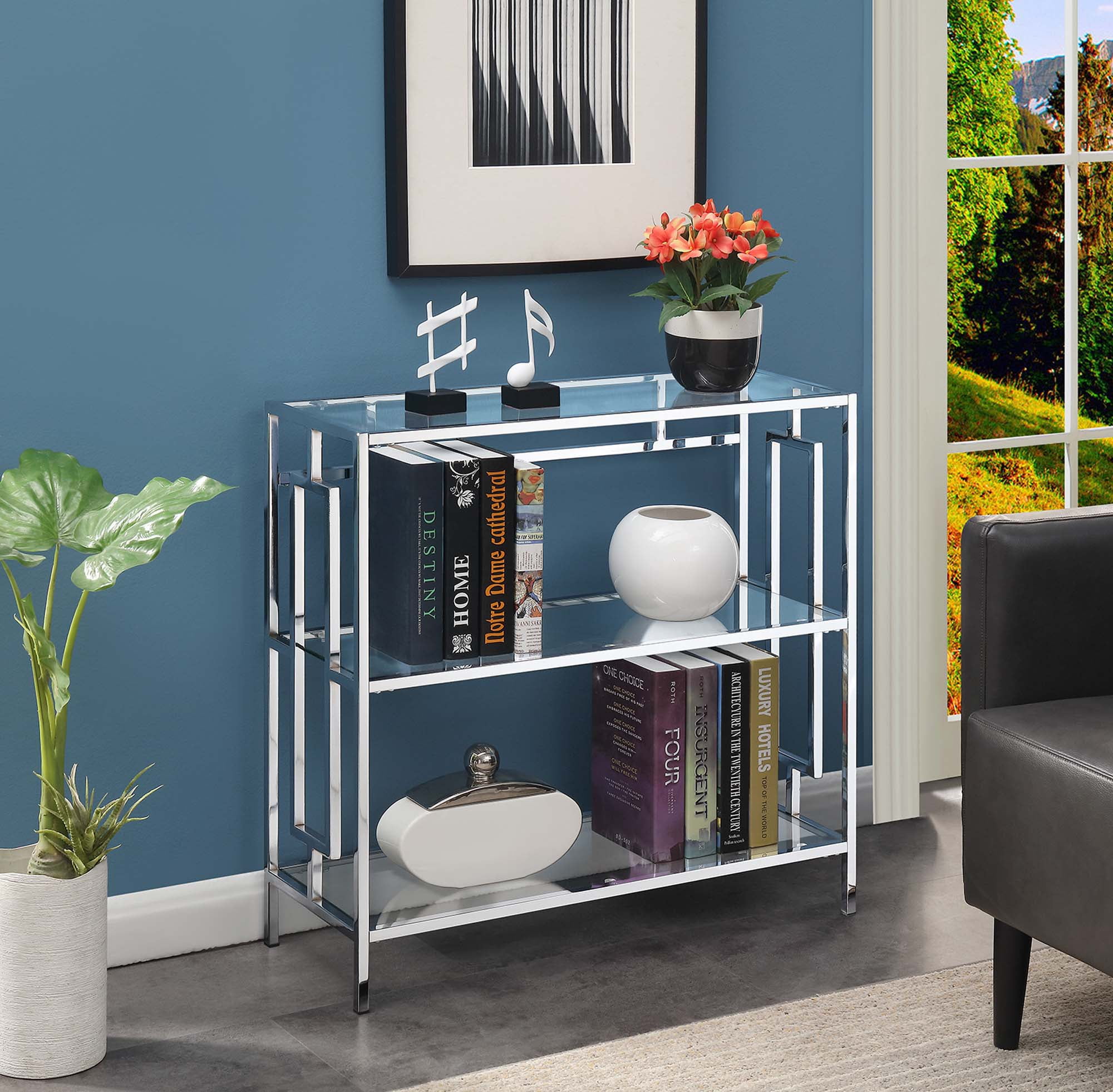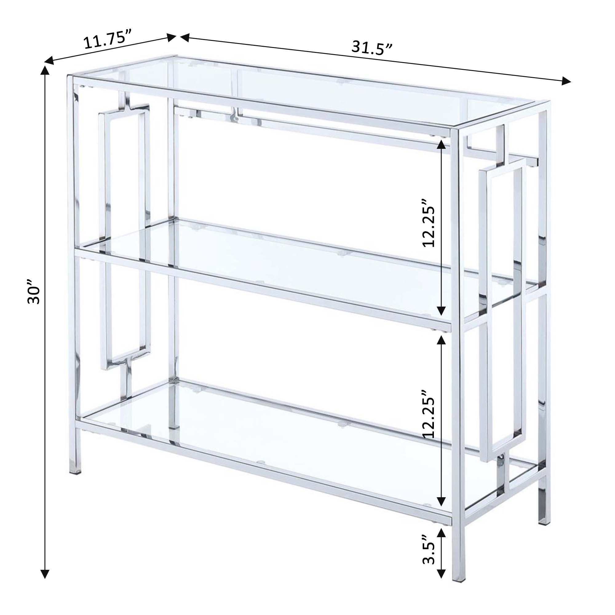 Tired of boring bookcases? The Town Square Chrome Three-Tier Bookshelf by Convenience Concepts is the perfect solution. Brimming with glam design, this three-tier display is ideal to incorporate your favorite books into your décor with style. Books no longer must be stored away from sight. Show them off with pride with this sleek open concept piece. The shelves are made from tempered clear glass, making them both easy-maintenance and durable. Constructed from chromed metal, the frame will stand the test of time. With three rectangular shelves, this chic bookcase provides enough space for your favorite trilogies or favorite collectibles. Add to your ensemble right after delivery with its simple four-step assembly. Look for more furniture pieces from the Town Square Collection by Convenience Concepts. Each sold separately. Features: Part of the Town Square Collection by Convenience Concepts Stylish glam design to upscale your home decor Crafted from tempered clear glass and chromed metal Will complement any modern decor Built to last for many years of enjoyment (W) 12″ x (L) 31.5″ x (H) 30″ Specifications: Product Dimensions: (W) 12″ x (L) 31.5″ x (H) 30″ Product Weight: 35