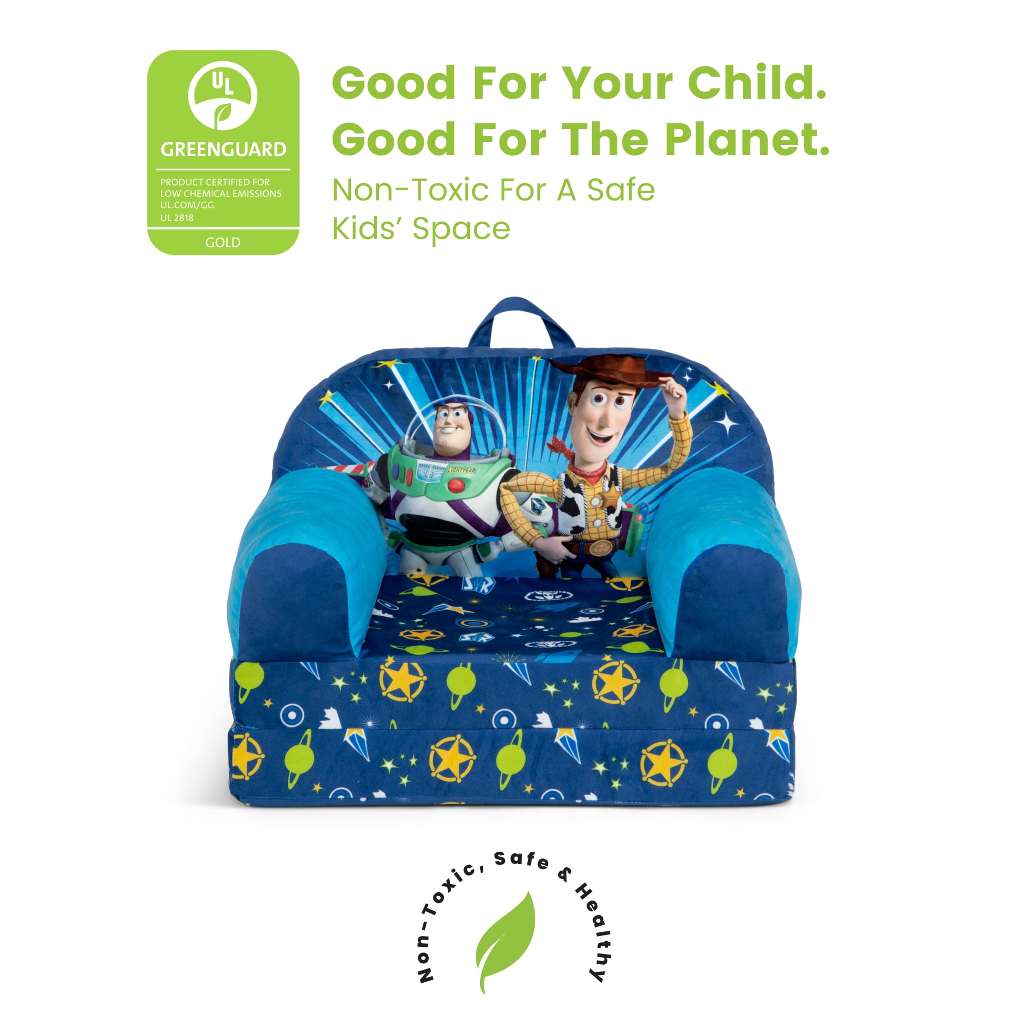 CONVERTIBLE 2-IN-1 DESIGN: This flip-out chair converts to a lounger/sleeper| Ideal for reading, relaxing, playing or sleeping GREENGUARD GOLD CERTIFIED: This chair meets the most stringent chemical emissions standards to create a healthier home for your child. Tested for more than 10,000 chemicals and VOCs, this chair is certified to contribute to cleaner indoor air COMFY FOAM CONSTRUCTION: Supportive foam keeps its shape and provides all-day comfort | Lightweight chair is portable and has a handle for easy toting from room to room | Ideal toddler chair for bedrooms, playrooms, gaming or studying SAFE OPTION: Chair meets or exceeds government and ASTM safety standards SIZE: Chair size: 21”W x 15”D x 16”H; Unfolded: 21”W x 30”D x 13”H; Seat size: 11.5”W x 10.75”D x 5.5”H; Seat back: 10.5”H; Arm: 10.5”H | Recommended for ages 18 months+ FOR TOY STORY’s FANS: This plush chair features colorful Toy Story graphics | This chair will be your child’s cuddly companion for reading, relaxing or snuggling
