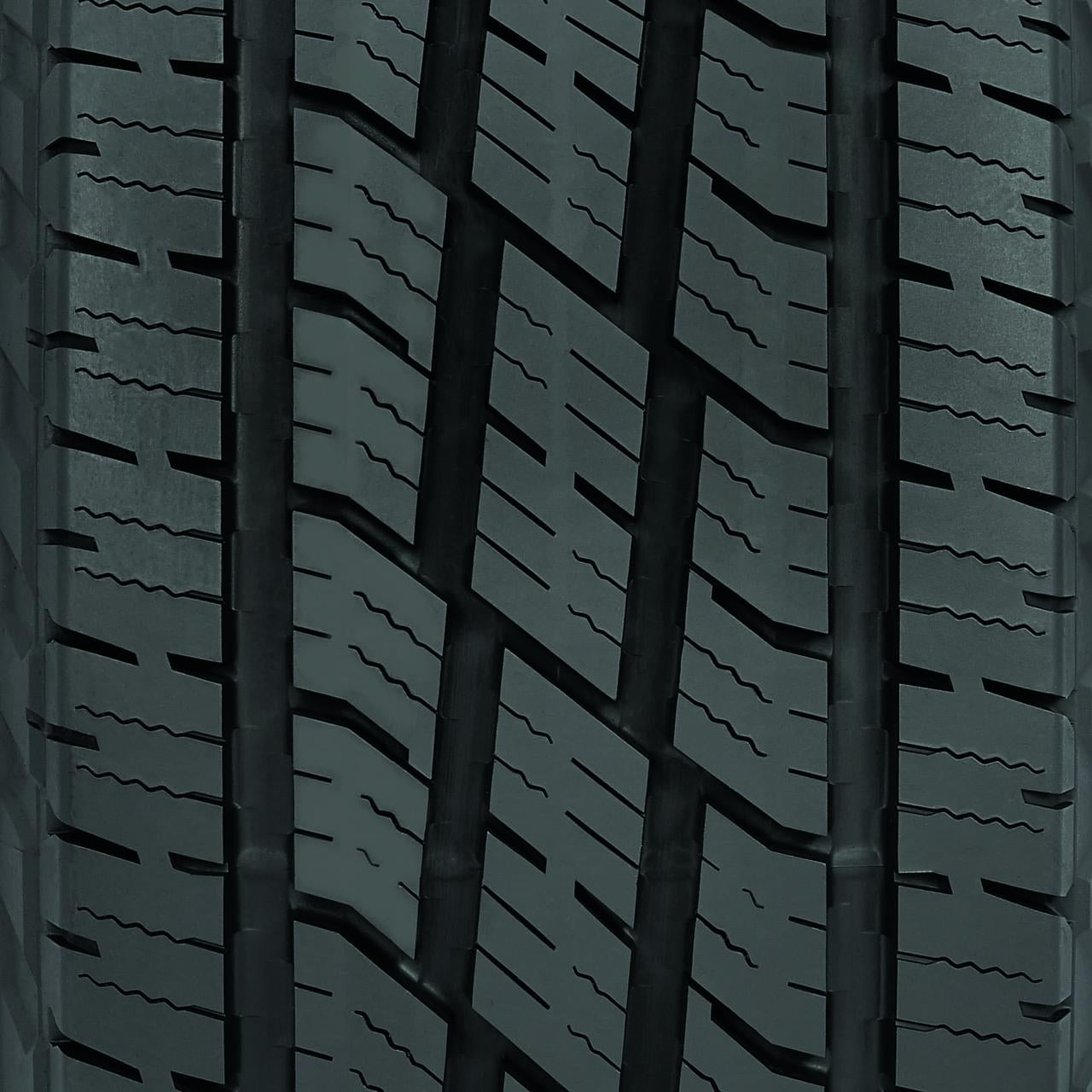 Toyo Open Country H/T II FEATURES AND BENEFITS All weather traction Enhanced controllability Longer lasting tread life Improved load durability OVERVIEW The Toyo Open Country H/T II is a highway terrain, all season tire manufactured for SUVs and light trucks. Toyo offers a 50,000 mile treadwear warranty with the light truck sizes and a 70,000 mile warranty with the SUV sizes of this tire model. The tread design and all season compound work together to boost the year round driving safety. The symmetric tread designs close surface contact and detailed multi-siping pattern increase the tires grip on the road surface, with additional biting edges. The durable all season compound keeps the rubber flexibility in different weather conditions, which guarantees a safer performance. This combination enables the tire to increase its dry, wet and winter weather performance. The adaptive straight and zigzag circumferential grooves avoid hydroplaning. They disperse water and slush from below the footprint and maintain the surface contact to boost the wet and winter weather traction. The tread designs constant and close surface contact upgrades its controllability. The treads shoulder ribs and optimized center tread block placement increase the tires contact with the road surface. This greatly upgrades the steering responsiveness and the driving stability. In other words, the steering becomes faster and more precise in its response to the drivers commands, while the structure is stabilized against the driving pressure affecting the model. The shoulder rib pattern also manages to enhance the cornering capability. The constant road contact of the shoulder ribs and its ideal siping pattern heighten the number of biting edges gripping the road surface during maneuvering, which increases the cornering security. The model promotes a longer lasting tread life. It utilizes the durable compound and the ideal tread pattern to enhance the models usability. The durable compounds wear-resistant rubber materials slow the tread wear rate down, by avoiding premature wear patterns. The treads stabilized tread elements and high siping density ensure even pressure distribution along the tread area. The equally spread out forces of acceleration, cornering and braking actively prevents irregular wear formations across the tires surface. The reduced tread wear rate and guaranteed even wear lengthen the tires usability and service life. The Open Country H/T II upgrades the load and driving durability. The stronger construction maintains the ideal tire shape under the load and driving pressure affecting the model. As the tire does not deform under the pressure, it is capable of carrying and withstanding heavy loads with ease. This enables the tire to securely perform with heavy loads, guaranteeing a safer driving experience.