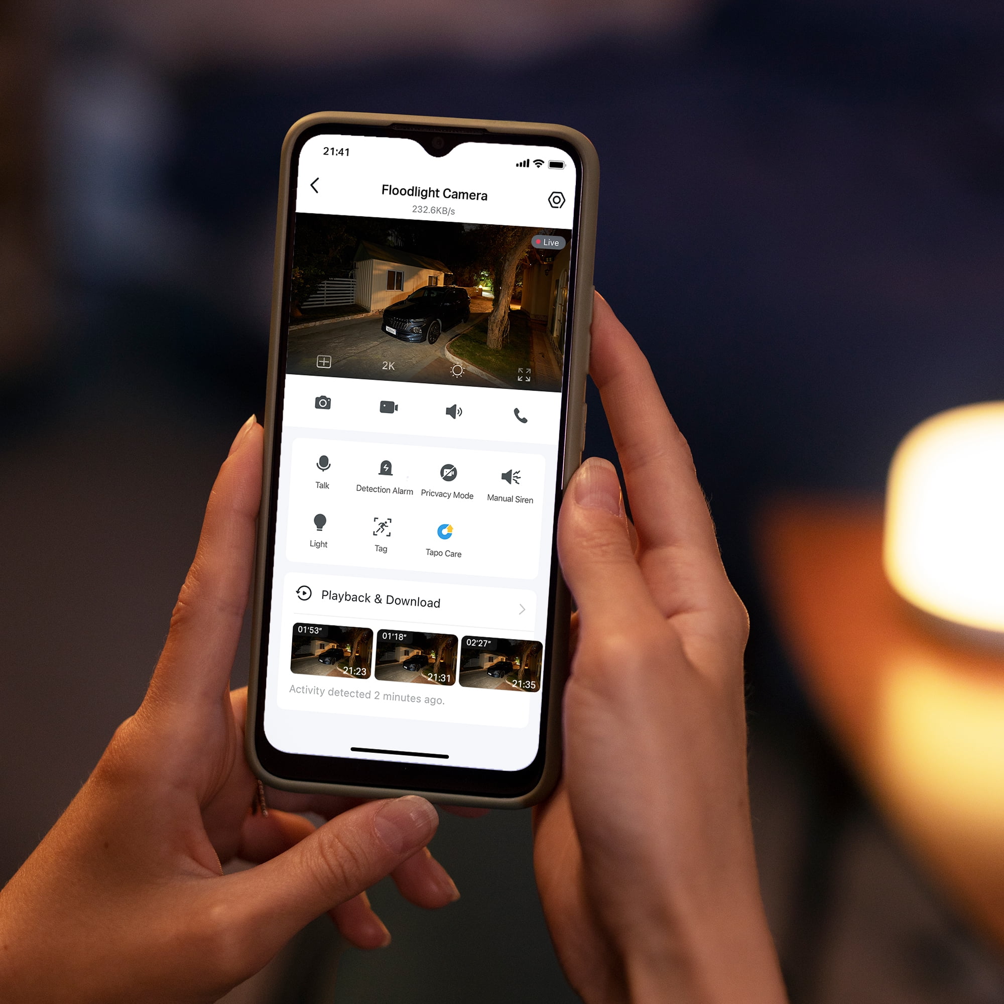 2800-Lumen Ultra-Bright Floodlight: 2K Live View with 150° FOV: 270° Motion-Activated Floodlight: oTapo App 3.0: Our latest update simplifies smart home management by unifying control of Tapo and Kasa devices within a single app—Group and automate actions effortlessly. Customizable Sound Alarm: Local or Cloud Storage: Set Up & Configure with App: 24/7 Protection: Two-Way Audio: **Subscribe for cloud storage