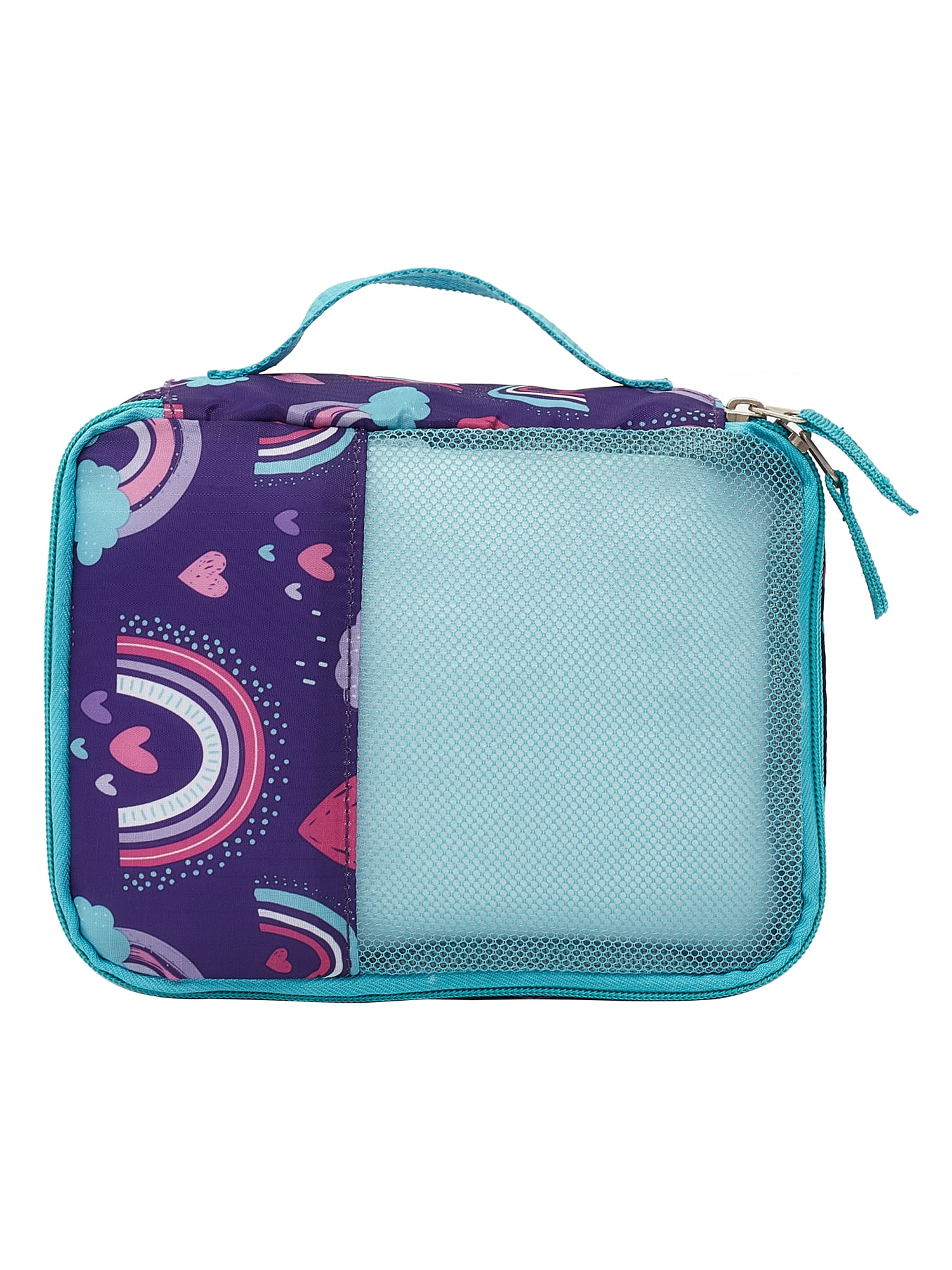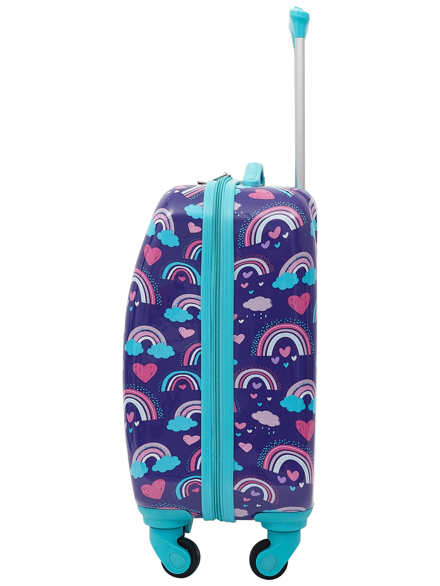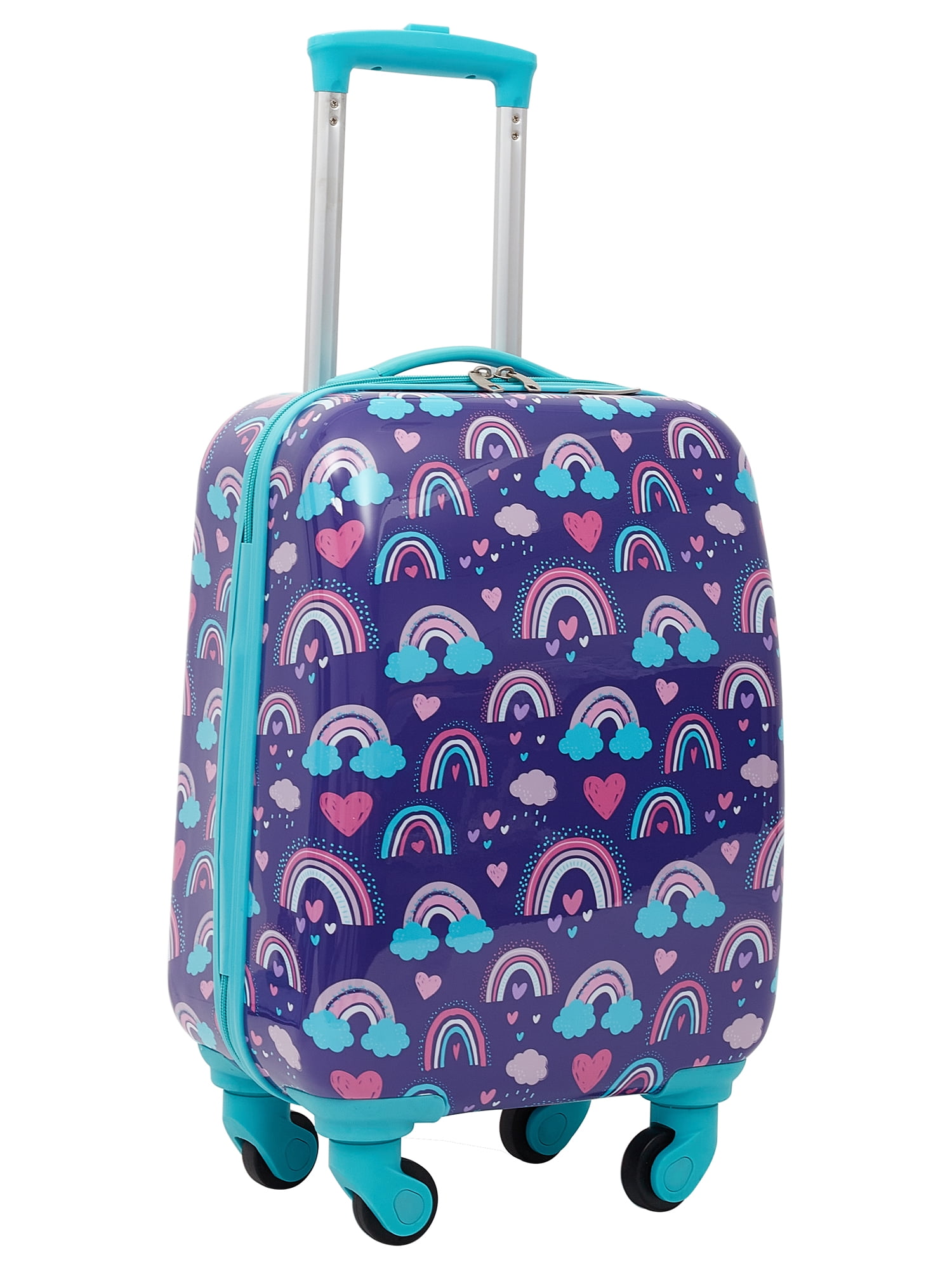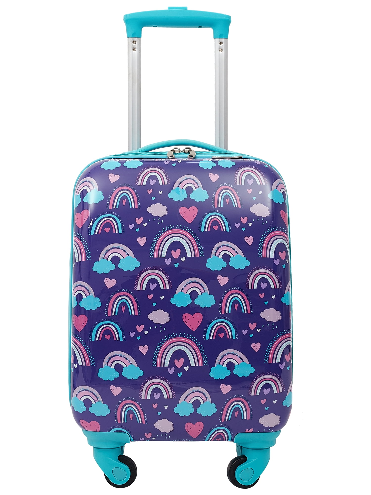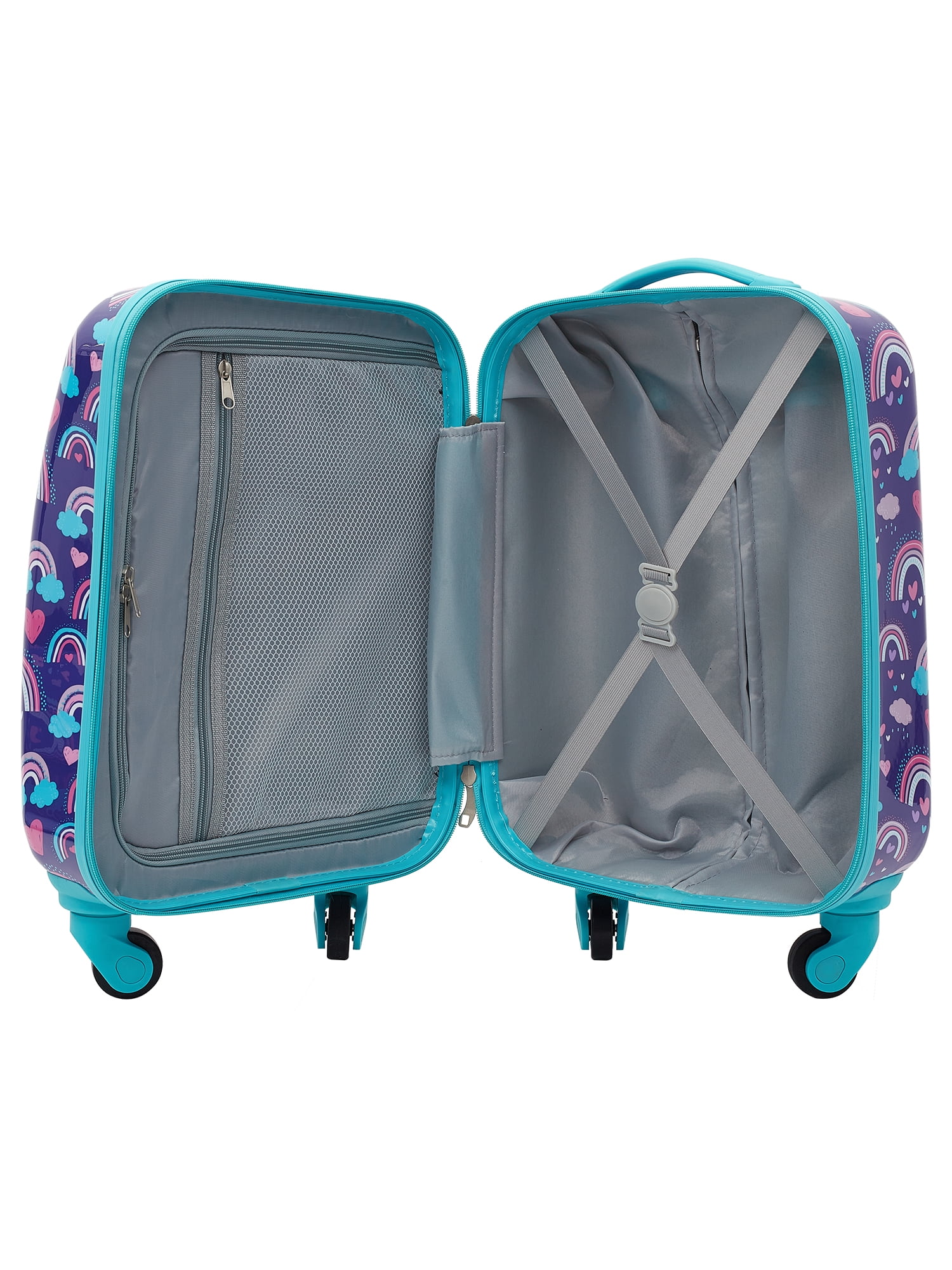 Colorful and dynamic hard-side prints are easy to identify and stand out. Reinforced lightweight and durable ABS shell with polycarbonate coating that provides extra resilience to impacts, cracks, and breaks. Spinner wheels allow for a complete weightless rolling experience in any direction. Multi-step telescopic aluminum pull handle with a self-locking mechanism adjusts to any height. Fully lined double-deck interior with a separate zippered panel to organize your packing. U-shaped zippered opening into a spacious main compartment with mesh accessory pocket and adjustable elastic tie-down straps to secure contents Top carry handle for easy lifting 2-piece Packing Cubes help compartmentalize your packing into distinct categories and save packing space. Comes with a cute neck pillow with a matching print for long car rides and flights. The luggage tag add-on allows for easy identification of belongings. 18” Case Dimensions: 16” x 13” x 9” Overall Dimensions: 18” x 13” x 9 2PC Packing Cube Dimensions: 10” x 8” x 3” 8” x 6” x 3” 5PC Total Weight: 4.84 lbs. 18” Rolling Carry-On meets all airline carry-on restrictions Imported Spot Clean