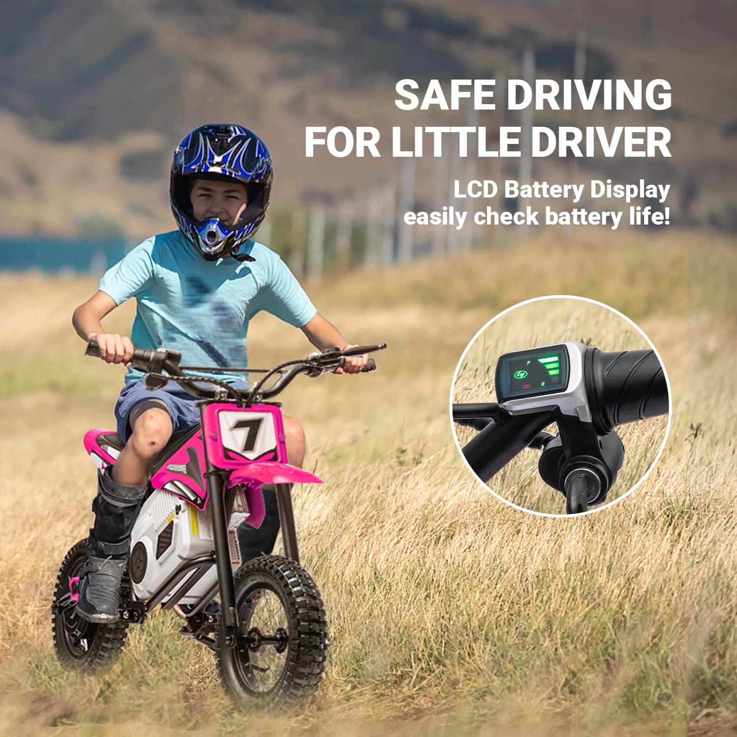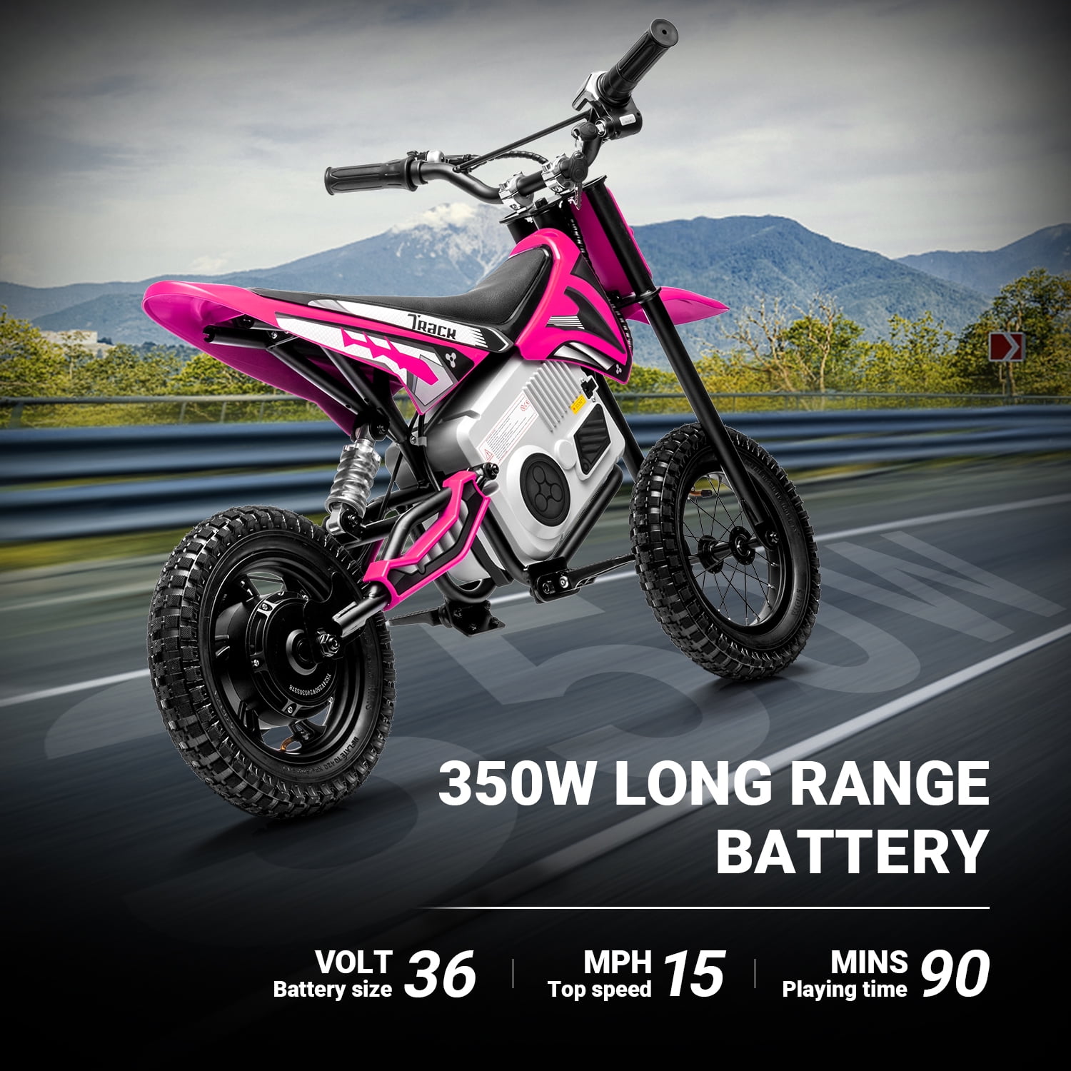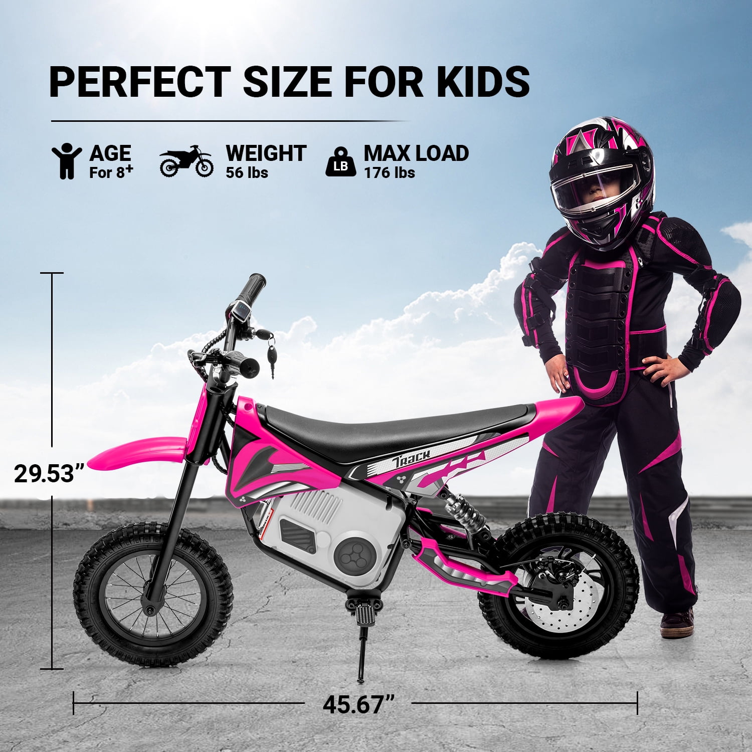 Track 7 36V Hand-Operated Electric 350W Dirt Bike, Pink Powered by a 350-watt, high-torque, variable-speed, chain-driven motor for speeds up to 15.5 mph Rechargeable 36V (two 18V) sealed lead-acid battery system provides up to 80 minutes of continuous use Features key start, soft grips with twist acceleration control, hand-operated rear brake, and shatter-resistant plastic fairings Equipped with a double crown fork, retractable kickstand, and 12-inch pneumatic knobby tires for enhanced stability Stylish LED display and practical manual bike bell function for added utility and flair
