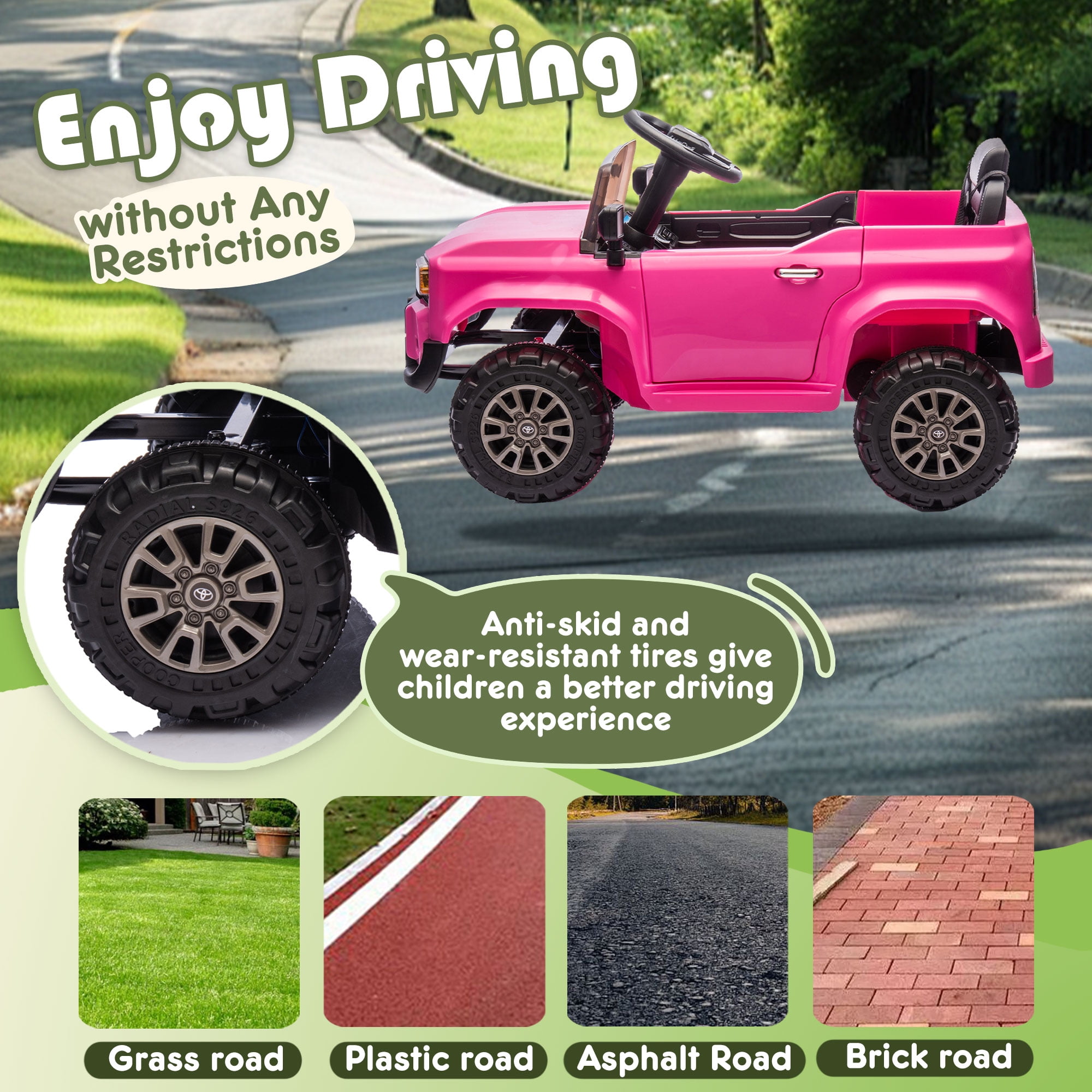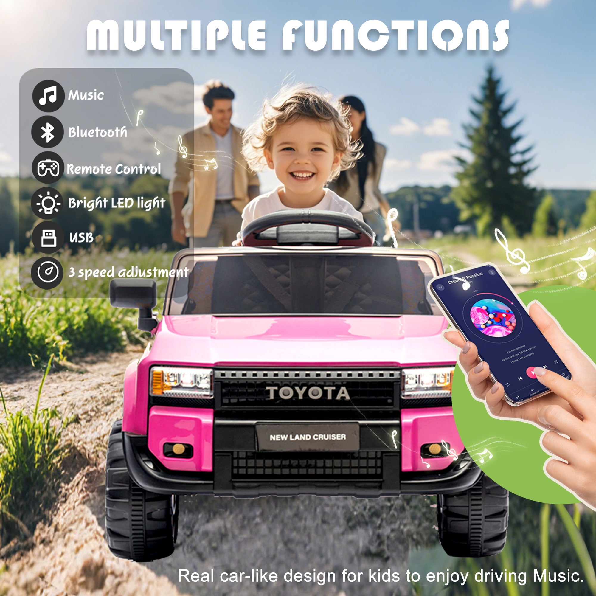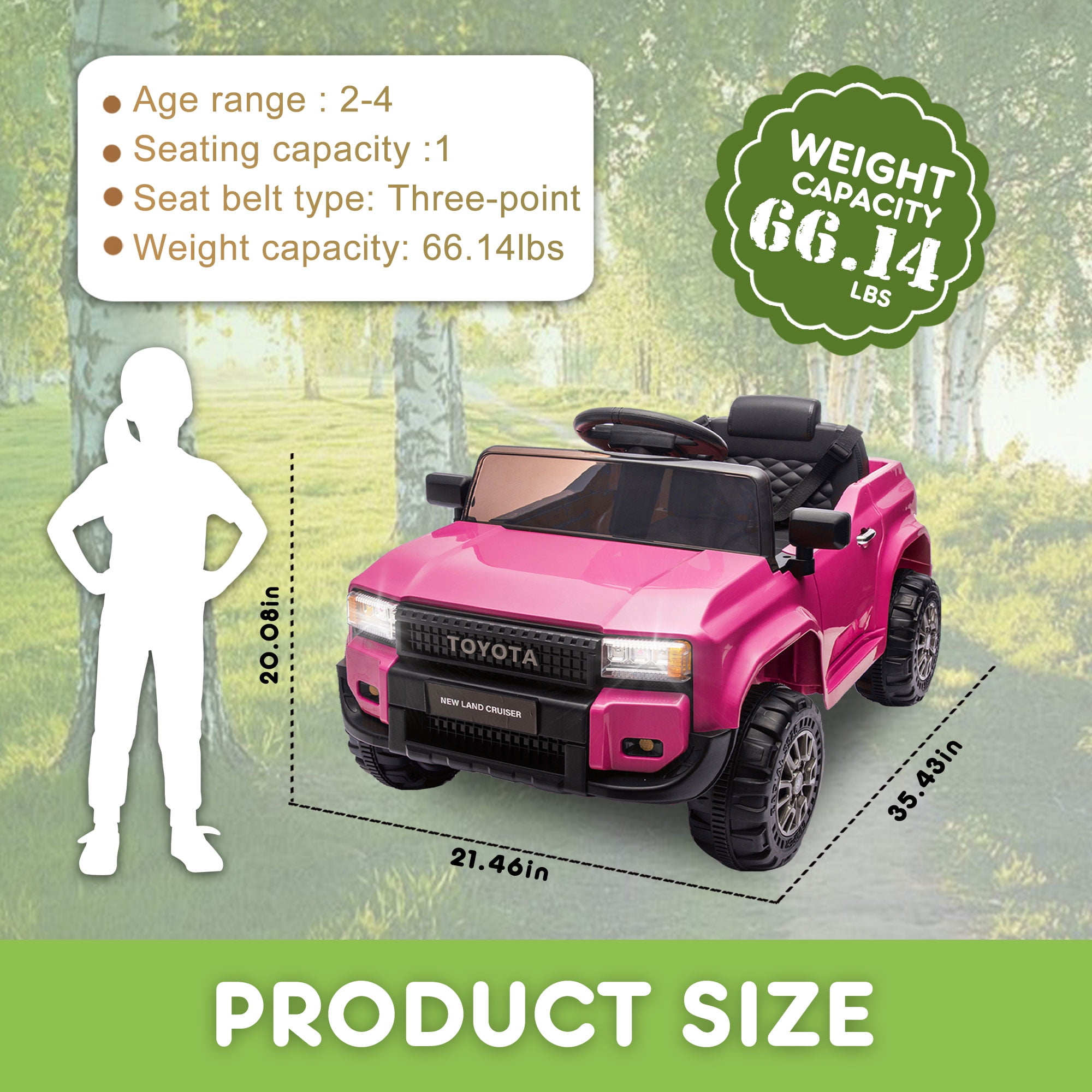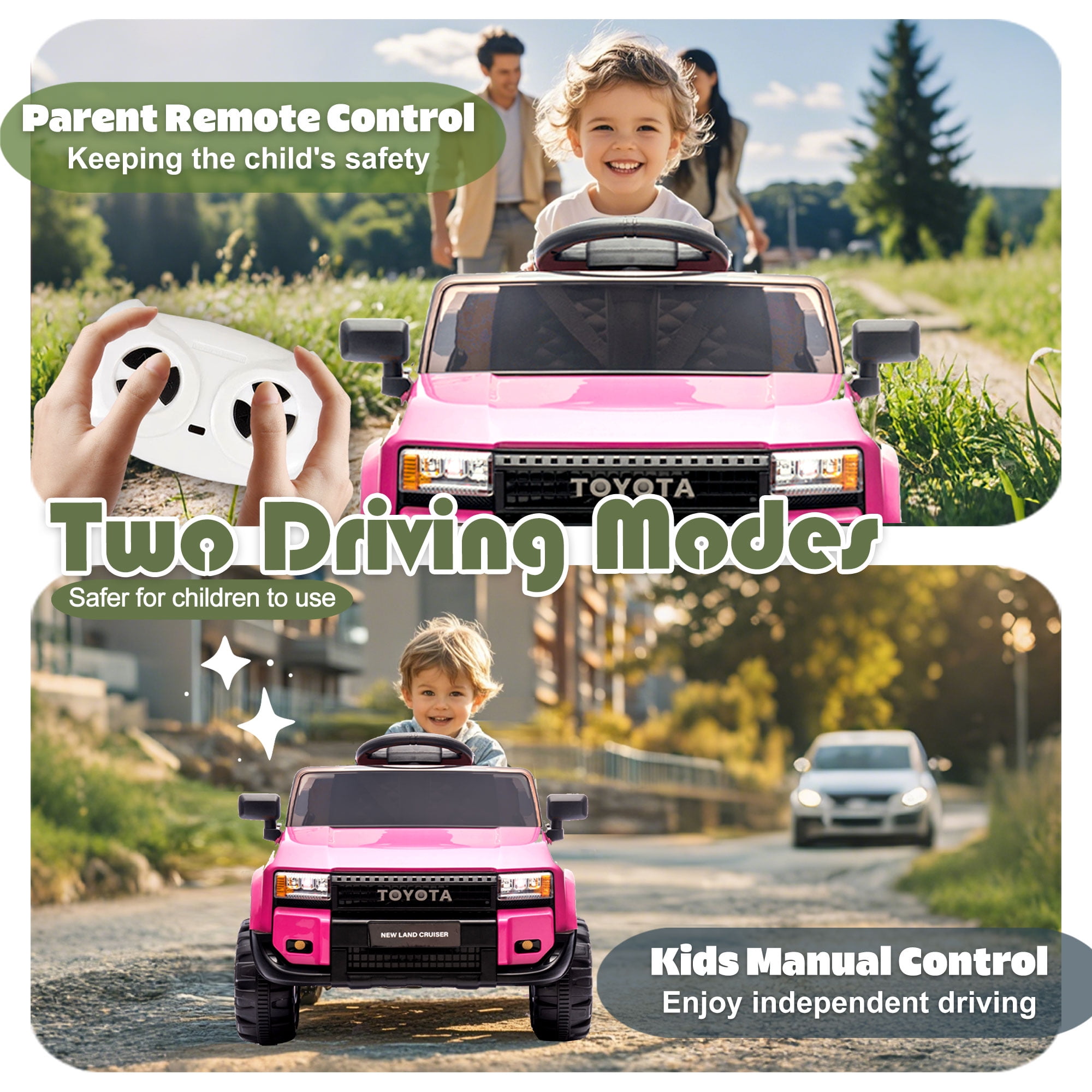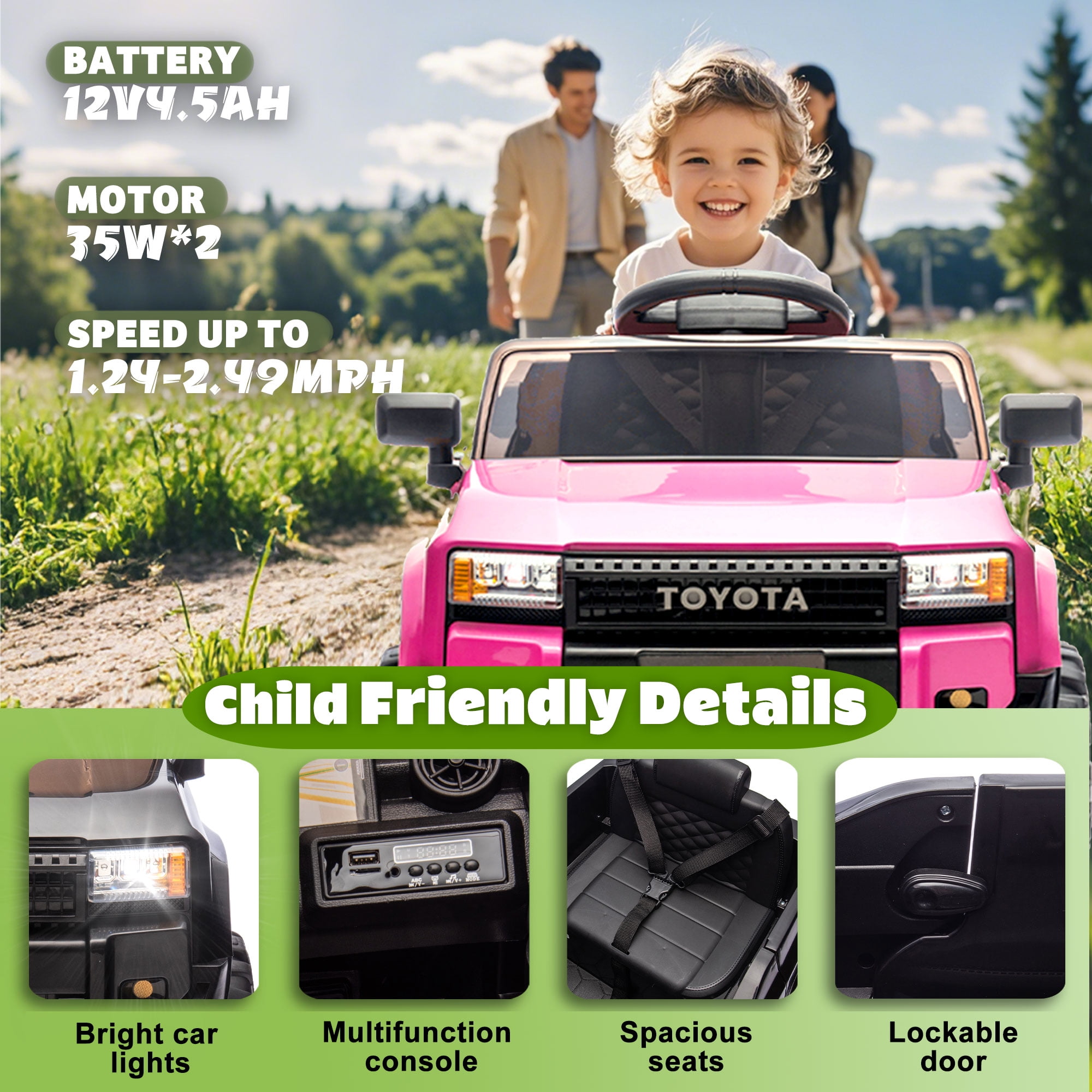 【Officially Licensed Toyota LC250 Ride on Car】The 12v ride on truck is designed to replicate the iconic Toyota LC250, allowing kids to enjoy a realistic driving experience just like their parents’ favorite SUV! It’s also very close to the full experience with LED lights, startup sounds, high and low speed adjustment, 4 wear-resistant wheels, doors that fully open and close to deliver an authentic driving experience that kids are sure to love. 【Fun Driving Experience】The electric vehicle equipped with a multi-functional music player; In addition to built-in music and stories, you can also use AUX input, USB port and a TF card slot, provide funny driving for unisex child. LED headlights of the kids electric car can be controlled with one click. Cute alphanumeric stickers come with the car, colorful and chic. 【12V 4.5AH Battery Electric Car for Kids】This ride on toys come with 12v battery for longer working time. Charging time typically ranges from 8-12 hours, influenced by usage and play intensity. Every time the battery is fully charged, children can enjoy up to 1-2 hours of gaming time. Speed is 1.24-2.49 mph. 【Safety Design】Three-point seat belt, double lockable door, soft start and emergency stop button are specially designed for kid’s driving safety. 2 springs and drive motor at the back of the car allow for smooth progress on sloping ground and rough terrain. 【2 Driving Modes】The parents can control their children’s electric vehicle through the remote control. Can also be driven by children themselves to enjoy the ride on toys. Max load capacity: 66lb. After-Sale Service: If you have any problem, just feel free to contact us. If missing any parts, we will arrange to ship missing parts to you soon. If damaged, we will refund/send replacement to you. Notice: If you do not use it for lone time, please keep charging the car once a month, to avoid battery run down, and even battery-damaged.
