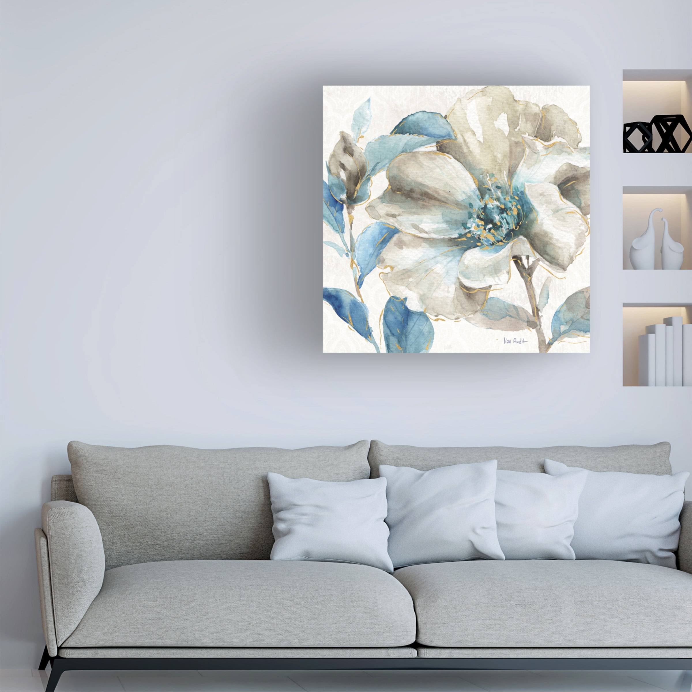 Artist: Lisa Audit Subject: Floral & Botanical Style: Contemporary Product Type: Gallery-Wrapped Canvas Art This ready to hang, gallery-wrapped art piece features a large blue and white flower with gold outlines. Lisa Audit loves the art of decoration, and she uses oil paints, acrylics, and pen and ink to create beautiful pieces of art. She finds inspiration from fine art masters such as Picasso, Manet, Rubens and Cezanne. Lisa lives in Canada with her two teenage daughters, and she creates much of her artwork in a spacious studio inside her home. Giclee (jee-clay) is an advanced printmaking process for creating high quality fine art reproductions. The attainable excellence that Giclee printmaking affords makes the reproduction virtually indistinguishable from the original piece. The result is wide acceptance of Giclee by galleries, museums, and private collectors. Gallery wrap is a method of stretching an artist’s canvas so that the canvas wraps around the sides and is secured a hidden, wooden frame. This method of stretching and preparing a canvas allows for a frameless presentation of the finished painting.