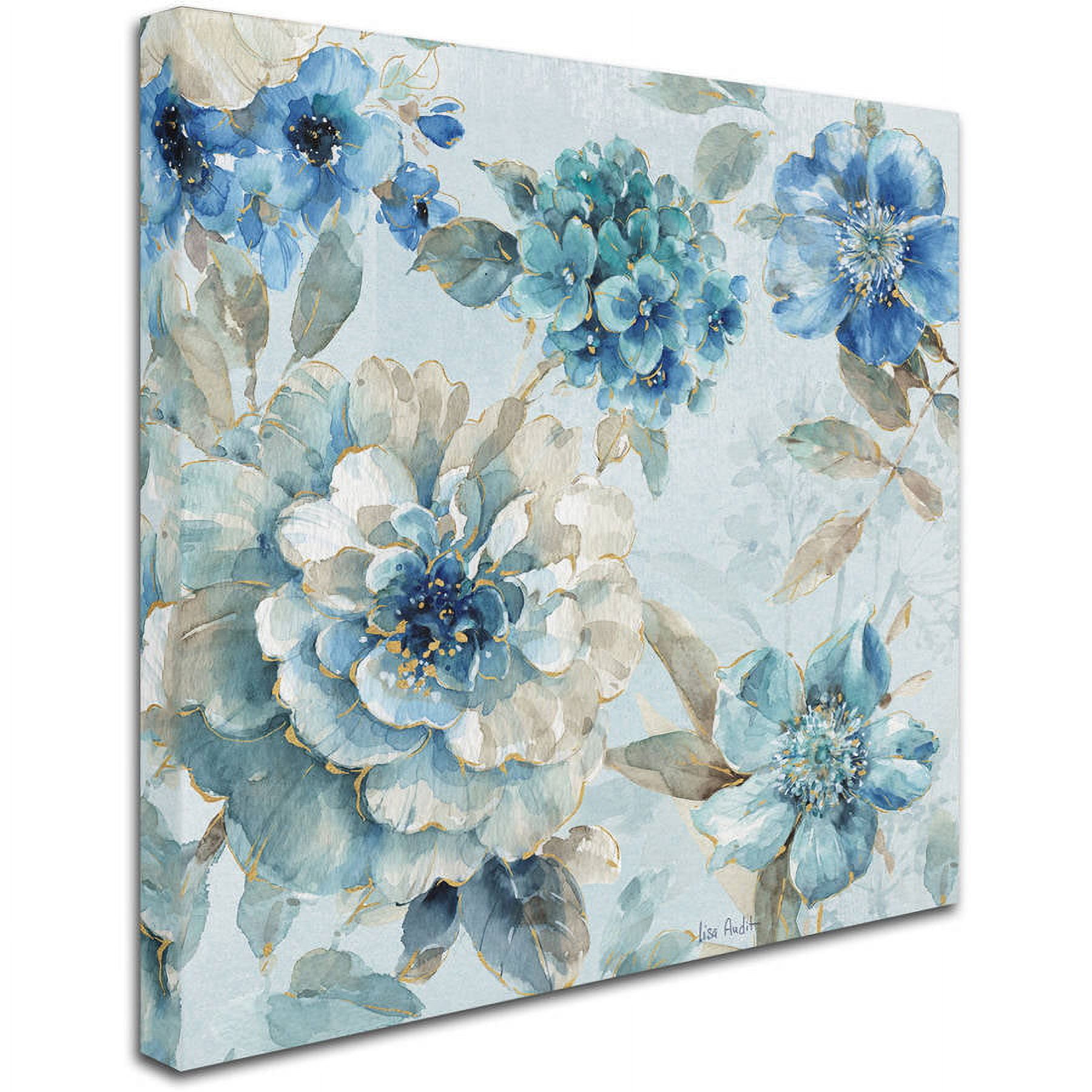 Artist: Lisa Audit Subject: Floral & Botanical Style: Contemporary Product Type: Gallery-Wrapped Canvas Art This ready to hang, gallery-wrapped art piece features a garden of blue and white flowers with gold outlines. Lisa Audit loves the art of decoration, and she uses oil paints, acrylics, and pen and ink to create beautiful pieces of art. She finds inspiration from fine art masters such as Picasso, Manet, Rubens and Cezanne. Lisa lives in Canada with her two teenage daughters, and she creates much of her artwork in a spacious studio inside her home. Giclee (jee-clay) is an advanced printmaking process for creating high quality fine art reproductions. The attainable excellence that Giclee printmaking affords makes the reproduction virtually indistinguishable from the original piece. The result is wide acceptance of Giclee by galleries, museums, and private collectors. Gallery wrap is a method of stretching an artist’s canvas so that the canvas wraps around the sides and is secured a hidden, wooden frame. This method of stretching and preparing a canvas allows for a frameless presentation of the finished painting.
