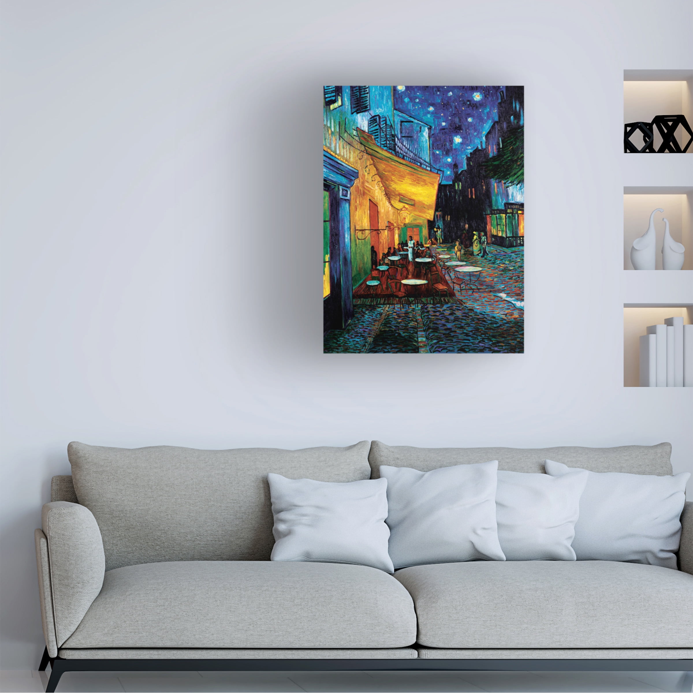 Trademark Fine Art “Cafe Terrace” Canvas Art by Vincent van Gogh: Ready to hang High quality Printed using giclee, which is an advanced printmaking process Reproductions are virtually indistinguishable from the originals Giclee is accepted by many galleries, museums and private collectors Gallery wrapped so that the canvas wraps around the sides and hides the wooden frame Allows for a frameless presentation of the finished painting