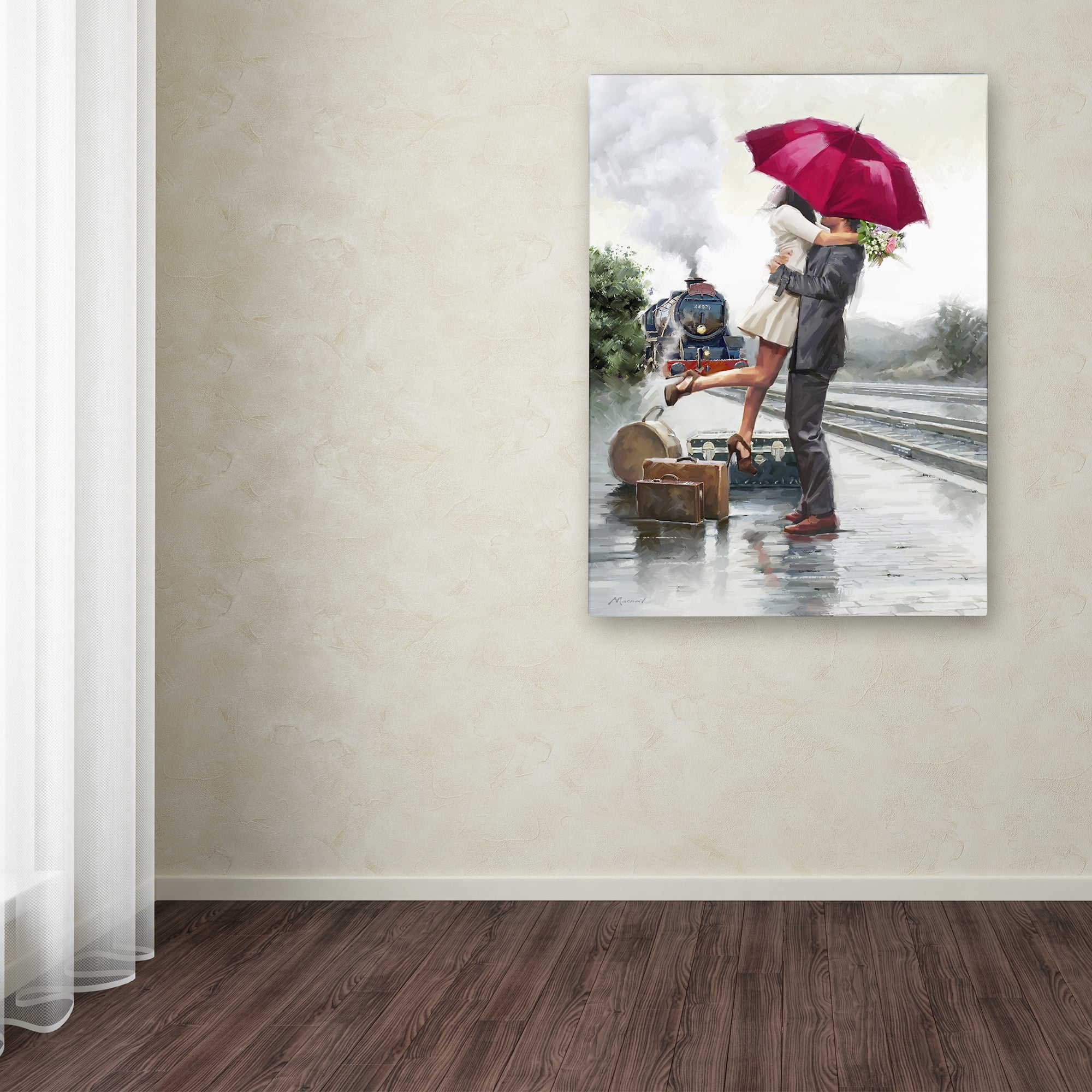 Artist: The Macneil Studio Subject: Transportation Style: Modern & Contemporary Product Type: Gallery-Wrapped Canvas Art This ready to hang, gallery-wrapped art piece features a couple embracing on the platform as the train approaches. Giclee (jee-clay) is an advanced printmaking process for creating high quality fine art reproductions. The attainable excellence that Giclee printmaking affords makes the reproduction virtually indistinguishable from the original piece. The result is wide acceptance of Giclee by galleries, museums, and private collectors. Gallery wrap is a method of stretching an artist’s canvas so that the canvas wraps around the sides and is secured a hidden, wooden frame. This method of stretching and preparing a canvas allows for a frameless presentation of the finished painting.