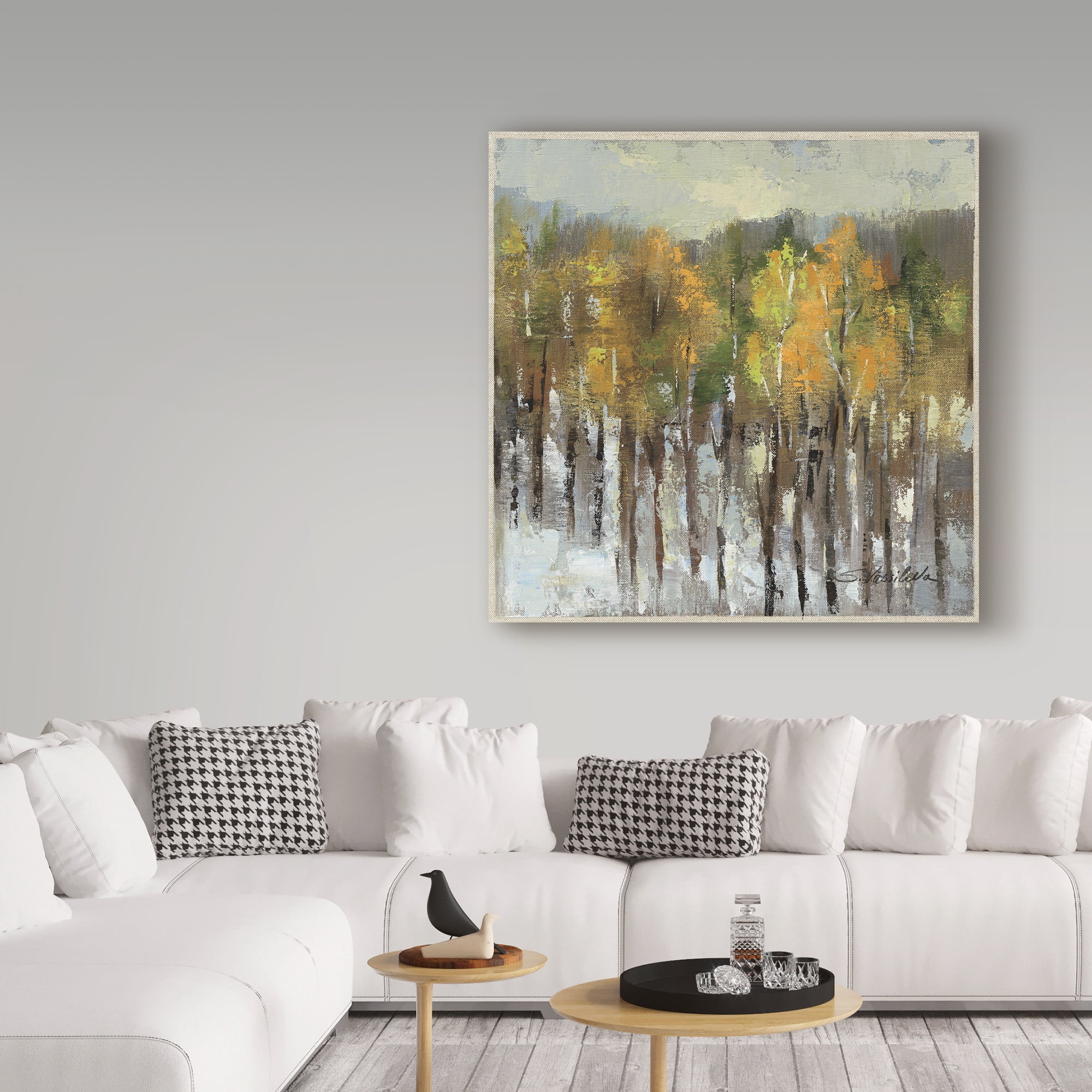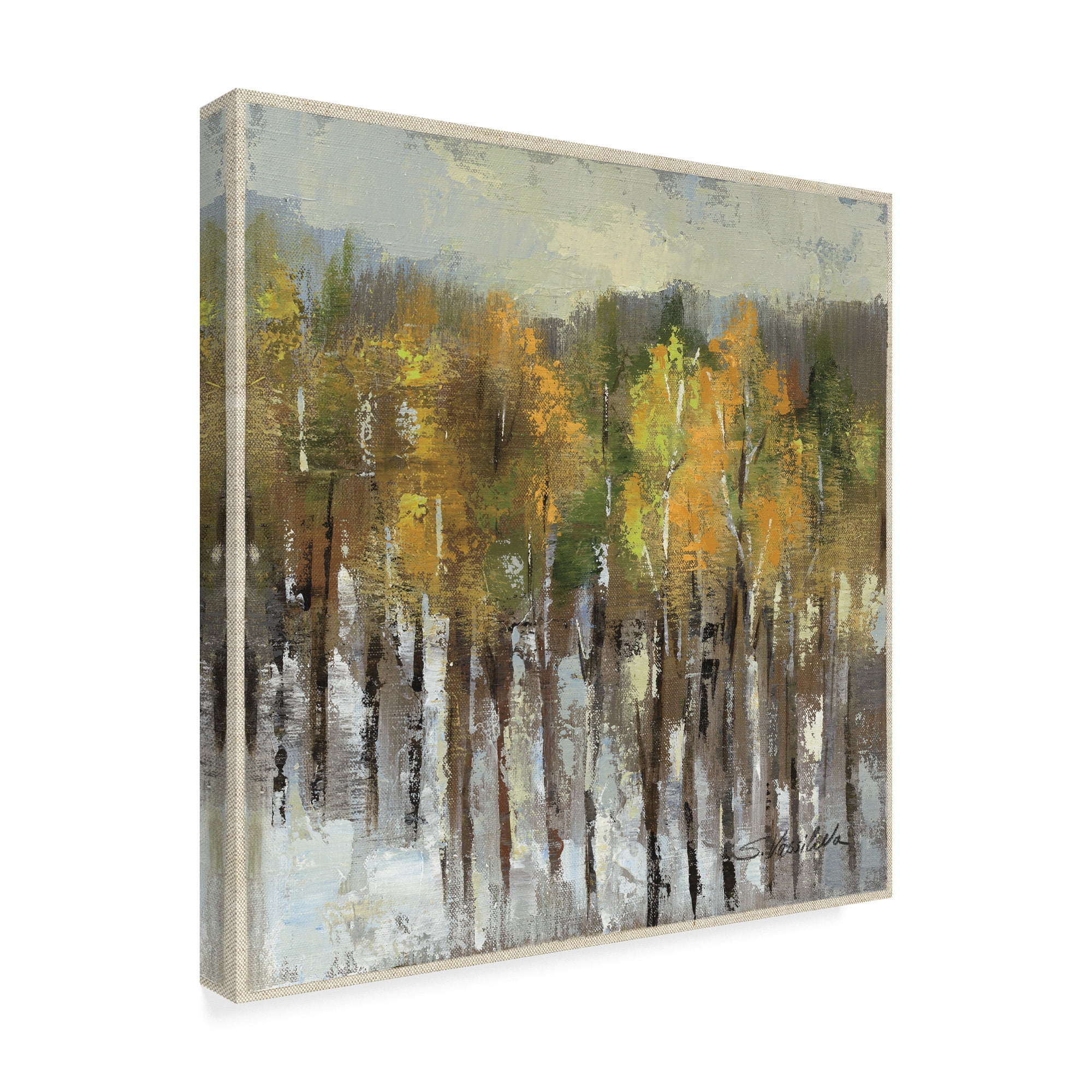 Artist: Silvia Vassileva Subject: Landscape Style: Modern & Contemporary Product Type: Gallery-Wrapped Canvas Art This ready to hang, gallery-wrapped art piece features thin trees full of green, brown, and yellow leaves on a grey and white background. Silvia Vassileva pursued her love of art at the Academy of Fine Art in Bulgaria, where she earned both her bachelor’s and master’s degrees. She spent six years painting and exhibiting her work in Japan before moving to the U.S. Silvia describes her style as very free and bold. She makes her paintings come alive by using contrast and unusual color palettes. Silvia’s home studio, which she designed herself, is bright, contemporary and minimalist. Giclee (jee-clay) is an advanced printmaking process for creating high quality fine art reproductions. The attainable excellence that Giclee printmaking affords makes the reproduction virtually indistinguishable from the original piece. The result is wide acceptance of Giclee by galleries, museums, and private collectors. Gallery wrap is a method of stretching an artist’s canvas so that the canvas wraps around the sides and is secured a hidden, wooden frame. This method of stretching and preparing a canvas allows for a frameless presentation of the finished painting.