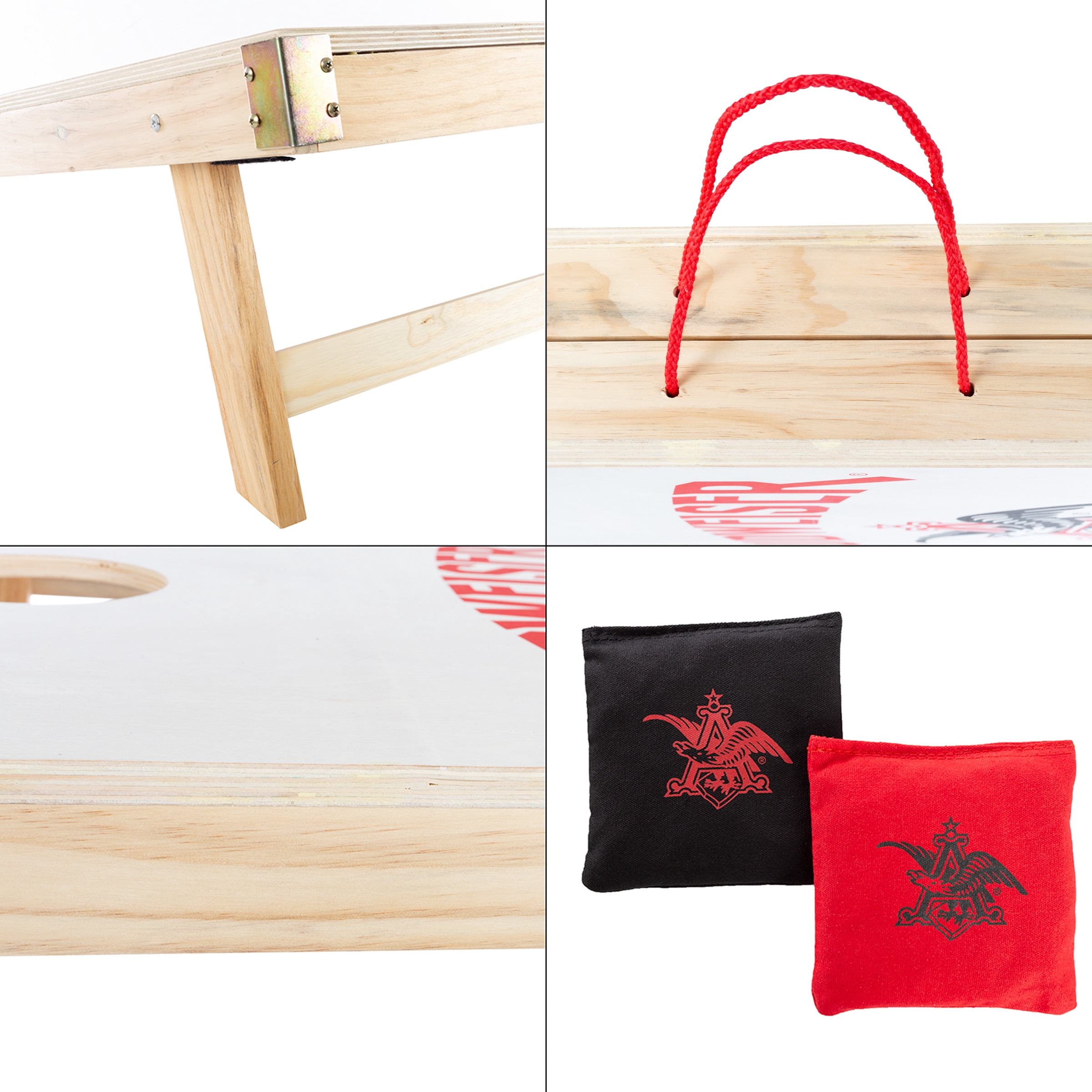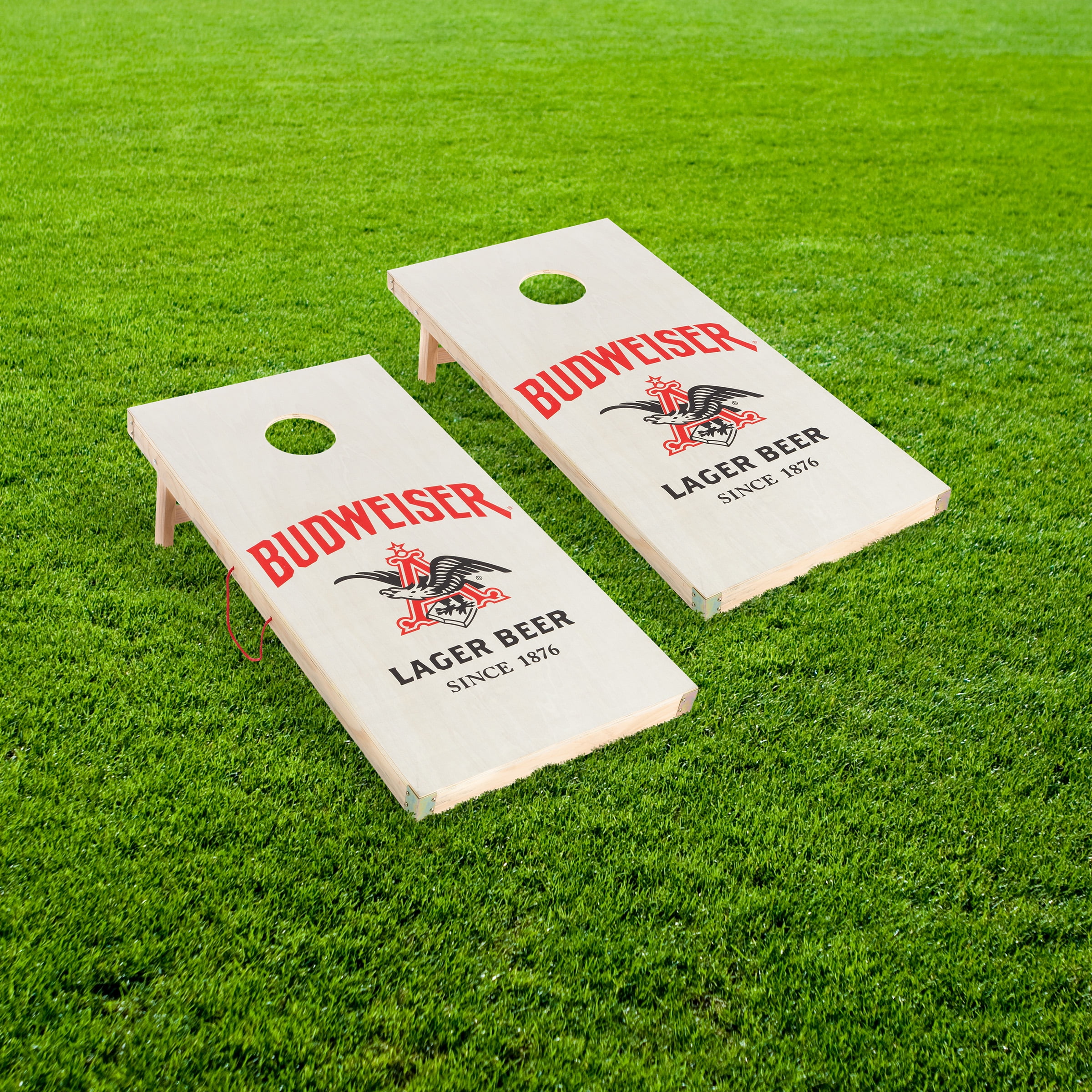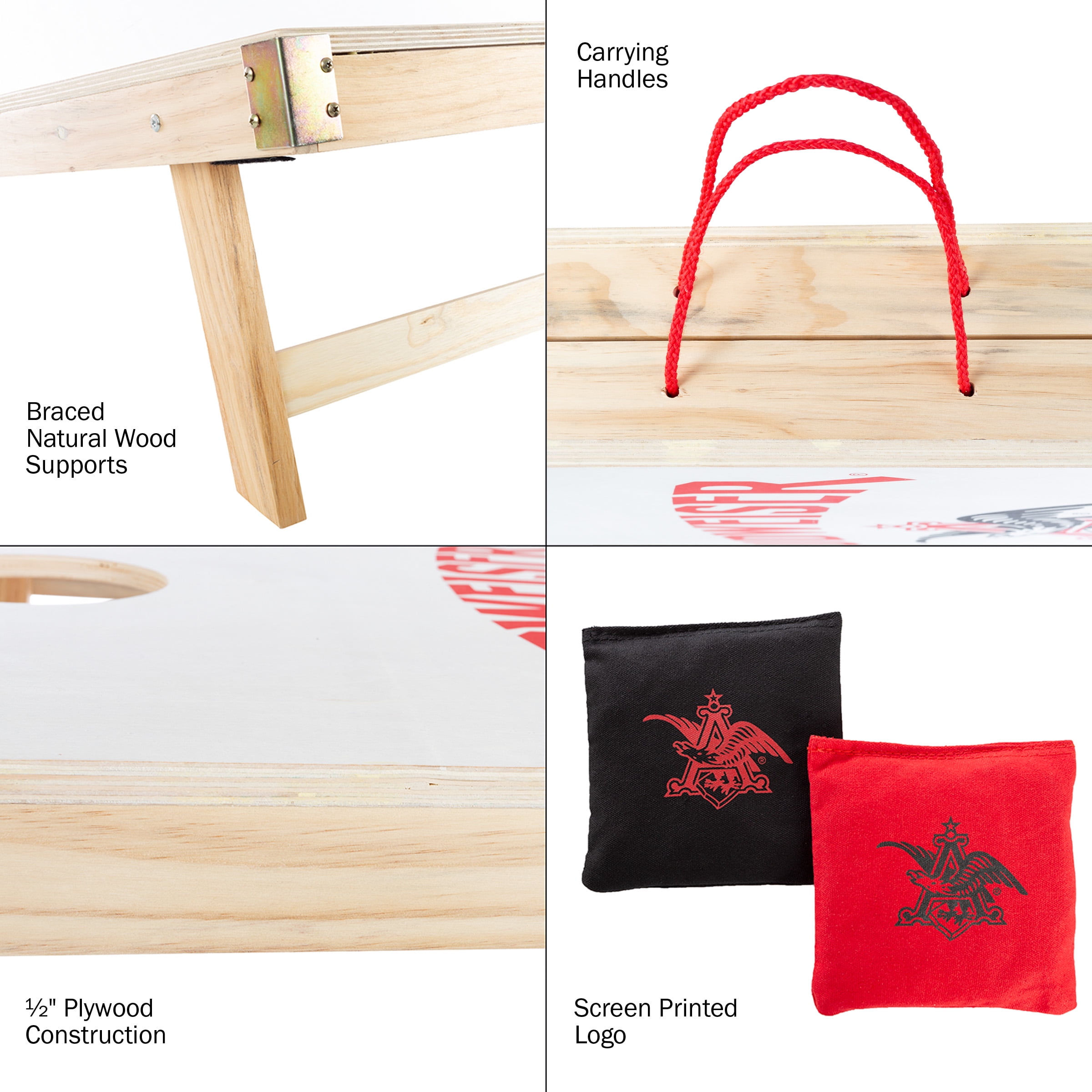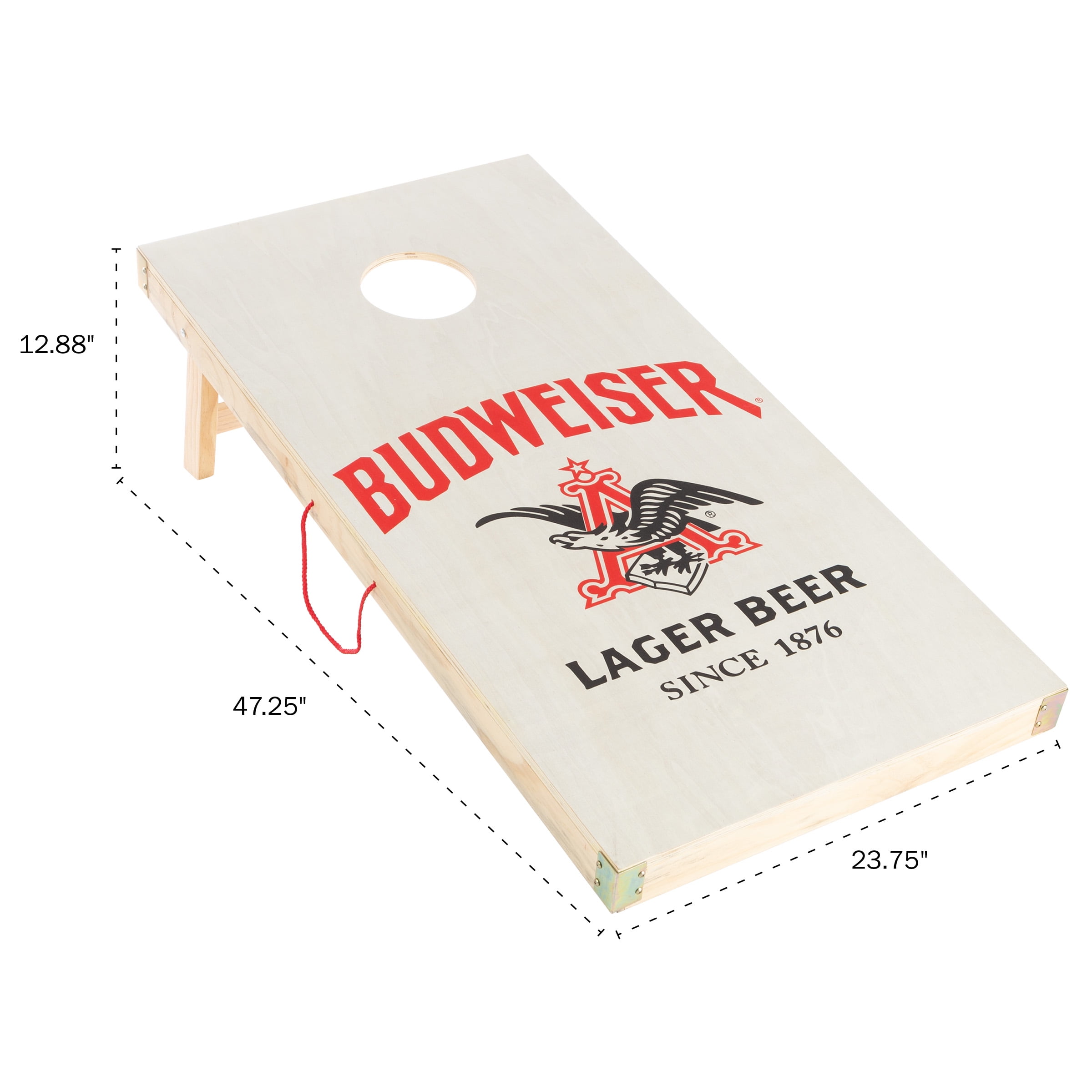 REGULATION CORNHOLE BOARDS – This regulation sized corn hole set will score big whether you are playing at a tailgate, at a backyard barbeque party, or at an official tournament. VINTAGE DESIGN – Beer fans will love the look of these cornhole boards screen printed with a vintage Budweiser logo on their smooth surface. BEAN BAGS INCLUDED – You also get 4 red and 4 black 6×6-inch square bean bags that are screen printed with the Anheuser Busch logo in contrasting colors. DURABLE CONSTUCTION – The corn hole boards have a wood frame with a cross beam for added strength and is topped with ½-inch thick plywood for lasting use. PORTABLE – This bean bag toss game is easy to transport with folding legs and convenient carry handles to your next family gathering, cookout, campsite, social event, or indoor competitions. MATERIALS – Plywood and Wood. DIMENIONS (Standing and Ready for Play) – (L) 47.25 x (W) 23.75 x (H) 12.88-inches