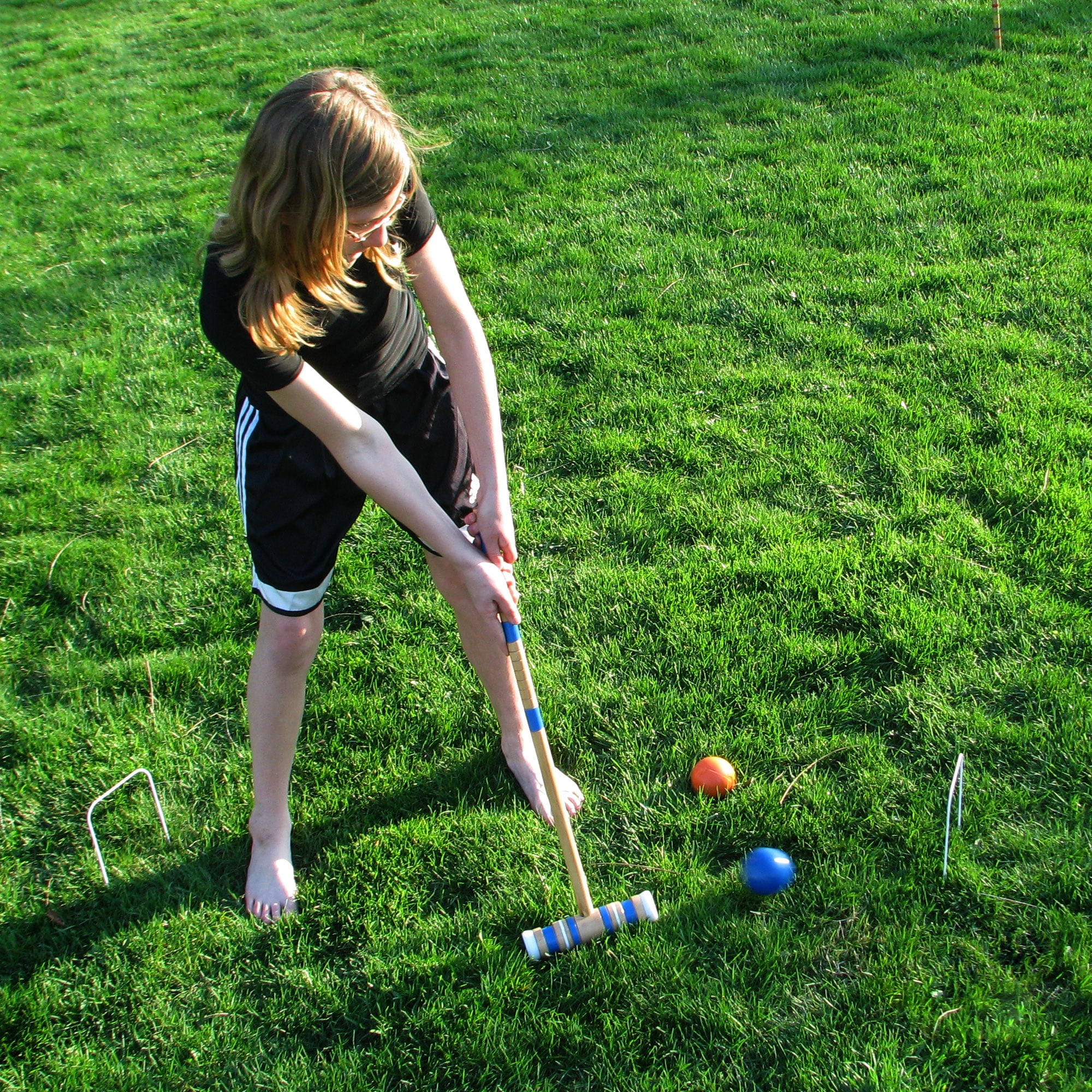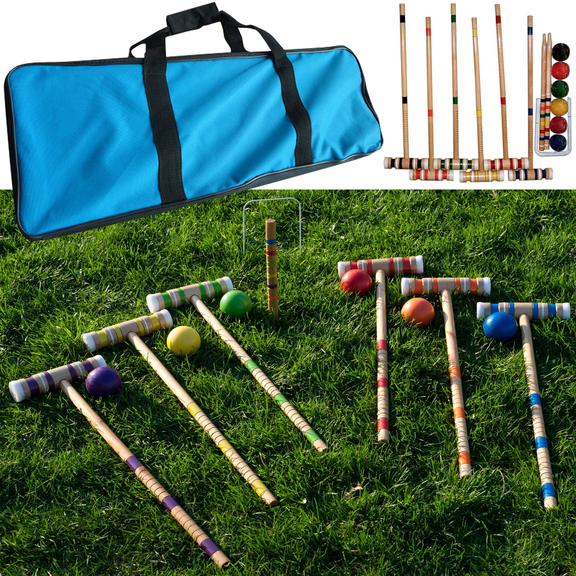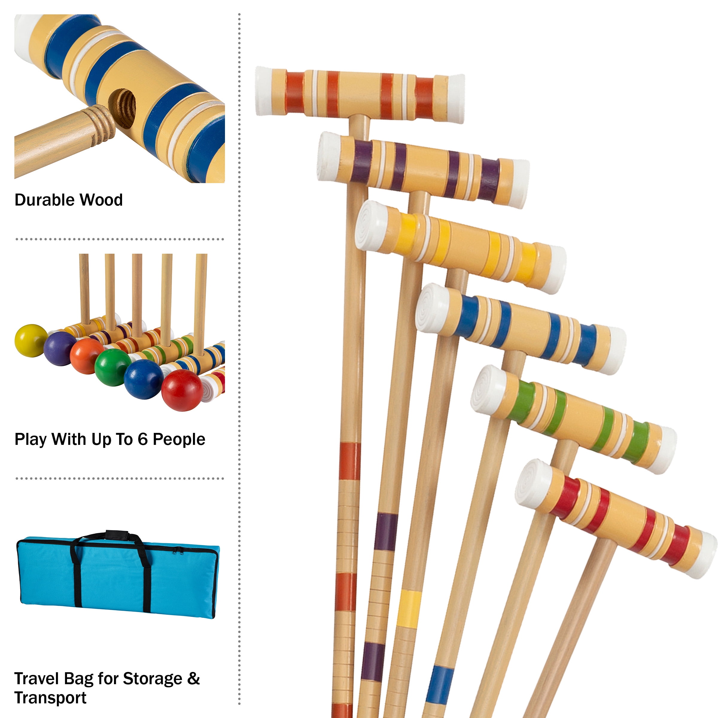 Trademark Games Durable Complete 6 Player Croquet Set 6 solid wood mallets, each measuring 26 inches, featuring 1.85-inch diameter cushion-capped heads Includes a carrying case for easy transport and storage 6 durable 3-inch croquet balls designed for long-lasting play Constructed with a durable and long-lasting design for outdoor use 2 solid wood stakes for setting up your game 9 coated weather-protected wire wickets for enhanced durability Designed for 6-player action, perfect for family gatherings and parties