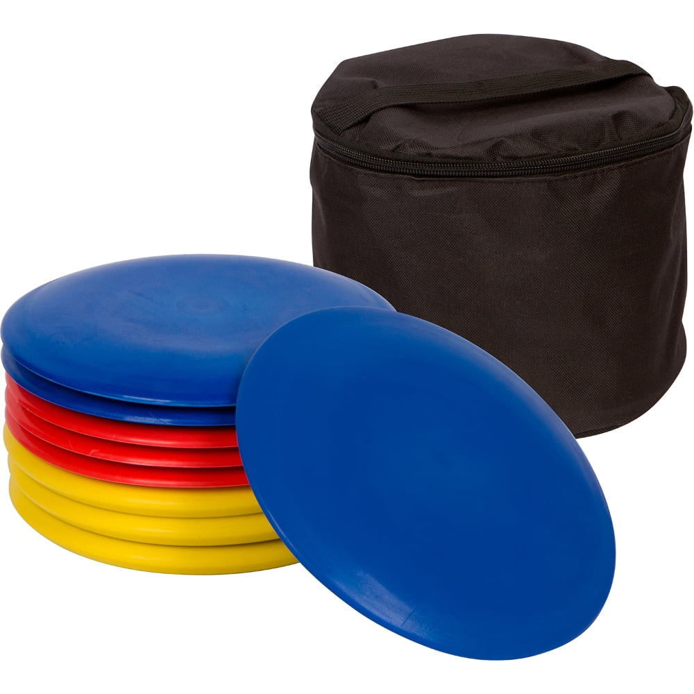 Easily set up this portable metal disc golf set at a picnic, outdoor party, or beach. Ideal for all skill levels. Disc golf basket with trapper basket and double chains is easy to assemble, no tools needed, and instructions included. The Disc Golf Starter Kit is great for practicing in your back yard or take it on the go and use it at picnics, barbeques, or outdoor get-togethers. The Disc Golf Starter Kit is a great alternative to corn hole, horseshoes, or Kan- Jam. Use the 9 discs, which are included, to test your accuracy and precision at hitting the target. Made with durable and weather-resistant materials, this fun outdoor game of skill is sure to be a winner. Discs included: Include 6 discs (2) drivers, (2) mid-range discs, and (2) putters. Best choice for having everything needed to play the game. Disc driver specs: Speed 9, glide 5, turn -3, fade 1. Mid-range specs: Speed 4, glide 4, 0 turns, 3 fades. Putter specs: Speed 2, glide 3, turn 0, 2 fade Drivers – blue, Mid-range- Red, Putter- Yellow. Do not leave outside in the weather for long periods of time. By Trademark Innovations.
