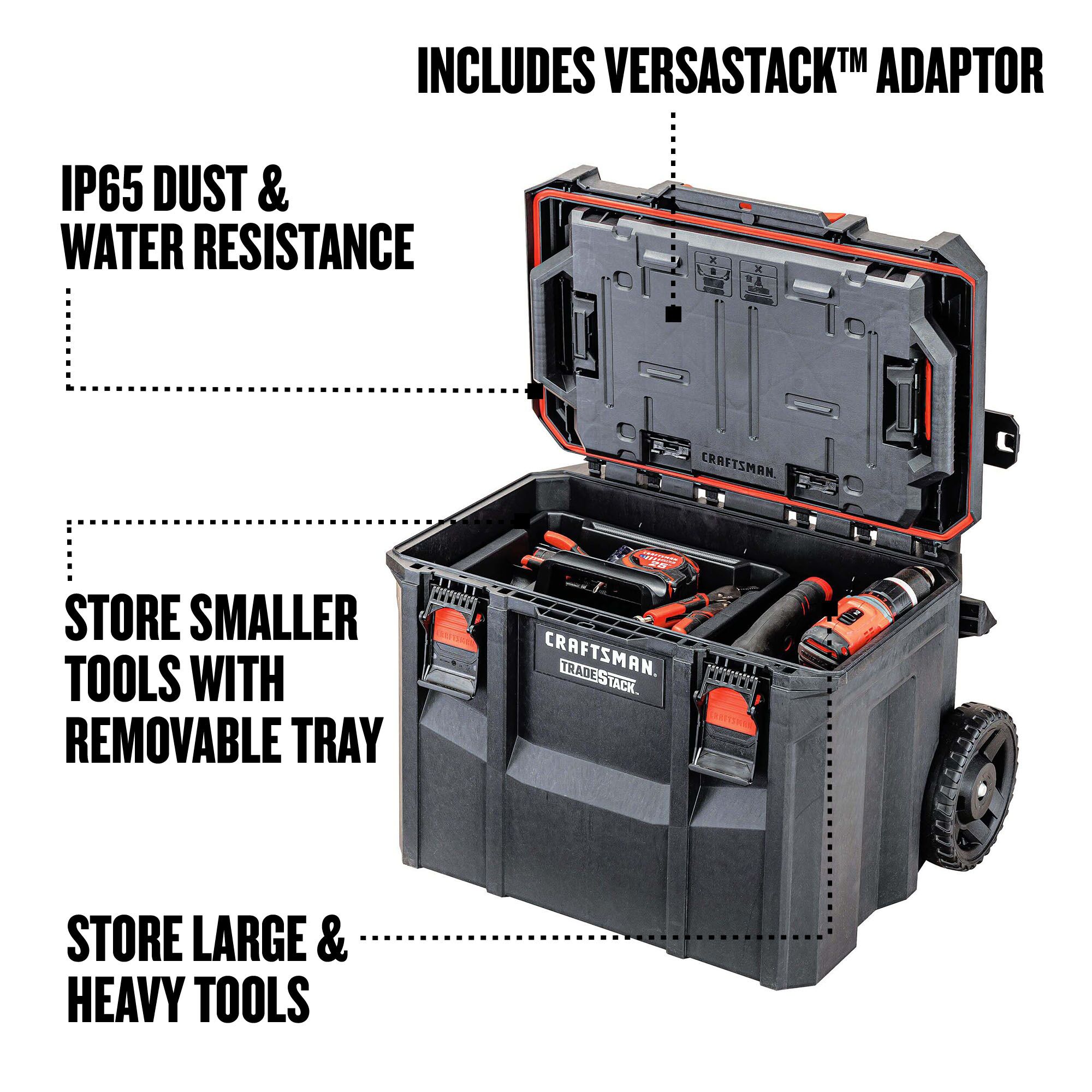 Suitable for any outdoor job or project that requires moving bulky tools from place to place, the TRADESTACK™ Rolling Unit features durable 7 in. wheels that help enable easy transport within your workspace. Also included are a removable tray, integrated electric cable holder and tool clop holder, and a tilting footrest designed for your comfort. Plus, it is IP65 rated for dust and water resistance for lasting durability.