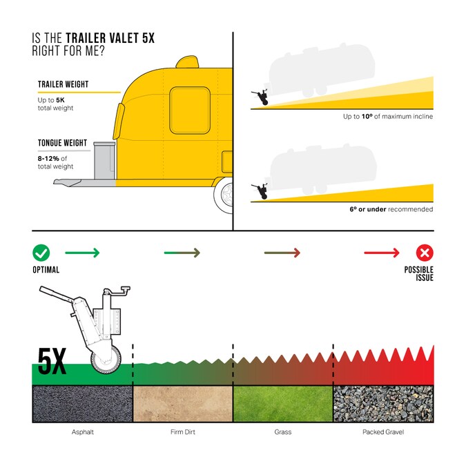 - Recommended for use on a flat, concrete-like surface – product performance may decrease on inclines, loose surfaces, and with evenly distributed trailer weight
