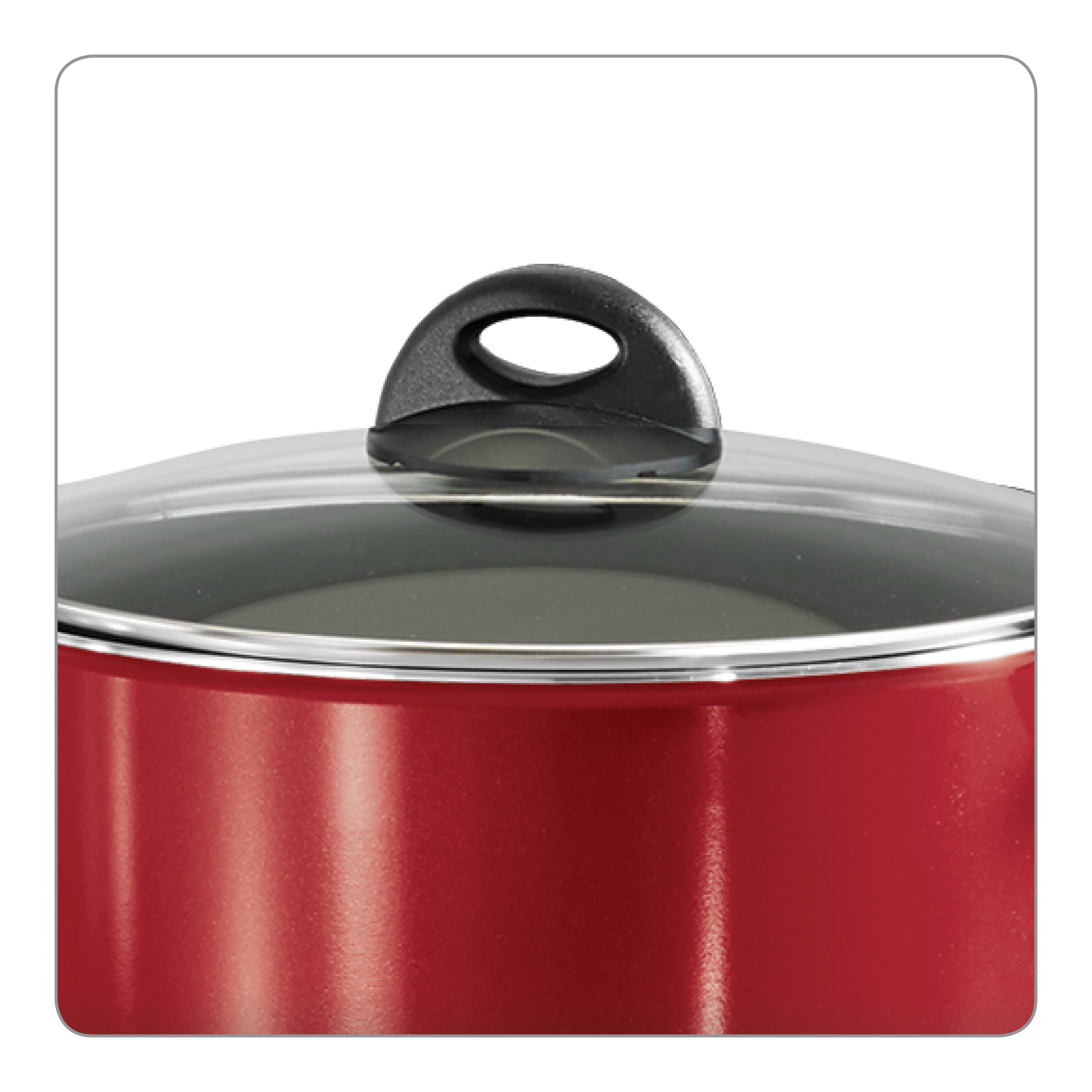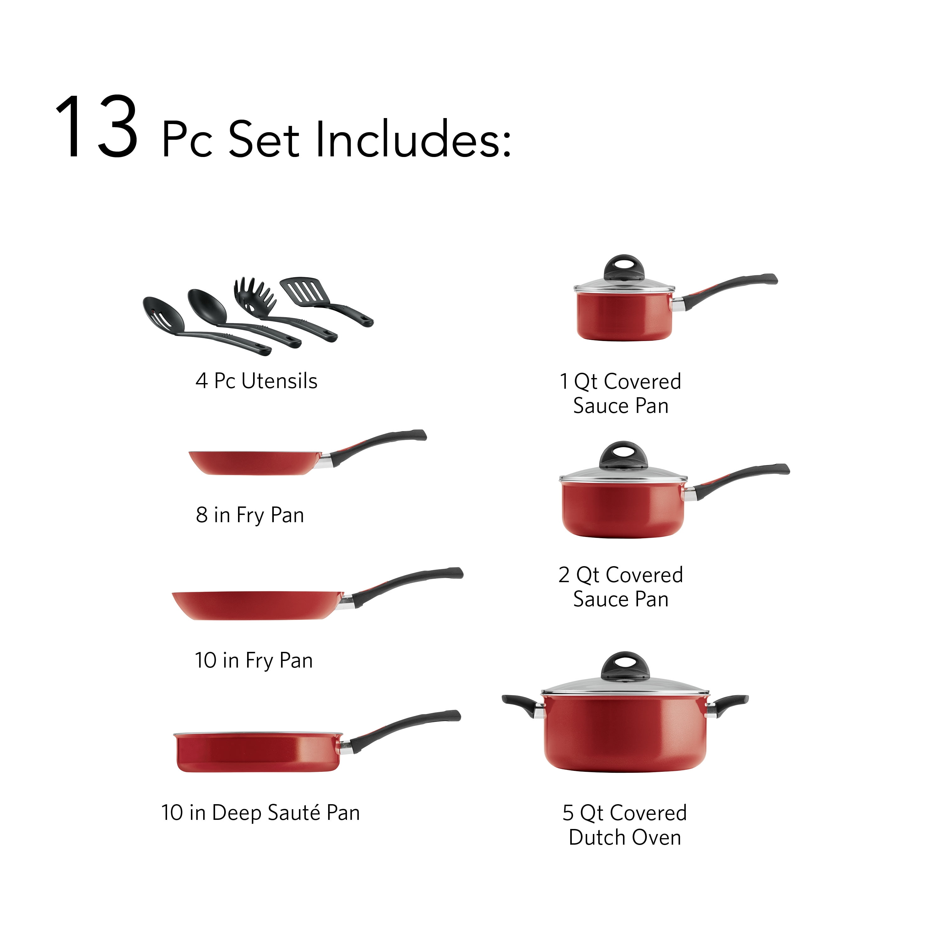 Teflon-coated interior prevents food from sticking Tramontina 13-piece cookware set makes cooking easy Cleanup is easy after use Includes 8″ saute pan, 10″ saute pan, 10″ open deep saute pan, 1 qt covered saucepan, 2 qt covered saucepan and 5 qt covered Dutch oven Also includes solid spoon, slotted turner, slotted spoon and pasta spoon Tempered glass lids Bakelite handles Attractive red color Compatible with gas, electric and ceramic stoves