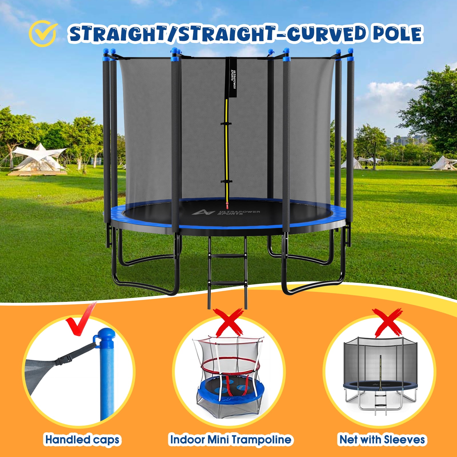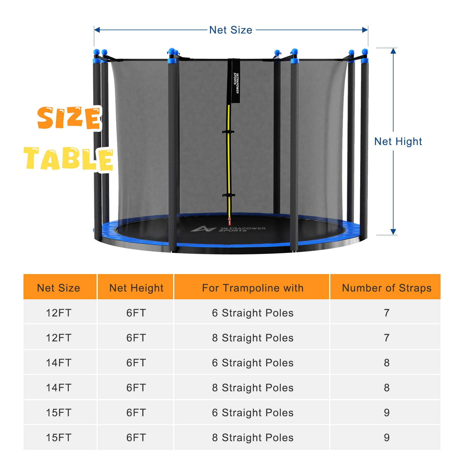 NOTE: Please confirm your Trampoline’s TYPE, size and count the number of poles before ordering. Soft durable PE Material Safety Net, which is UV resistant and NON-TOXIC even though under high temperture. Come with safety zip buckles. High density mesh makes it more solid and durable,and fine weave to ensure little fingers cannot become trapped. High density mesh makes it more solid and durable,and fine weave to ensure little fingers cannot become trapped. The 6.1 ft/ 1.86m height net can prevent the kids jumpping outside of the trampoline. Netting with 3 Arched Supports or 6 Straight Poles, for 15ft round frame trampolines.Easy to fit and Install Netting with 3 Arched Supports or 6 Straight Poles, for 15ft round frame trampolines.Easy to fit and Install