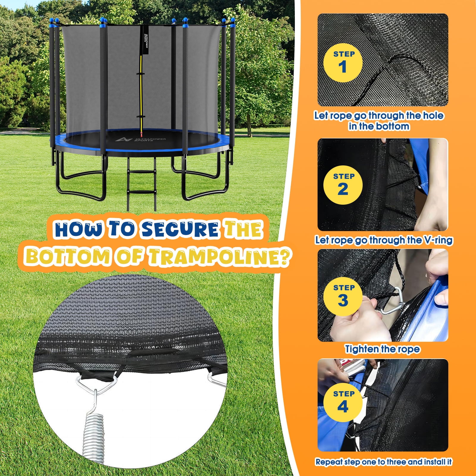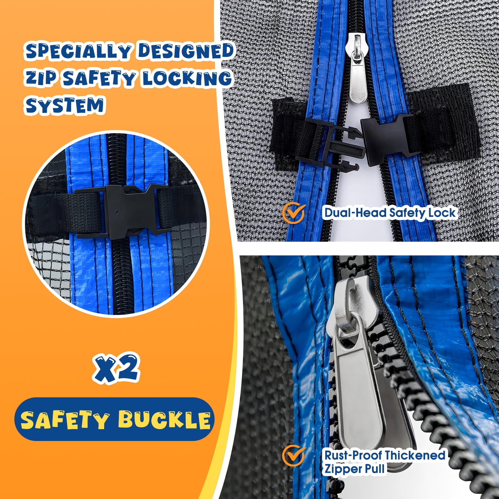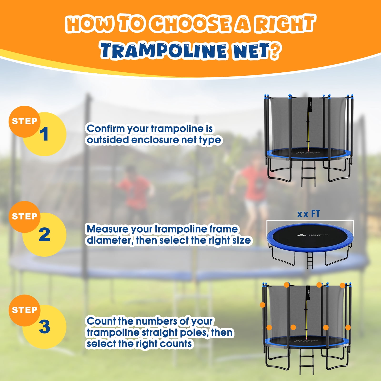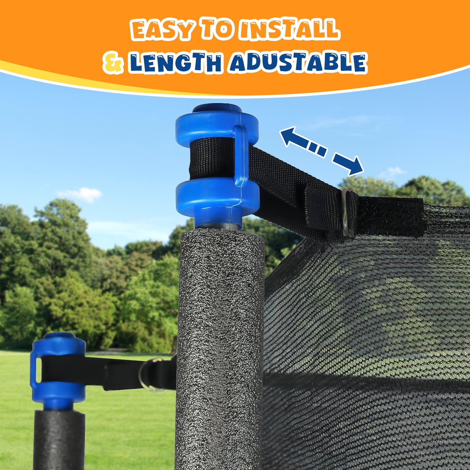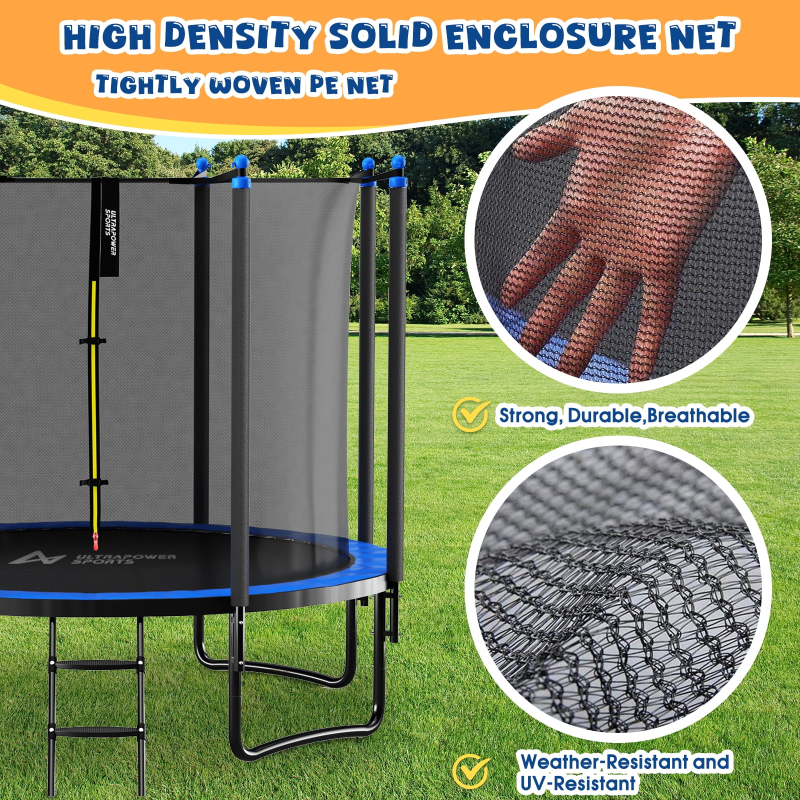 Trampoline Replacement Net (NET ONLY) for Round Trampoline Using Variant Poles and Arches safety net in the following sizes: 12 13 14 15 16 FT Height: 186cm (1.86m) Safety net Color: Black Sleeve Color: Black Material: PE + PVC, Heavey duty 150g / m² Maschen, 100% UV resistant, waterproof and no color change even after several hours in the sun. Note: Warning: Not suitable for children under three years Net only, It does not come with poles or fixings s High-Quality Material Material: PE (polyethylene) Heavy duty 150g / m2 mesh UV resistant Anti-corrosive Anti-degradation Reduce the degree of embrittlement and oxidation, the safety coefficient is much higher than normal PE coating, synthetic, and nylon. All TUV, GS, and CE certified. It is able to give the maximum protection for children, teenagers, or adults and we sincerely ensure its high performance for years to come. Net Zipper Closure Bright yellow+red reversible closure zipper makes use easier. INSIDE and OUTSIDE Zipper with Velcro clip for TRIPLE protection. Minimize the risk of falling, and free you from worries. High-Quality Mesh High-density mesh makes it more solid and durable, and it is a fine weave to ensure little fingers cannot become trapped. High-Quality Sleeve Weatherproof PVC (Polyvinyl chloride) sleeve can effectively protect your trampoline from oxidation and extend the service life. Package Included 1*Safety net only (Not include poles, trampoline, or fixings) Measuring Tips to Help You Determine Your Trampoline Enclosure Replacement Step 1: Confirm the type of your trampoline, measure the frame from one outside edge vertically and horizontally to the other outside edge so you get the correct measurements. Step 2: Determine the number of poles or arches that the net will need to connect to. Step 3: Based on the frame size and number and type of poles, see how this net will be installed on your trampoline. Our net is fitted by sliding the sleeves over the poles.