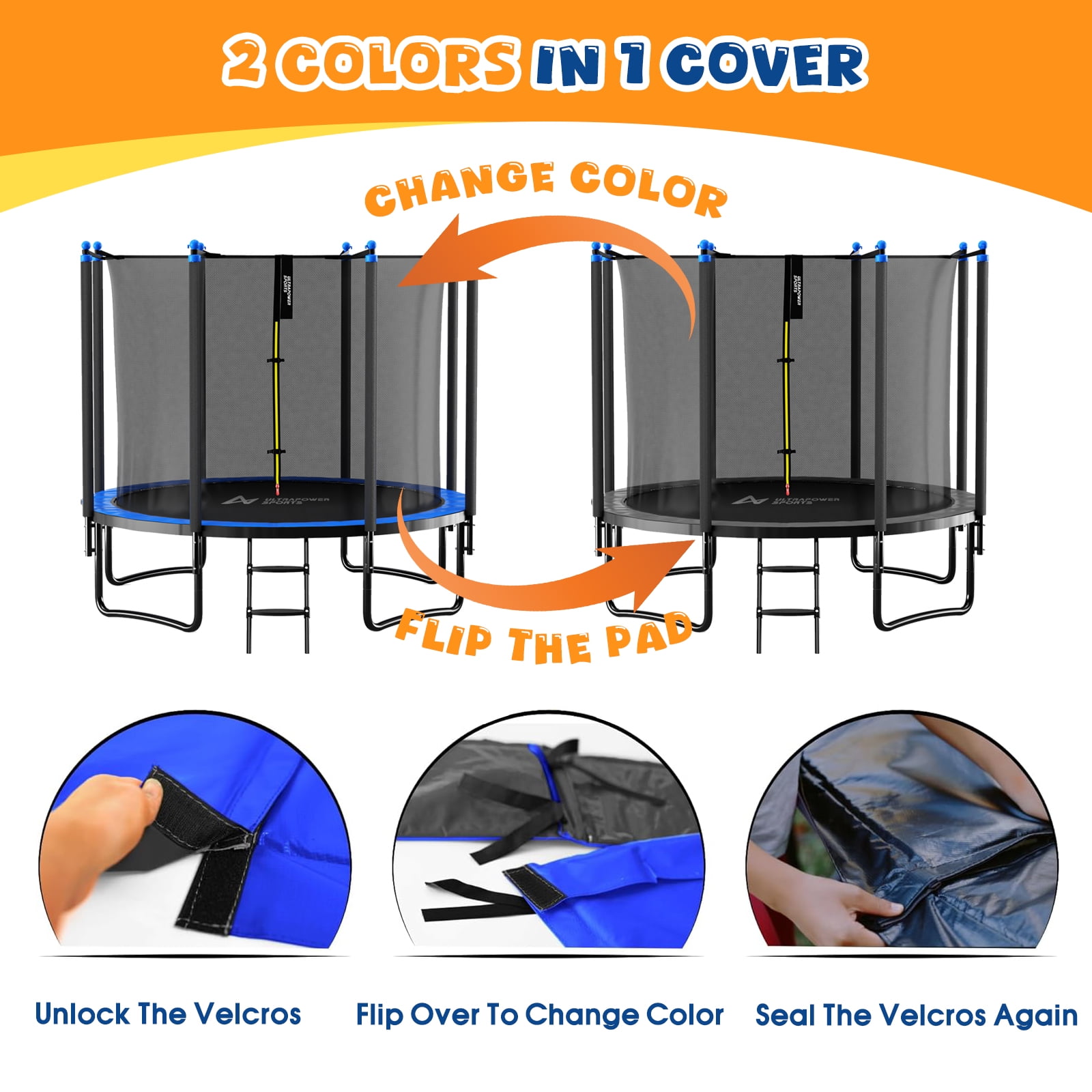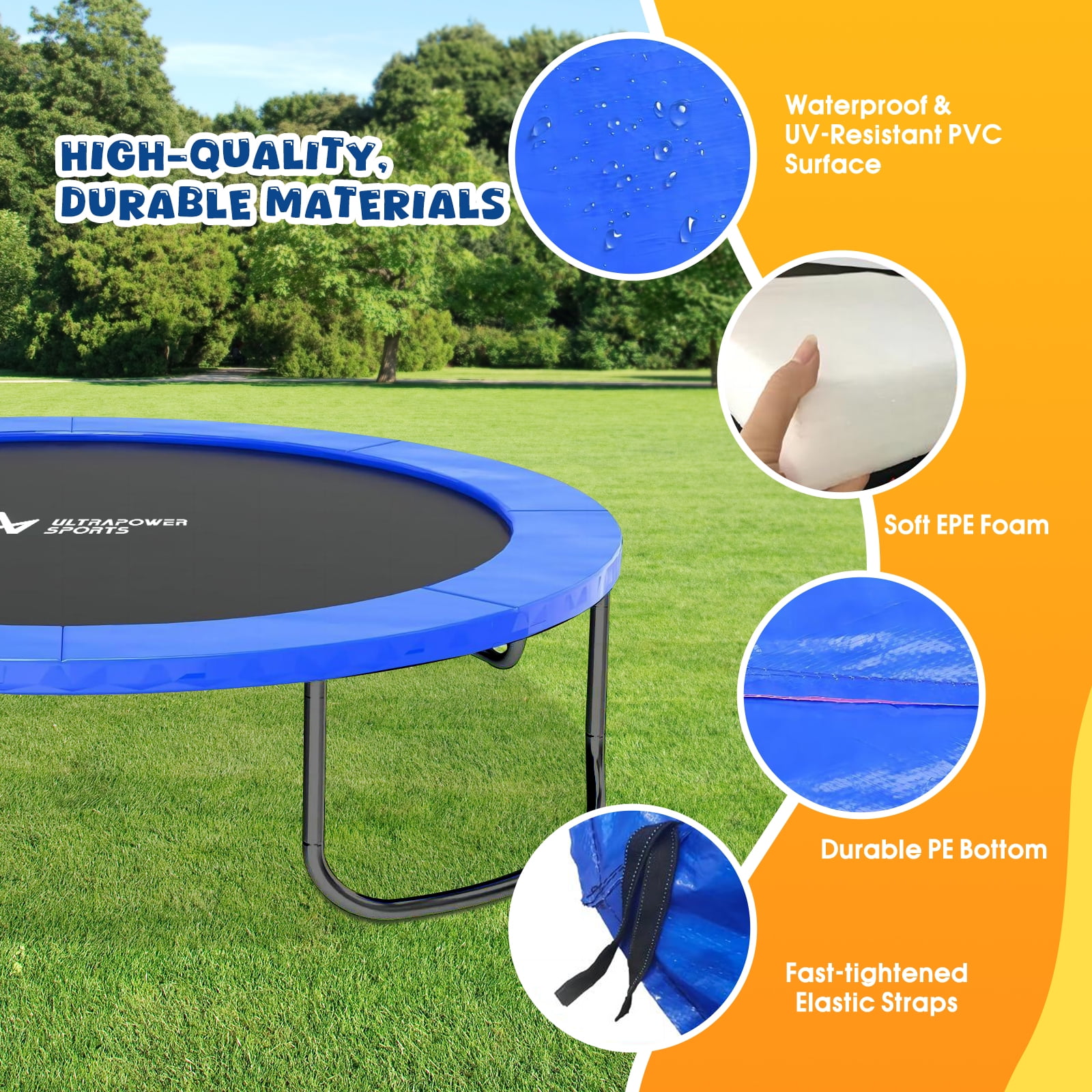 【2 Colors in 1 Trampoline Pad】This trampoline pad replacement with a double-PVC design, contains one blue side and black the other. It means you can change the color timely without buying a new one. TWO colors are available in ONE pad. Just flip the spring pad upside down, and with an easy velcro connection system, you can immediately change your trampoline’s color. Express your creativity in seconds, making it a statement of fun and individuality. 【Designed for Kids’ Safety】Our outdoor trampoline pad replacement is specifically designed with children’s safety in mind. This 14 FT trampoline replacement pad which the surface is made from soft 320gsm PVC material, effectively preventing children from being hurt by springs that could cause injury while jumping. Additionally, this trampoline pad 14 Foot is filled with 0.6 inches of thick EPE foam, which provides excellent shock absorption during jumps, creating a safer jumping environment 【Easy Installation and Replace】Installing and replacing our outdoor trampoline spring cover pads is a breeze. Simply lay the pad over the springs and secure it in place with the elastic band at the bottom—no extra steps required. Even parents who may not be particularly handy can complete the installation within minutes, making it a hassle-free experience. The 14 FT trampoline pads also feature an elastic band on the bottom, ensuring they stay securely in place over the springs without shifting 【Suitable for All-Weather Outdoor Use】Our trampoline pad 14 FT trampoline spring cover pad is specifically designed for outdoor use. The PVC material on the surface has undergone 2,000 hours of UV resistance testing, making it not only UV-resistant but also waterproof and durable. This means the pads will not fade or tear even after prolonged exposure to the elements. They are perfect for providing a safe and reliable jumping environment for children, rain, shine and snow 【Extra Wilder for More Specifications】This trampoline pad replacement is designed to fit 14 foot trampolines. With 11.5 inches / 29 cm width covering the area, this trampoline pad is suitable for spring lengths of 5.5″, 6.5″, up to 7″, which means suitable for the majority of 14 foot trampolines in the market 【Durable Materials for Extending Serving Life】This 14 FT trampoline pad replacement is made from high-quality PVC, PE, and EPE, ensuring that each component is built to last. This durability not only saves you money on replacements but also effectively protects the springs from rusting, extending the life of your trampoline. Even with long-term outdoor use, you won’t have to worry about material degradation or deformation 【Folding Design & Compact Size】All Our outdoor trampoline replacement pads feature a segmented design that allows for easy folding. This makes it convenient to store when not in use, significantly saving space and ensuring they don’t take up too much room. Whether you’re storing them indoors or outdoors, you’ll find the perfect spot for these pads without any hassle 【Without Holes for Net Poles】please note that ULTRAPOWER SPORTS trampoline pads DO NOT have slots for net poles. If your trampoline poles are inside the trampoline steel frame, you may need to cut the pad by yourself