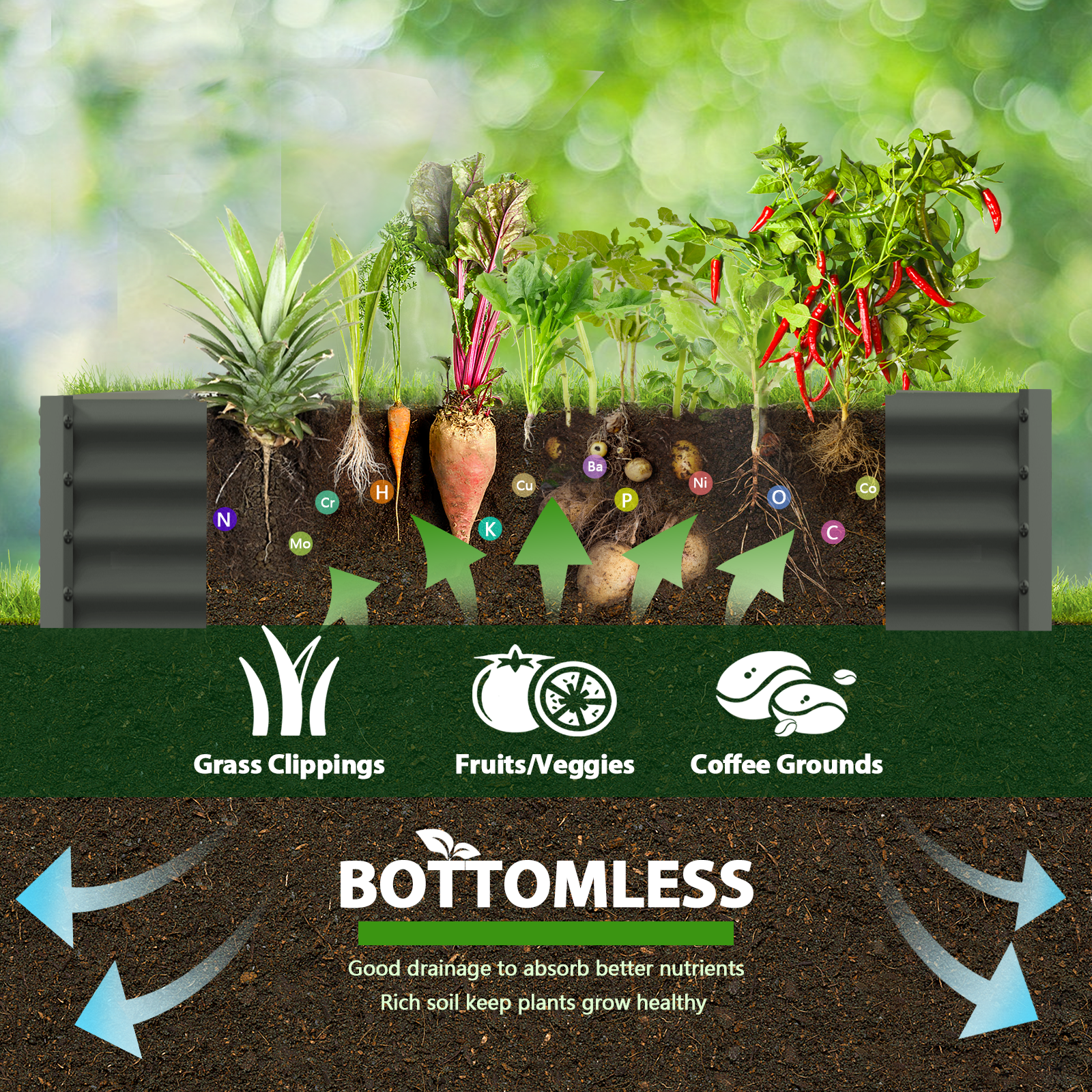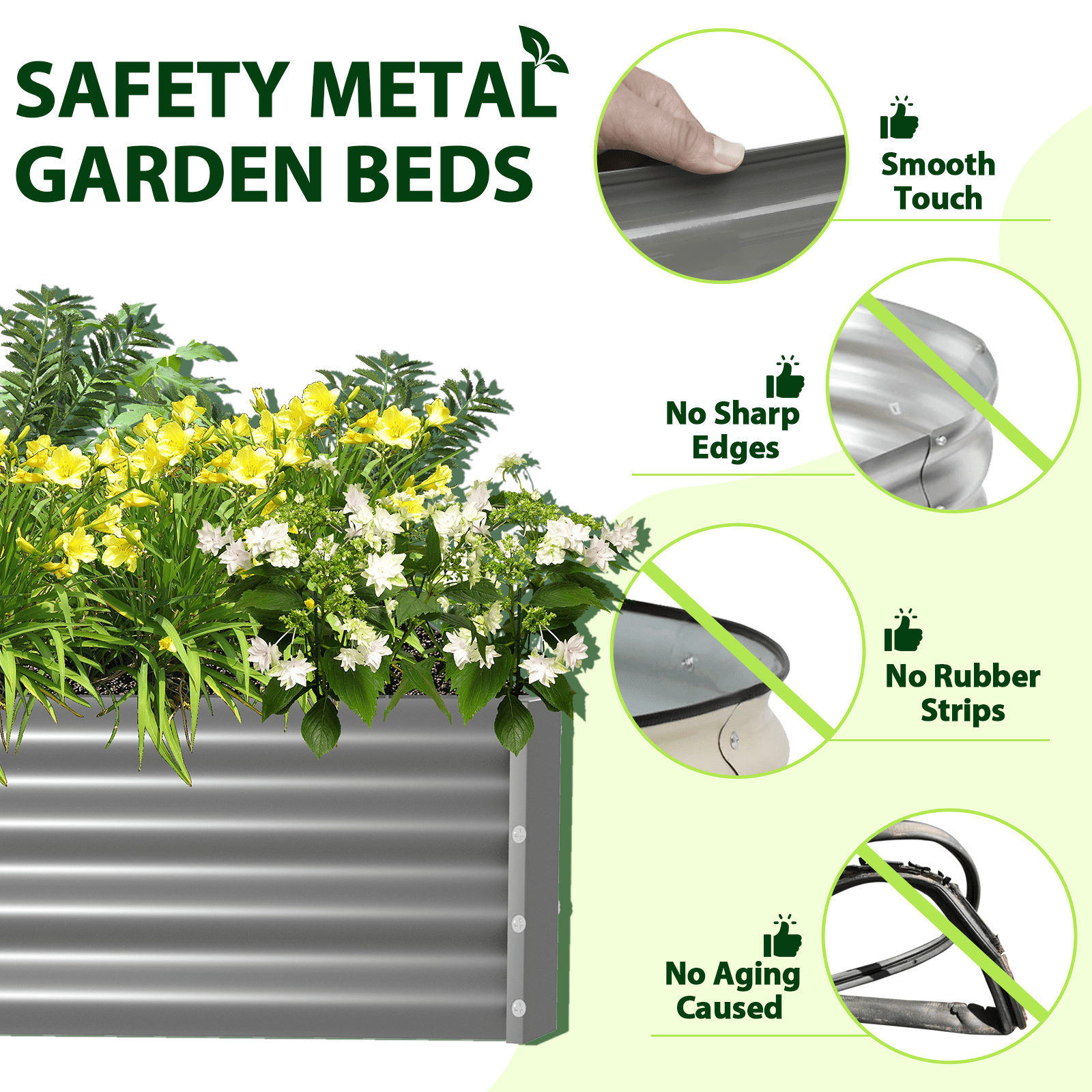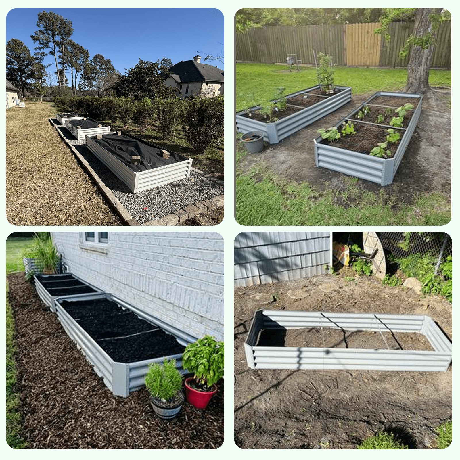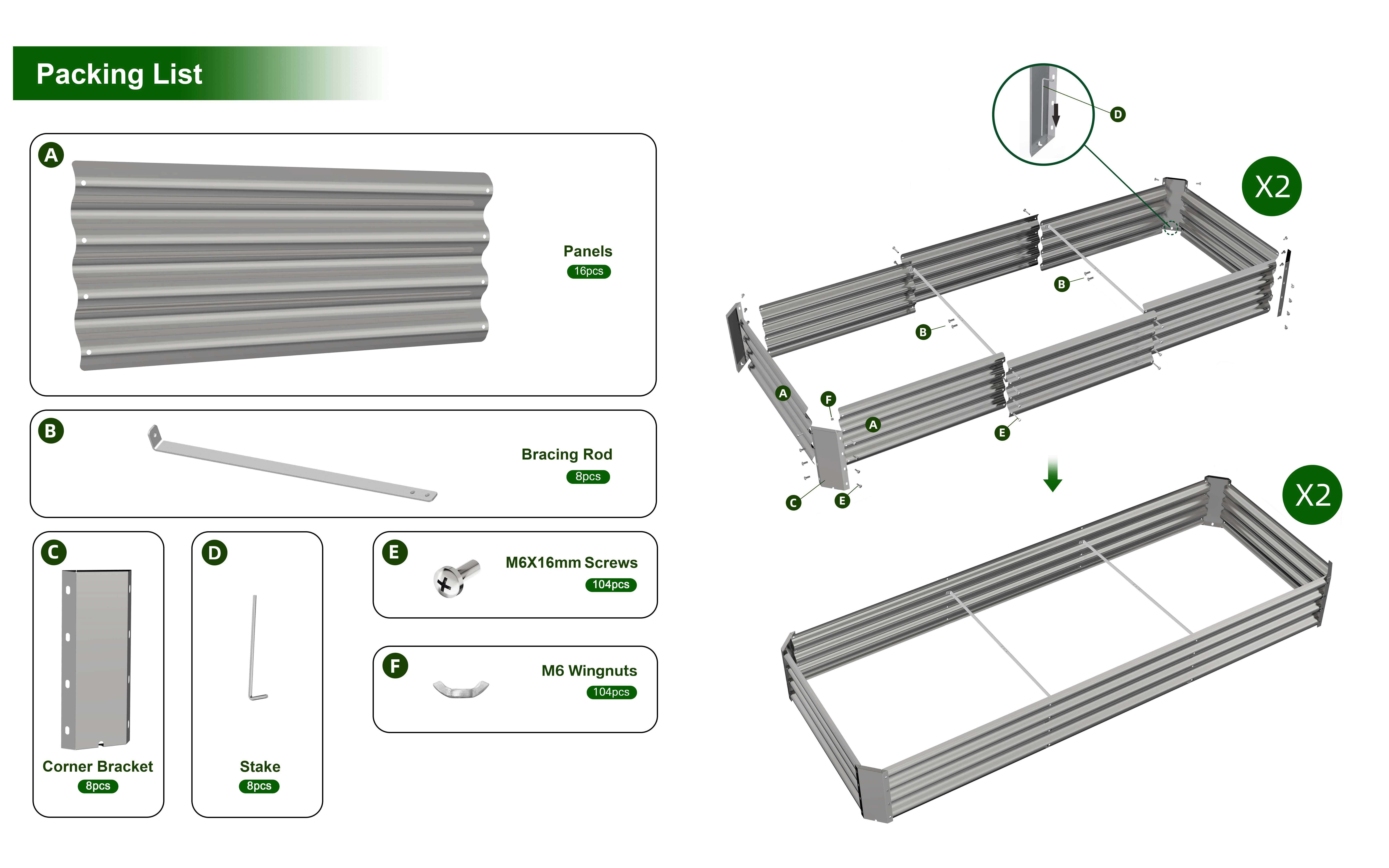 Durable Material and Safe Painting: The metal planter bed is made of weather-proof galvanized sheets with a wave structure that can withstand high pressure without loosening, sturdy enough for long-lasting outdoor use. The powder coating is not only beautiful but also rust-proof and corrosion-proof. More importantly, it is eco-friendly, do not contaminate soil, safe for plants and humans. Package contains 2 x 94.5” (L) x 35” (W) x 12” (H) garden beds, provide extra large growing space to meets your planting needs and the square shape makes the garden more tidy. Sturdy Connection: The corrugated metal planter box has overlapped design for steel plate connection, thicken corner protector, and strengthen nails crossbar offer the inward force to make the structure stable and keep it in good shape, extra 2 metal stakes to ensure the stronger fixation on the ground. Open-bottom Garden Bed: Built with an open base to prevent water buildup and rot, while allowing roots easy access to nutrients which will improve their quality significantly. Easy Assembly: The raised garden bed kit has very simple structure design, which comes with complete screws and pre-drilled holes for quick and effortless installation. All you need to do is connect the metal plates with screws, you can finish the installation in a few minutes