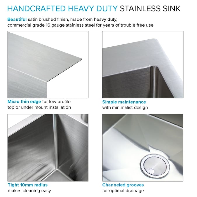 - POWERFUL SINK: 16-gauge stainless steel sink is handmade and features a 10mm radius, pre-drilled faucet hole, and 3mm sound deadening pads