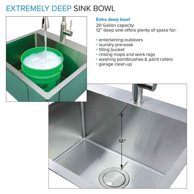 - SPACIOUS BOWL: Sink features a 12-in depth, 20-gallon water capacity, rear set drain, and channeled grooves; perfect for use within a laundry room or garage, as it offers more room inside for a load of laundry, large buckets, or paint pans