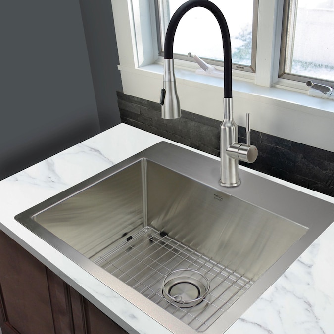 - INCLUDES: Stainless steel dual-mount sink with single hole, flex neck faucet, roll mat, flip-top strainer, installation hardware