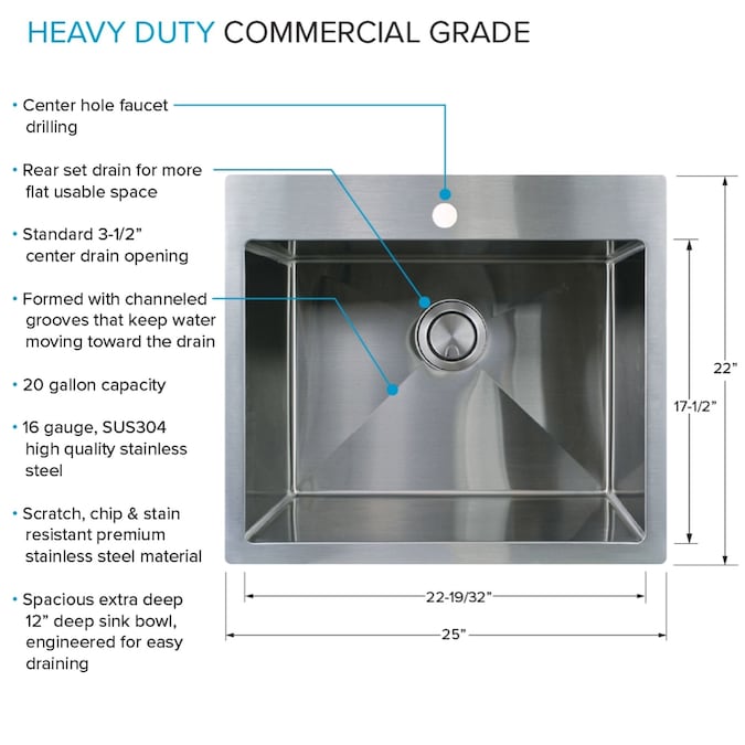 - SINK MEASUREMENTS: Sink measures 22-in front to back (width), 25-in side to side (length), and is 12-in deep with a 20-gallon capacity