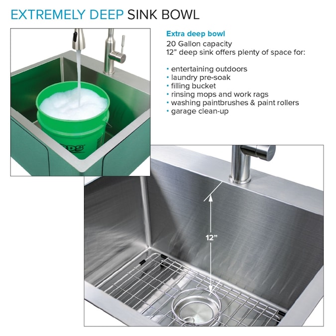 - SPACIOUS BOWL: Sink features a 12-in depth, 20-gallon water capacity, rear set drain, and channeled grooves; perfect for use within a laundry room or garage, as it offers more room inside for a load of laundry, large buckets, or paint pans