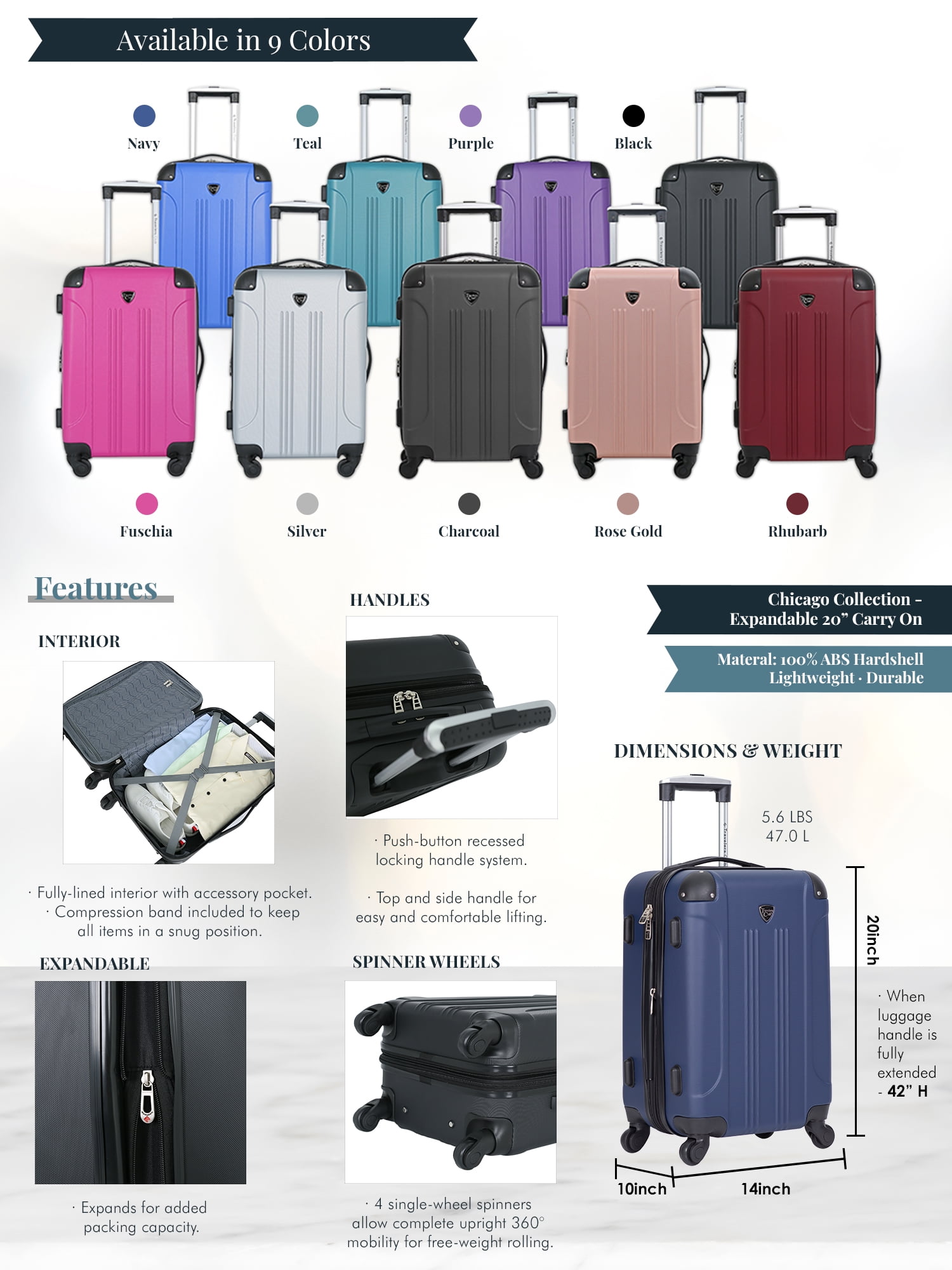 4 spinner wheels Expandable Top and side handle ABS construction Fully lined