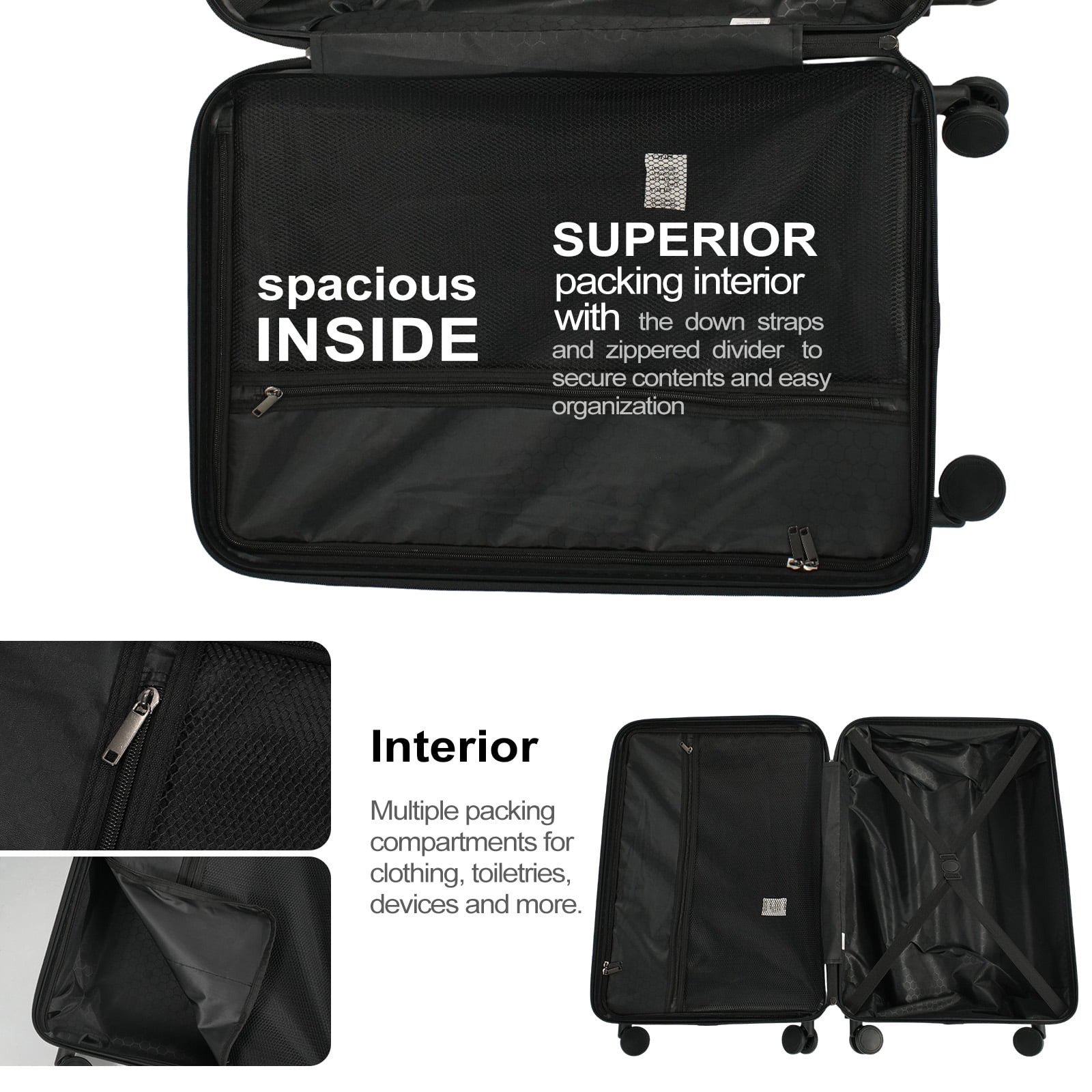 【High Quality Luggage Set】Made of 100% ABS material,this texture is extremely impact-resistant,scratch-resistant,and fairly light in weight, This set weighs only 22.05lb. Best choice for long-term travels and business trips. 【Top material for every part】4x Silent & Smooth Multi-directional Spinner Wheels Can accept a height of 1 meter and a weight of 40kg without breakage;TPR soft handle with straight handle makes you more comfortable when you need to carry; Aluminum pull rod can be adjusted for three lengths. 【Elegant + Practical Design】Features textured finish to prevent against scratches, keeping cases beautiful after a trip; Combination lock +TSA customs lock, better protection of luggage security. The business card is on the outside of the case. You can even hang the Handle Bag on the 4 placement feet. 【Organized & Secure Interior】Interior mesh zip pocket and elasticated,Squared full-capacity design, Capacity : 20in38L 24in63L 28in 93L 【Warranty】Two Years Warranty. Product incloud: 20in(Comply with carry-on size restrictions for domestic travel); 24&28in suitcase (provide more space).