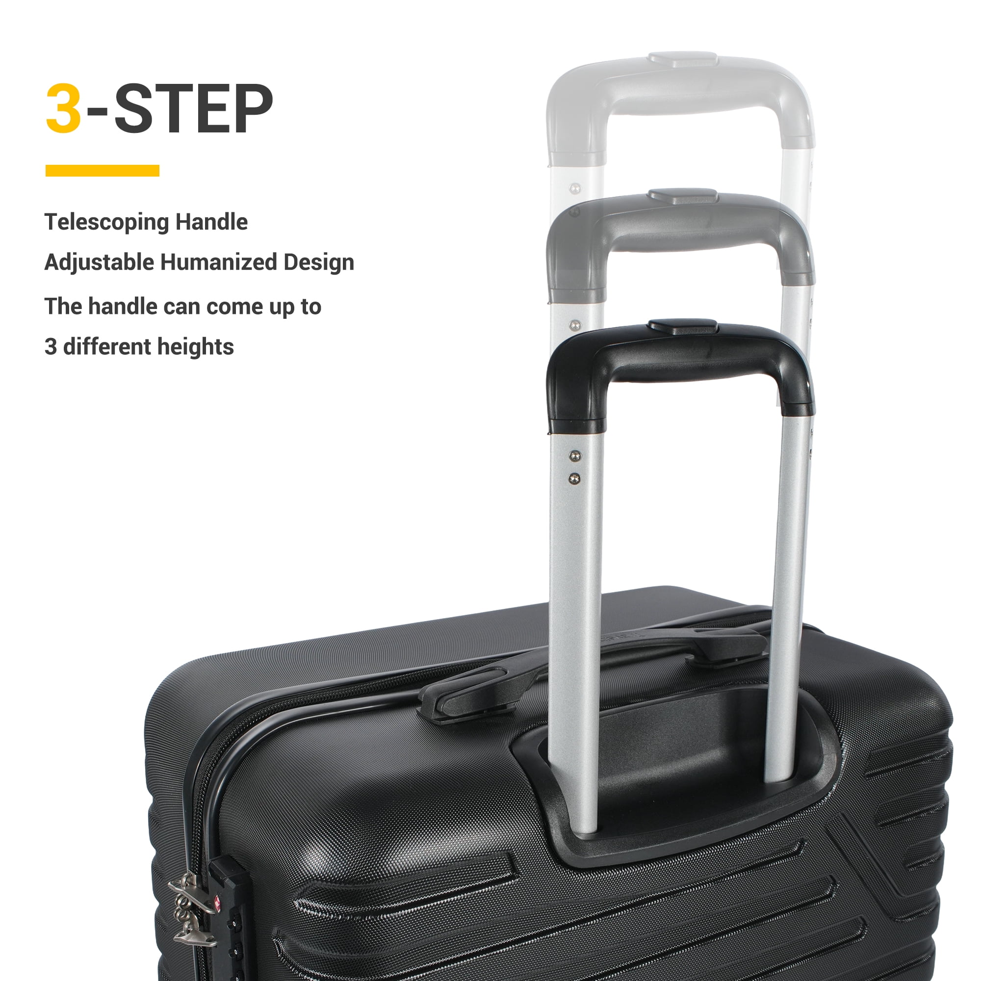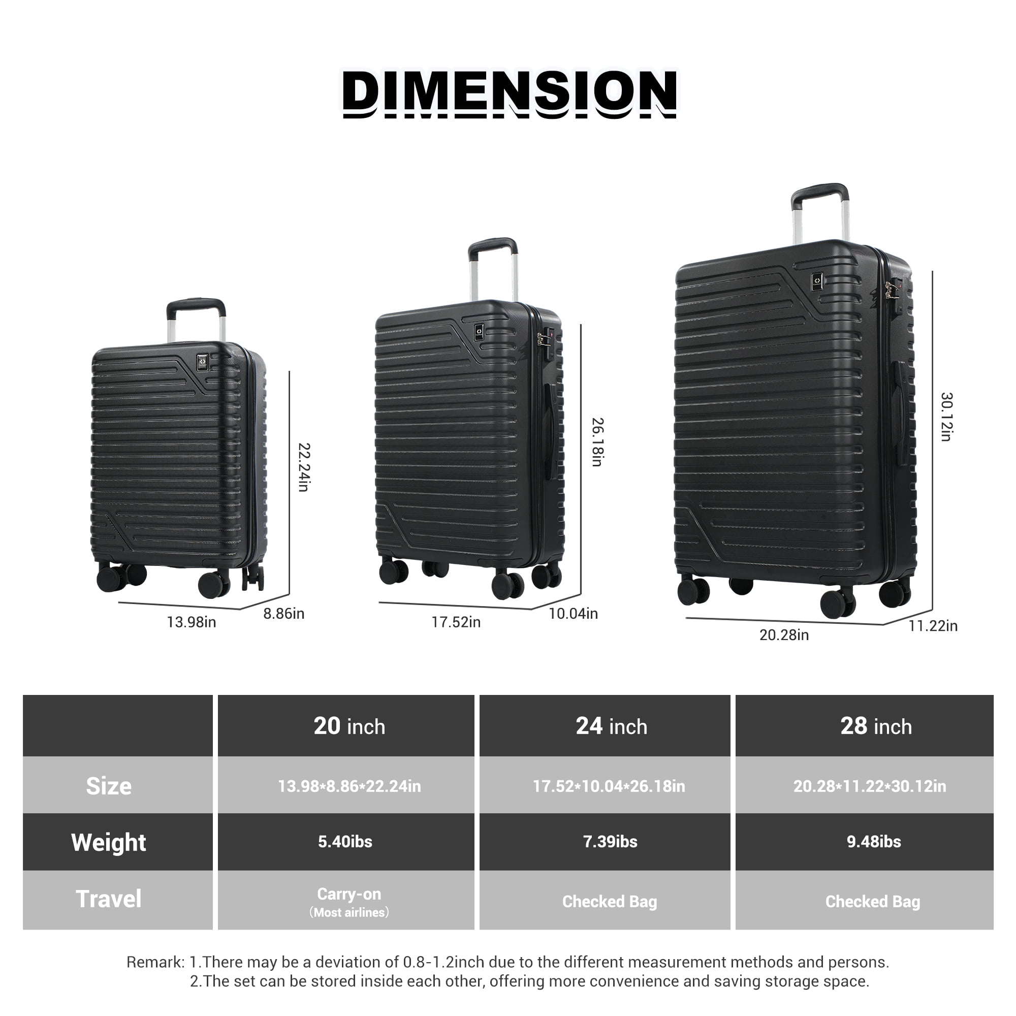 【High Quality Luggage Set】Made of 100% ABS material,this texture is extremely impact-resistant,scratch-resistant,and fairly light in weight, This set weighs only 27.56lb. Best choice for long-term travels and business trips. 【Top material for every part】4x Silent & Smooth Multi-directional Spinner Wheels Can accept a height of 1 meter and a weight of 40kg without breakage;TPR soft handle with straight handle makes you more comfortable when you need to carry; Aluminum pull rod can be adjusted for three lengths. 【Elegant + Practical Design】Features textured finish to prevent against scratches, keeping cases beautiful after a trip; Combination lock +TSA customs lock, better protection of luggage security. The business card is on the outside of the case. You can even hang the Handle Bag on the 4 placement feet. 【Organized & Secure Interior】Interior mesh zip pocket and elasticated,Squared full-capacity design, Capacity : 20in38L 24in63L 28in 93L Warranty:One Years Warranty. Product incloud: 20in(Comply with carry-on size restrictions for domestic travel); 24&28in suitcase (provide more space).