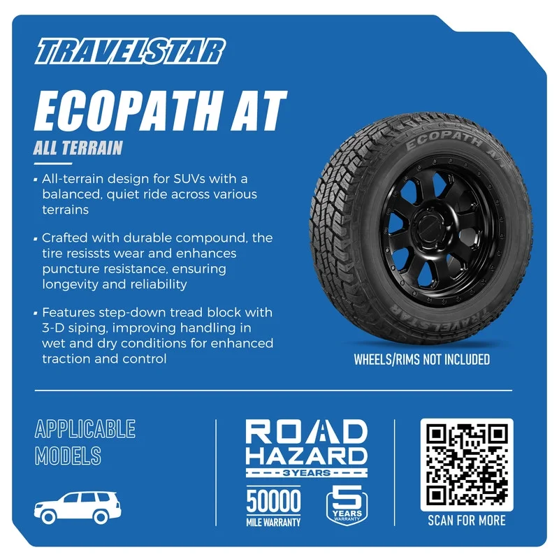 Travelstar Ecopath AT All Season 235/75R15 235/75/15 Load Range XL 109S All Terrain SUV Tire 50000 Manufacturer Tread Wear Out Warranty. Road Hazard Warranty. All-terrain design for trucks/SUVs with a balanced, quiet ride across various terrains. Durable compound for tire resissts wear and enhances puncture resistance. Features step-down tread block with 3-D siping, enhanced traction and control. OVERVIEW TRAVELSTAR offers a broad line of passenger, UHP, CUV, SUV, light truck, and specialty trailer tires. Designed, engineered, manufactured, and tested using some of the world’s leading facilities, TRAVELSTAR delivers the performance and quality you can trust.