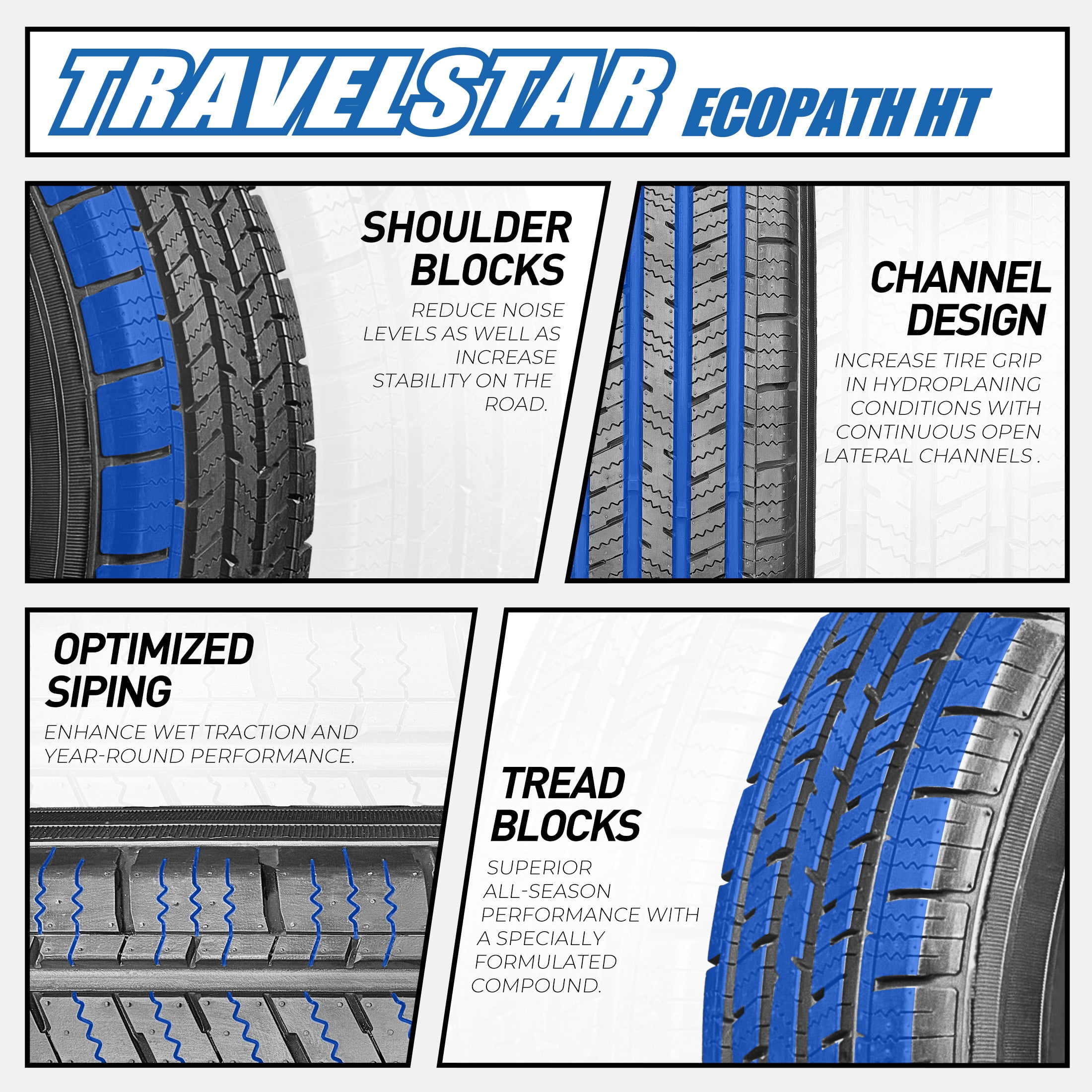 Travelstar EcoPath H/T 245/70R17 110T High Performance All Season Passenger Tire 245/70/17(Tire Only) Features And Benefits Road Hazard Warranty Manufacturer Tread Wear Out Warranty All terrain traction Low on-road road noise Durable controllability Self-cleaning tread design OVERVIEW The Travelstar EcoPath H/T is an ultra-high performance all-season tire that offers high-speed performance,cornering,and braking.It offering a premium quality tire at an economical price point.An aggressive tread pattern can deliver a perfect balance between ultra-high-performance and everyday comfort. Addition, our tire product comes with a Road Hazard Warranty, and here’s how it benefits you: This warranty provides you with protection against unforeseen road circumstances such as punctures, cuts, or other damages. If your tire gets damaged due to road conditions while driving, our warranty offers support and assistance without any additional expenses on your part.Purchasing our tire product grants you this reassuring Road Hazard Warranty, adding an extra layer of safety to your driving experience!