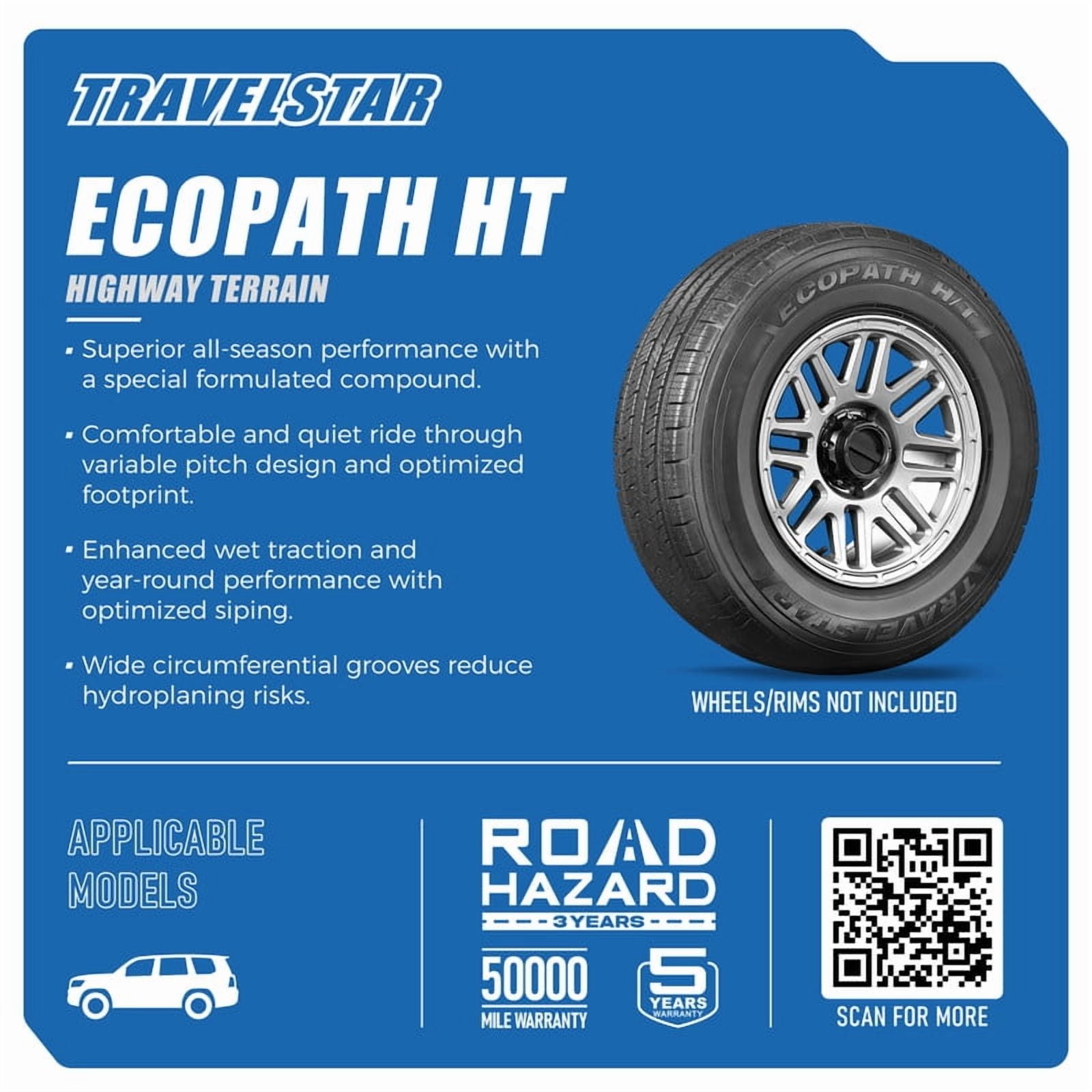 Travelstar EcoPath H/T 265/70R16 112T High Performance All Season Passenger Tire 265/70/16(Tire Only) Features And Benefits Road Hazard Warranty Manufacturer Tread Wear Out Warranty All terrain traction Low on-road road noise Durable controllability Self-cleaning tread design OVERVIEW The Travelstar EcoPath H/T is an ultra-high performance all-season tire that offers high-speed performance,cornering,and braking.It offering a premium quality tire at an economical price point.An aggressive tread pattern can deliver a perfect balance between ultra-high-performance and everyday comfort. Addition, our tire product comes with a Road Hazard Warranty, and here’s how it benefits you: This warranty provides you with protection against unforeseen road circumstances such as punctures, cuts, or other damages. If your tire gets damaged due to road conditions while driving, our warranty offers support and assistance without any additional expenses on your part.Purchasing our tire product grants you this reassuring Road Hazard Warranty, adding an extra layer of safety to your driving experience!