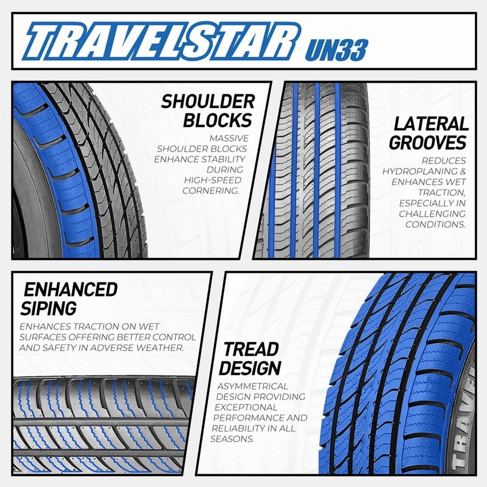 Travelstar UN33 235/55R18 100V High Performance All Season Passenger Tire 235/55/18(Tire Only) Features And Benefits Road Hazard Warranty Manufacturer Tread Wear Out Warranty All terrain traction Low on-road road noise Durable controllability Self-cleaning tread design OVERVIEW The Travelstar UN33 is an ultra-high performance all-season tire that offers high-speed performance,cornering,and braking.It offering a premium quality tire at an economical price point.An aggressive tread pattern can deliver a perfect balance between ultra-high-performance and everyday comfort. Addition, our tire product comes with a Road Hazard Warranty, and here’s how it benefits you: This warranty provides you with protection against unforeseen road circumstances such as punctures, cuts, or other damages. If your tire gets damaged due to road conditions while driving, our warranty offers support and assistance without any additional expenses on your part.Purchasing our tire product grants you this reassuring Road Hazard Warranty, adding an extra layer of safety to your driving experience!